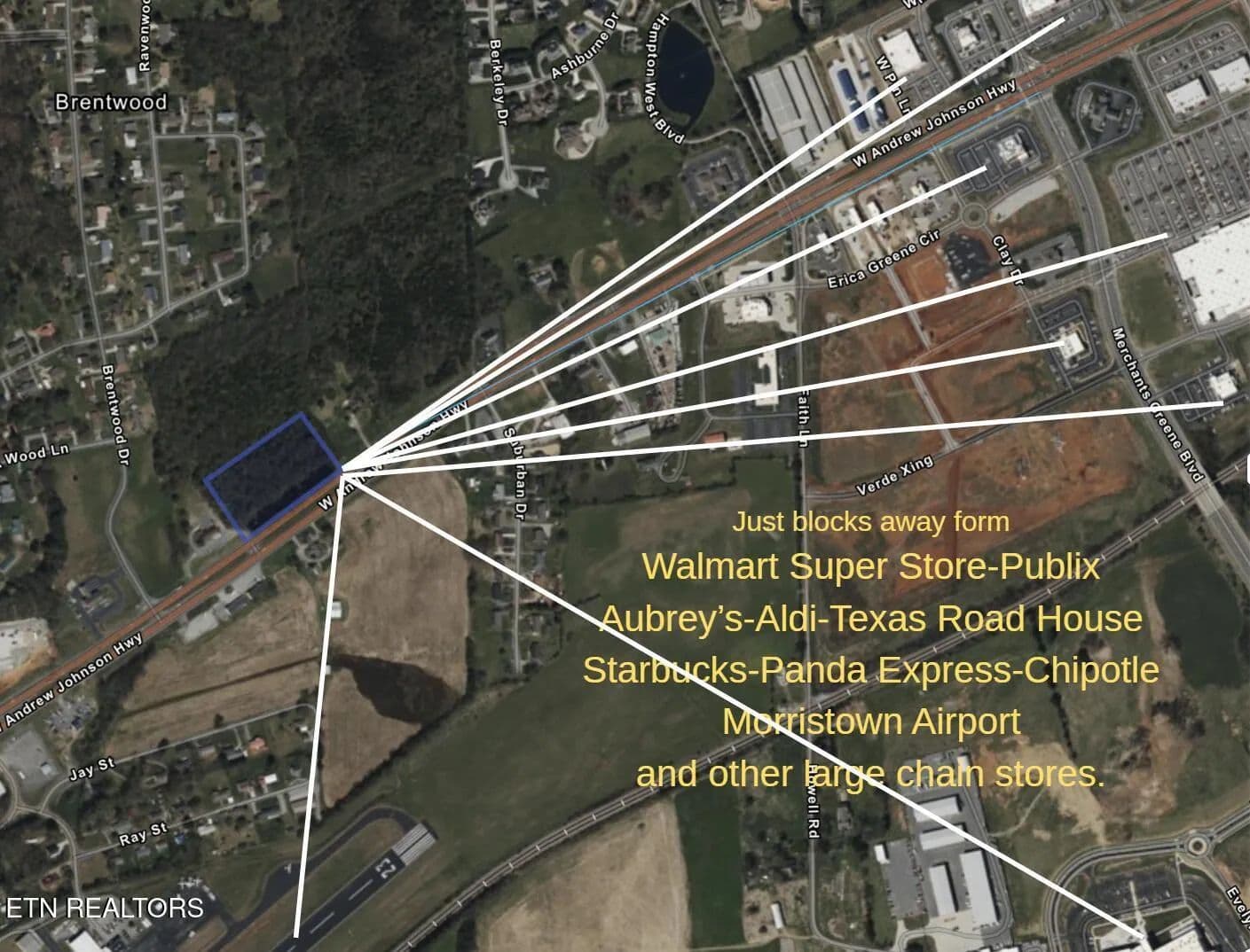 10 acres of Commercial Land with over 750 feet of road frontage on Andrew Johnson Hwy in Morristown. All Utilities are at the front property including Water and Sewer. Seller is willing to discuss the possibility of splitting the acreage to allow more than one business and the seller is also willing to discuss a long-term ground lease. The land was just cleared of trees, and it is located right in the heart of one of the fastest growing commercial areas in East Tennessee. Perfect for National Chain Restaurants, Car Dealerships, Office Building and more. This property is just down the street from Walmart Super Center, Aubrey's, Starbucks, Freddy's, Good Ole' Days and Texas Roadhouse just to name a few. More pictures and updated Information about the area will be added to the listing information very soon.