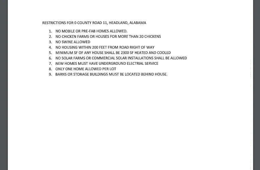 Beautiful land on County Road 11 in Headland. Perfect spot to build your dream house on. Wooded lot- will need clearing if using for homesite. Stream runs through back of property. See photos for restrictions