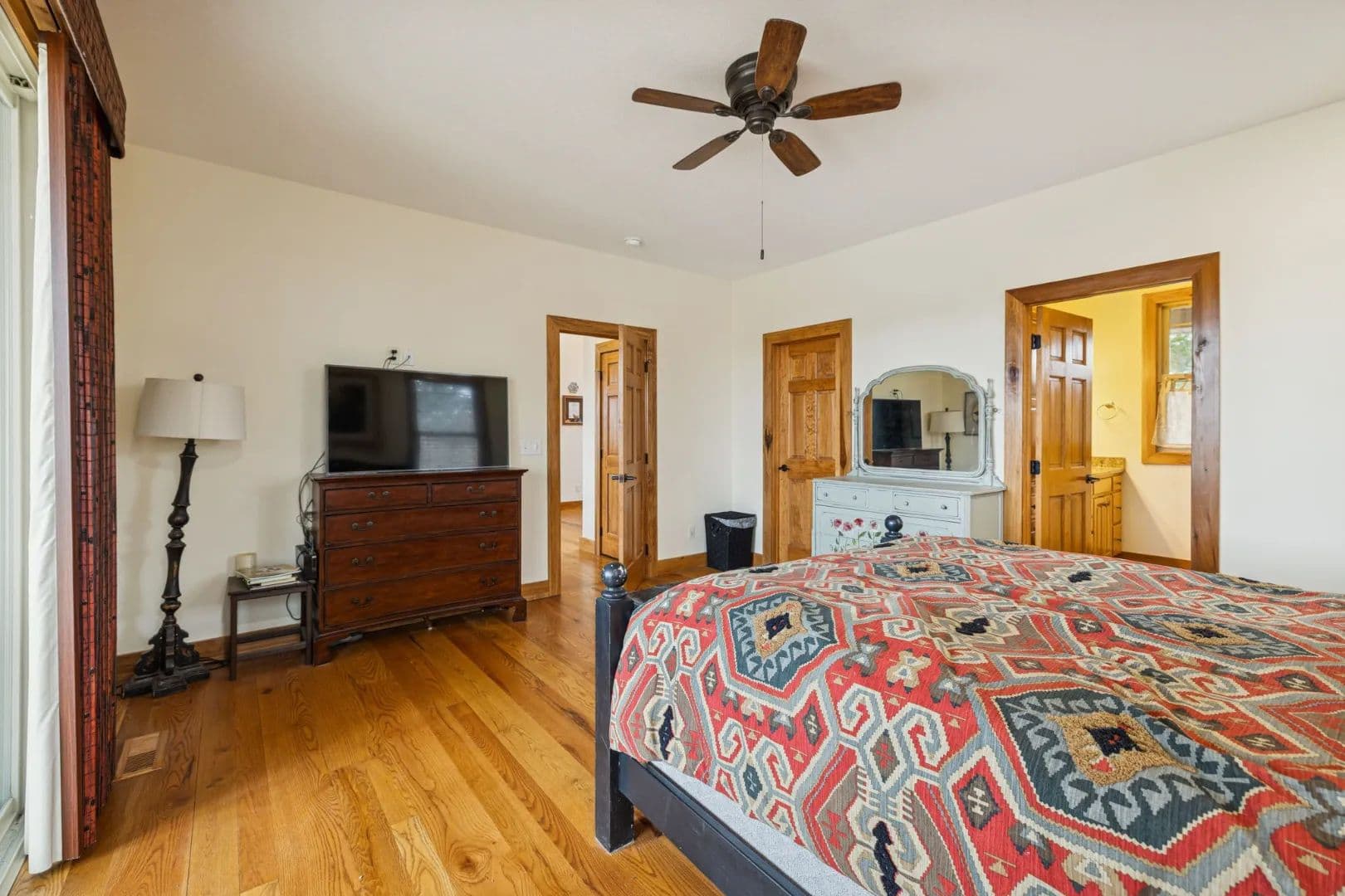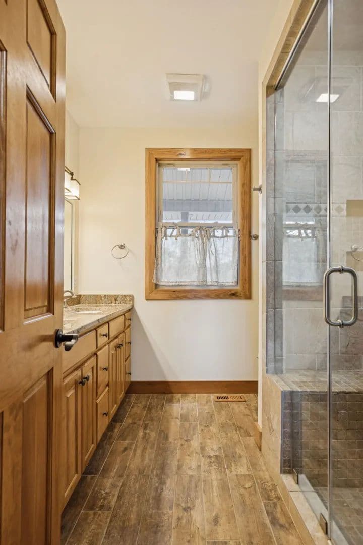 The main-level master suite offers breathtaking lake views, a large walk-in closet, and a luxurious en-suite bath featuring a walk-in tiled steam shower. Upstairs, a generous sitting area anchors the second floor, accompanied by two additional bedrooms and a full bath—each capturing views of the lake.