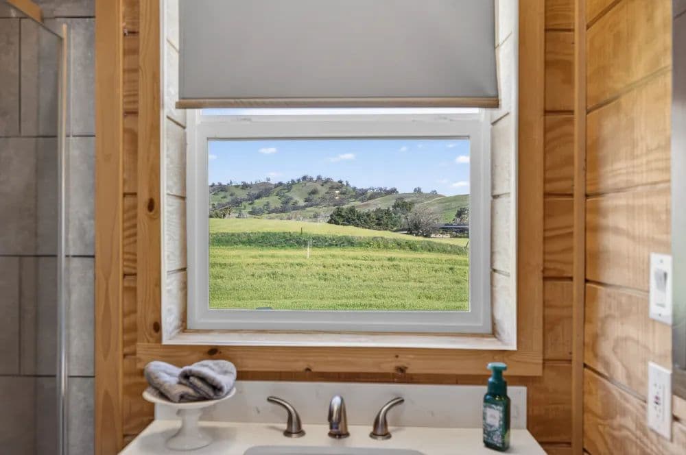 The first impression is the landscape. More than 200 established rose plants surround the home, creating color and fragrance through much of the year. Mature landscaping frames the residence and softens the transition between indoor living and wide open land. During the rainy season the surrounding hills turn a deep green, then shift to warm gold through summer. Seasonal wildflowers appear throughout the year and nearby almond orchards contribute to the quiet agricultural atmosphere that defines Capay Valley living.