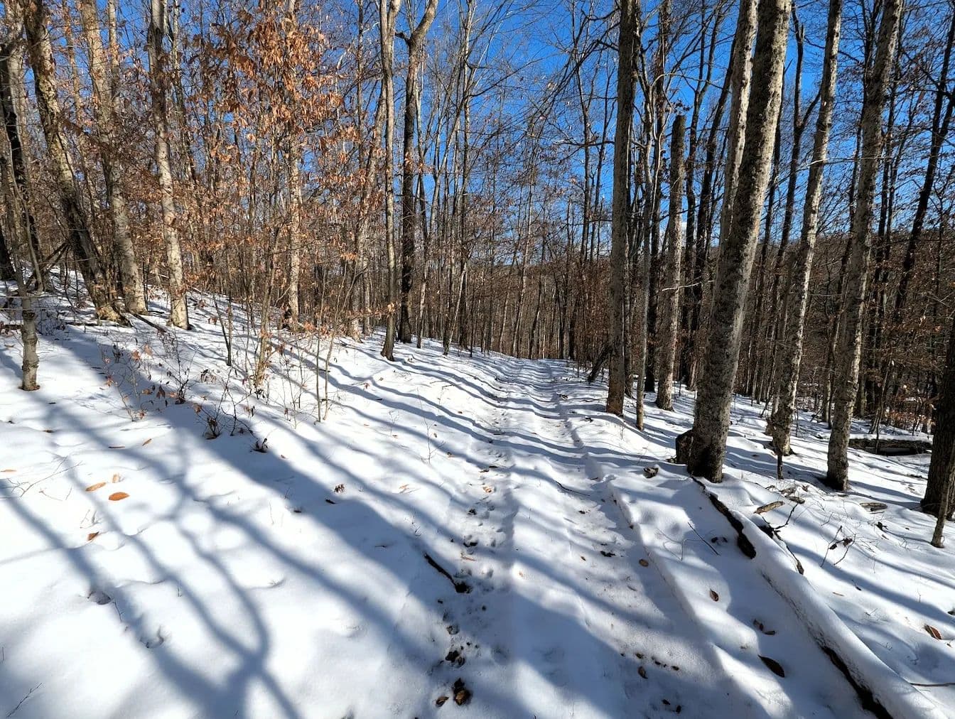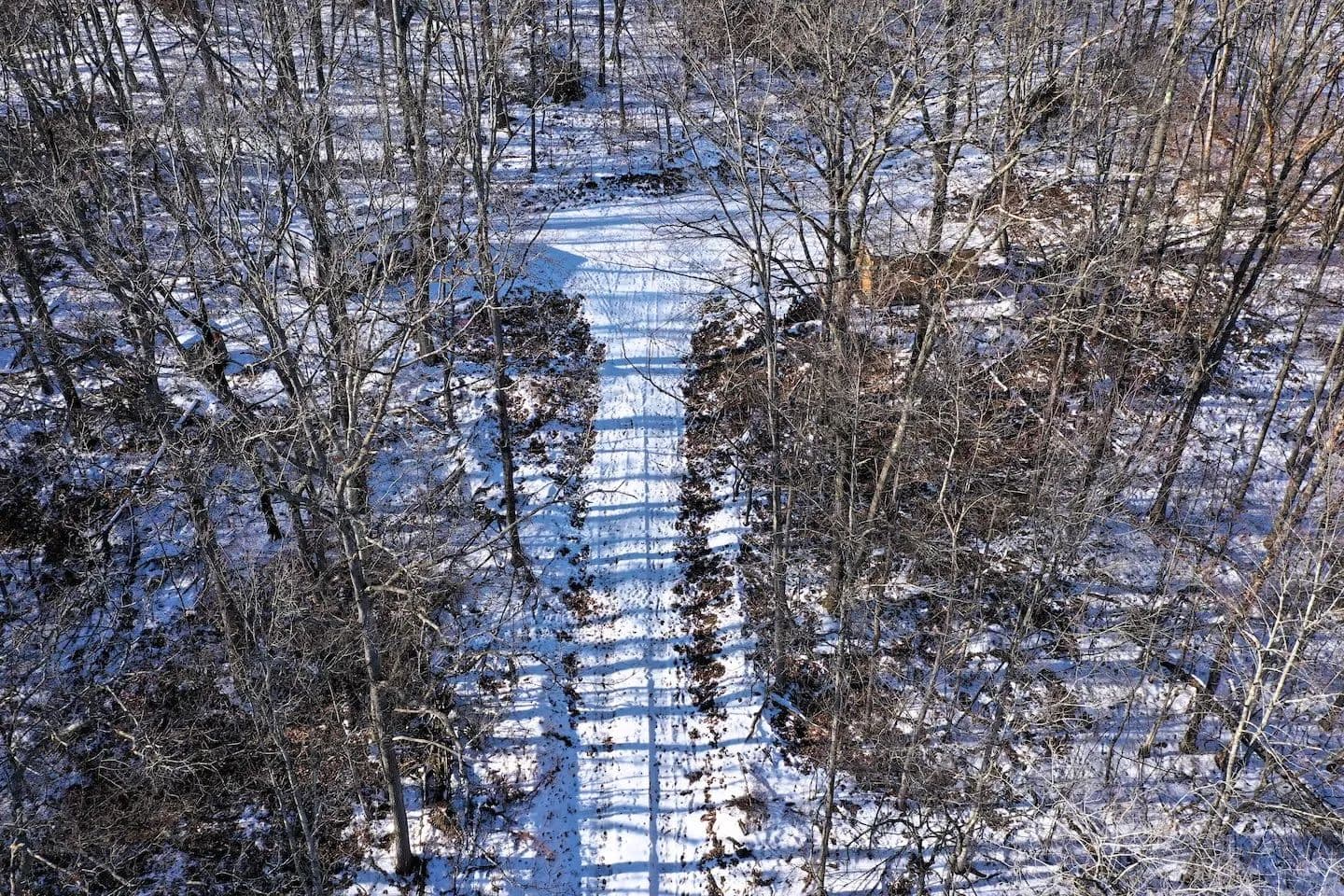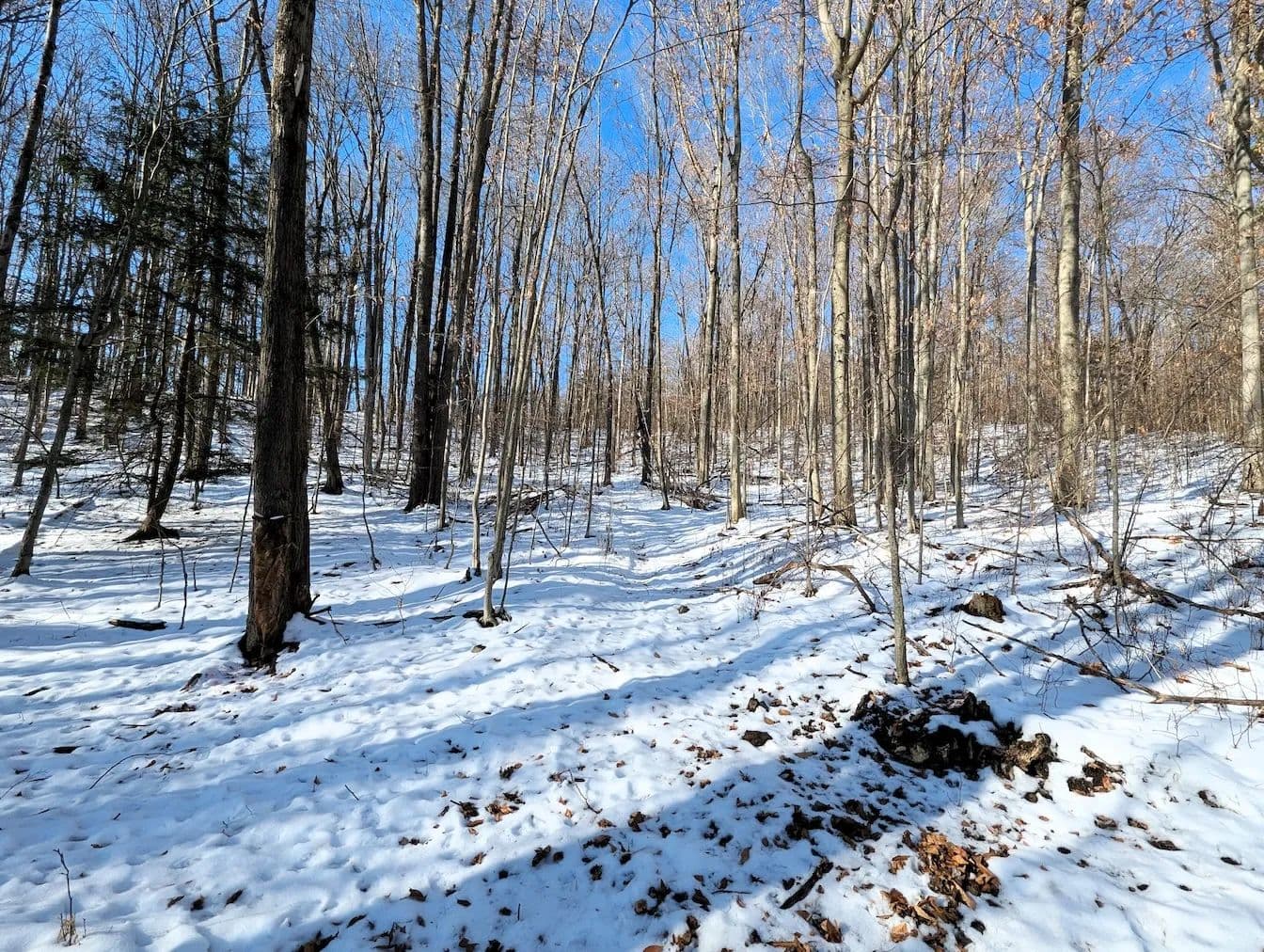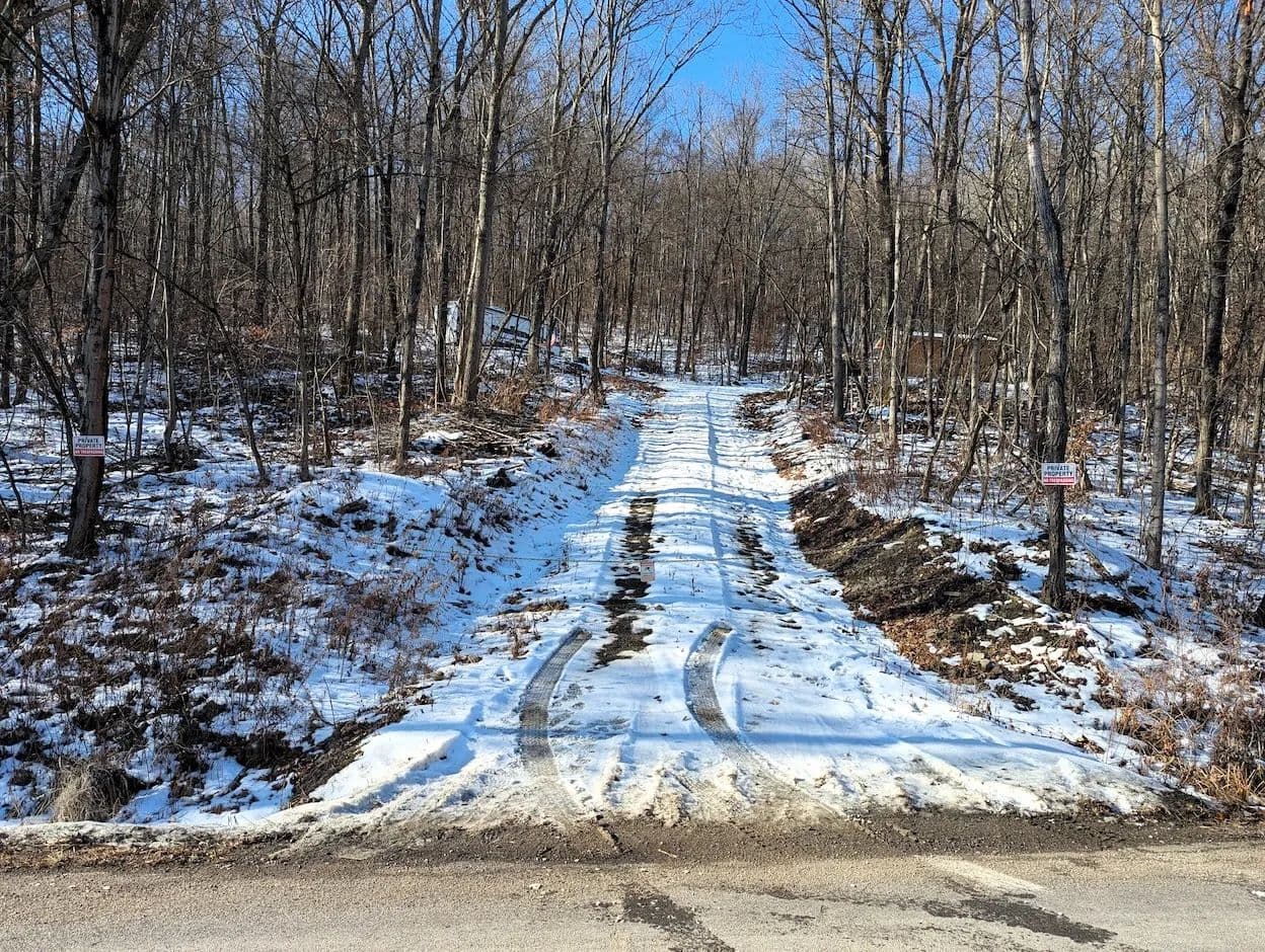 The land slopes gently from the road toward the back of the property where it borders an adjacent farm field. Well-established trails wind through the woods showcasing a healthy mix of oak, maple, and beech, and providing easy access for hiking, hunting, and recreation.