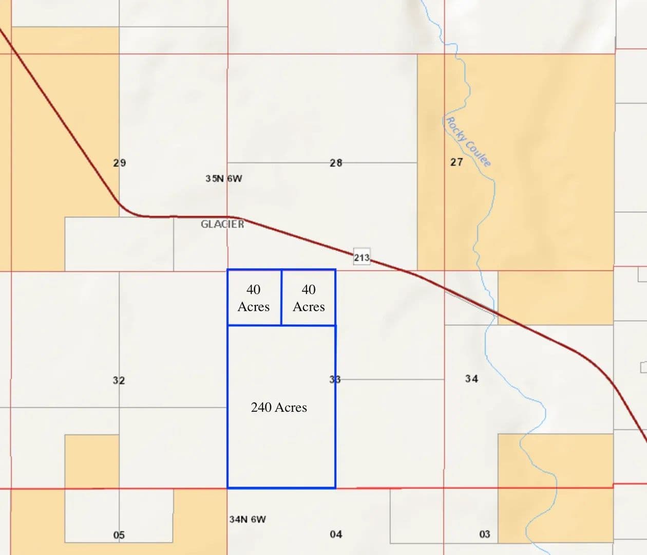 This 320-acre expanse of fallow land is located conveniently just off Hwy 213 N in Glacier County and split into 3 continuous legal parcels. There is currently a land lease in place through December 31st, 2024. Two additional tracts of land are also being sold with MLS#30015315 (274 Acres located just across Hwy 213) and MLS#30015337 (920 Acres). Call Shannon Herrmann 406-609-8996, Ryan Ross 406-871-6930, or your Real Estate Professional.