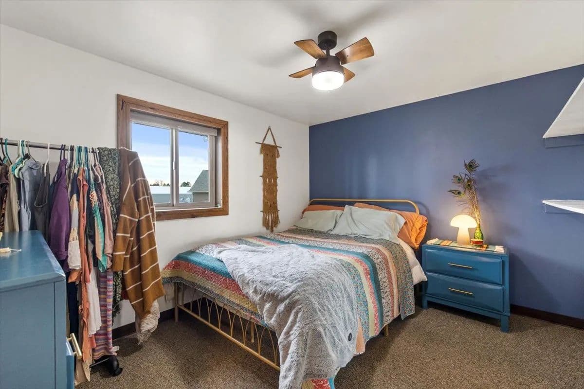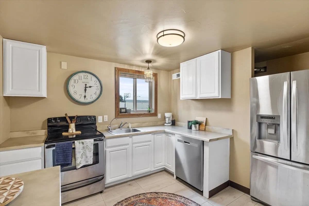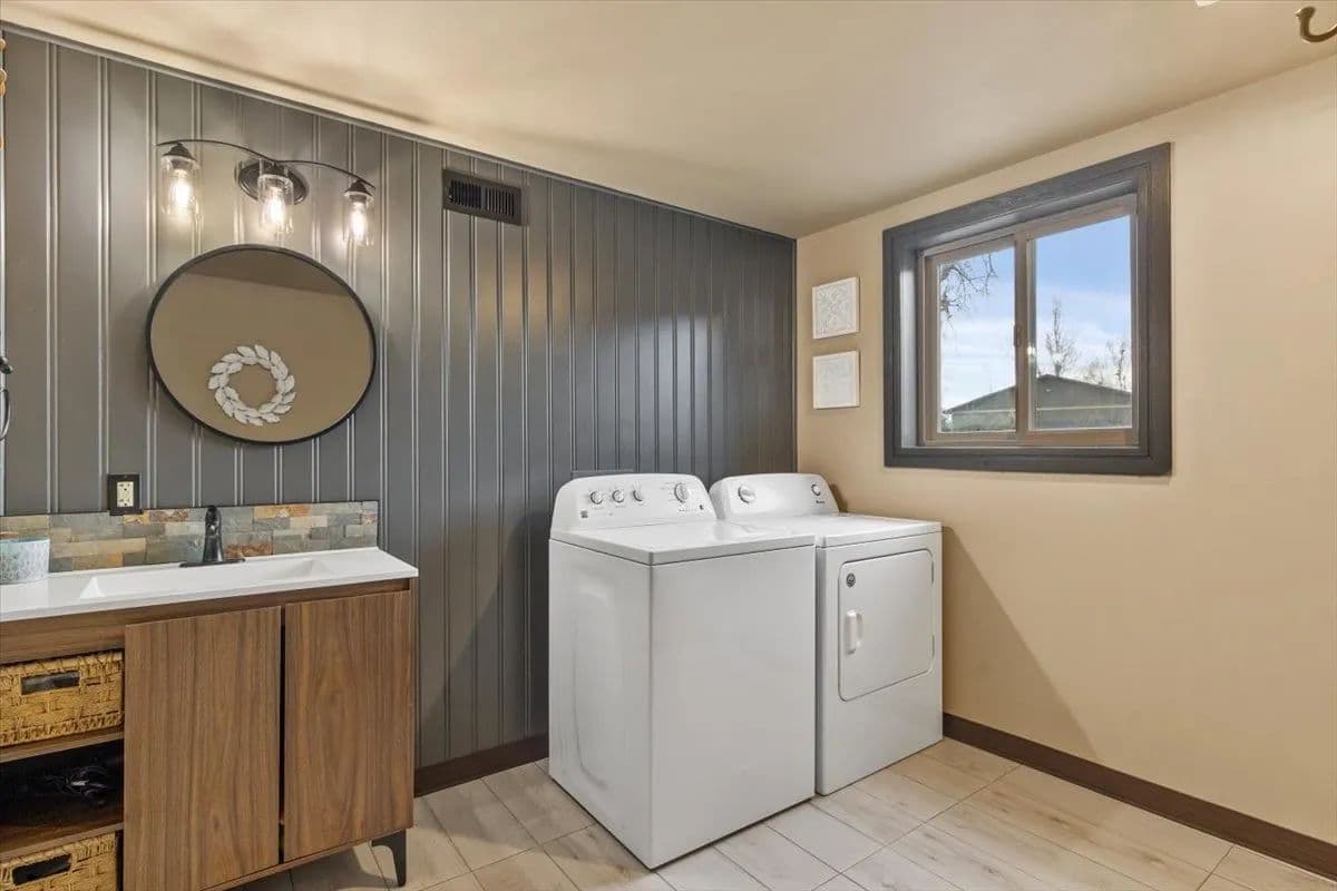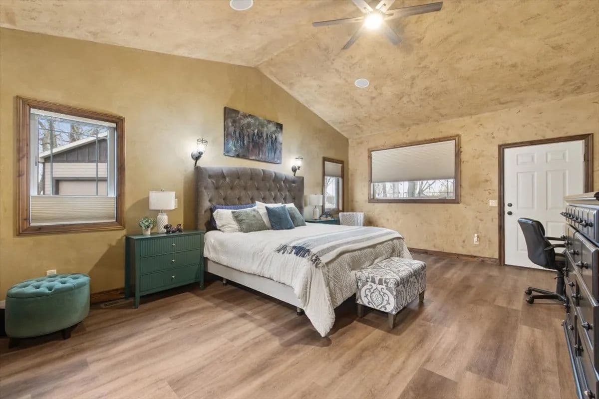 The main level features three bedrooms and 2.5 baths, including a spacious primary suite with a large spa-like bath, walk-in shower, and his-and-her closets. Artwork in the primary bedroom is by local artist Ruby Hahn. The kitchen is both functional and striking with hickory cabinetry, stainless steel appliances, a gas range, and generous space designed for gathering. Custom design walls throughout the home reflect craftsmanship and attention to detail, while a central vacuum system adds everyday convenience.