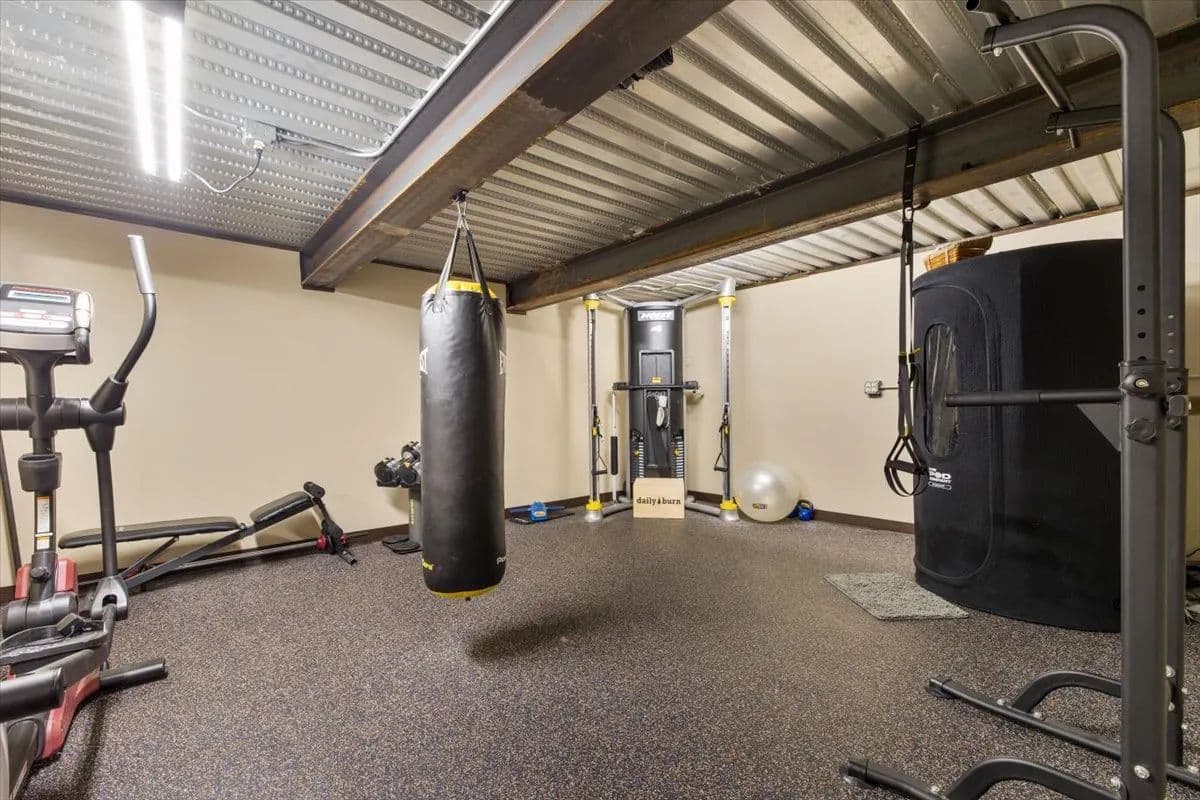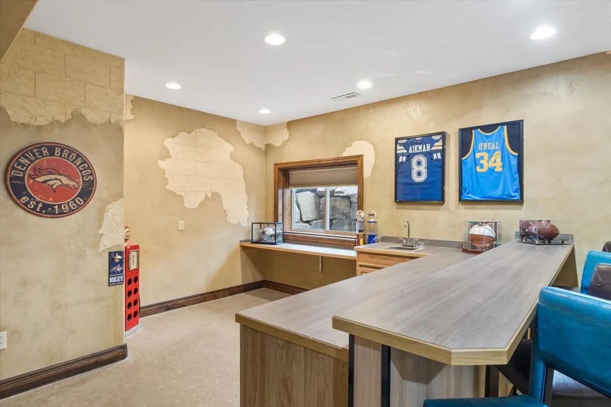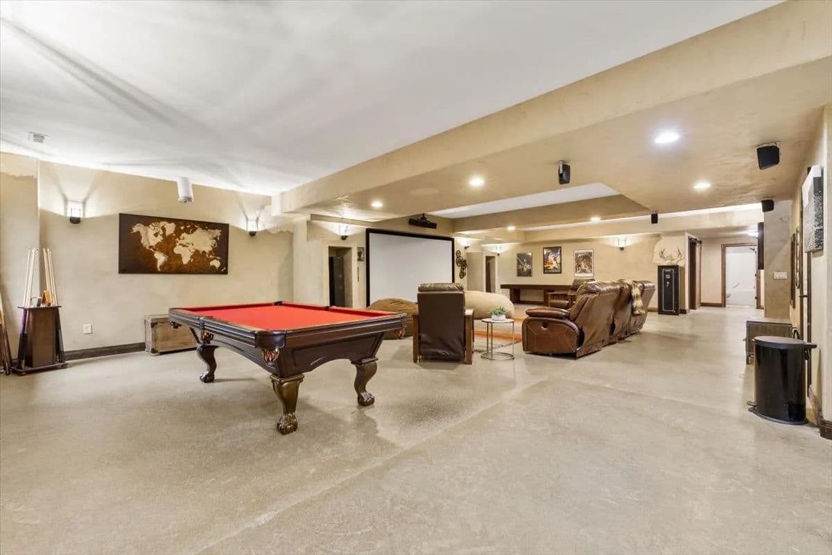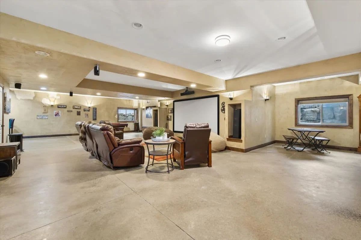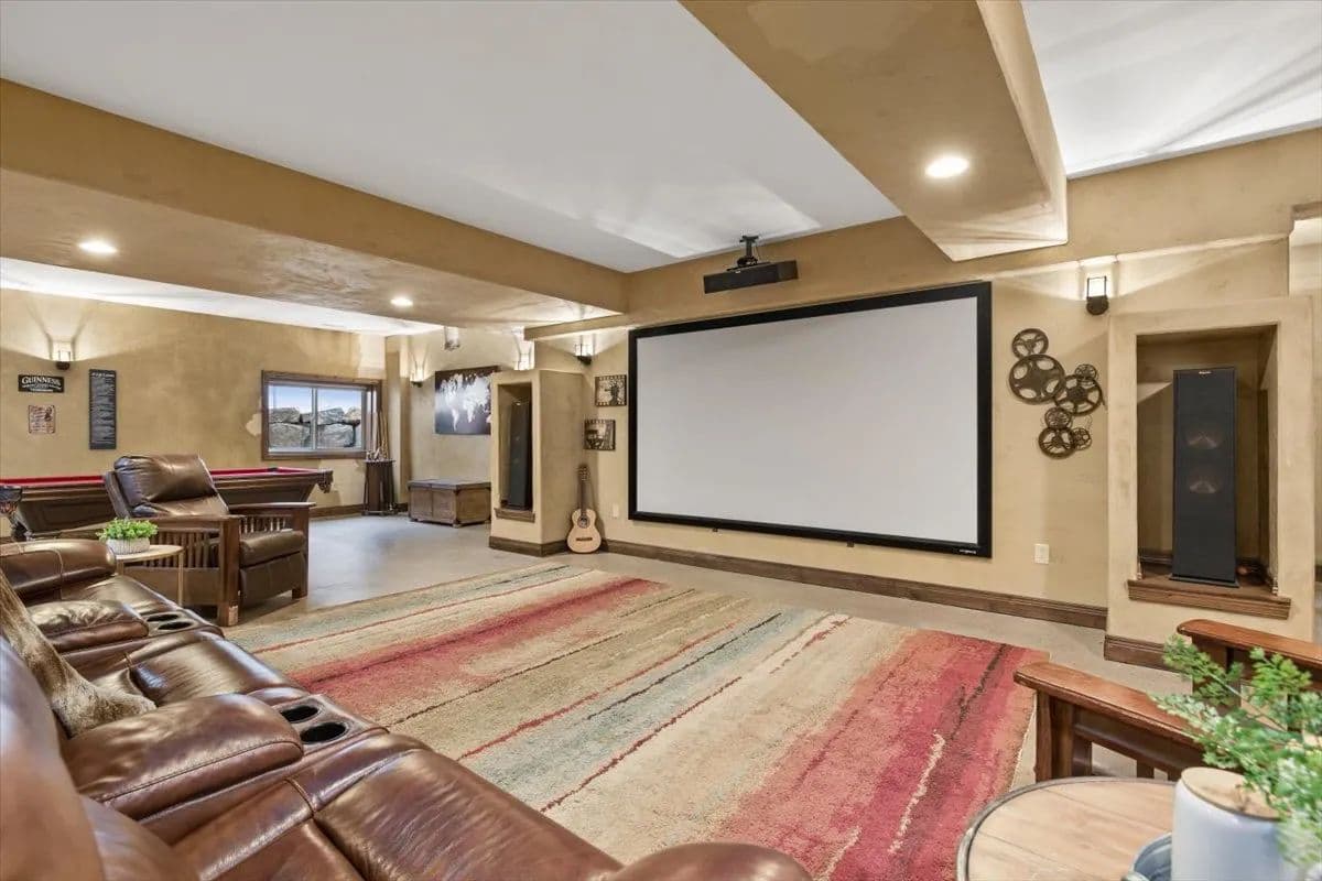 The lower level is designed for entertainment and relaxation, offering two additional bedrooms and a full bath, a weight room, hobby room, along with an impressive theater room and bar area. A large screen and sound system create the ultimate movie-night experience, with ample room for hosting family and friends.