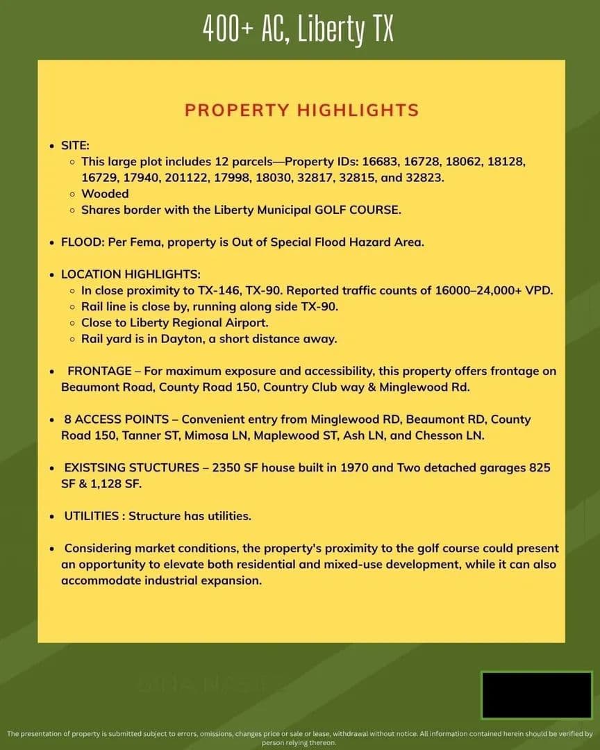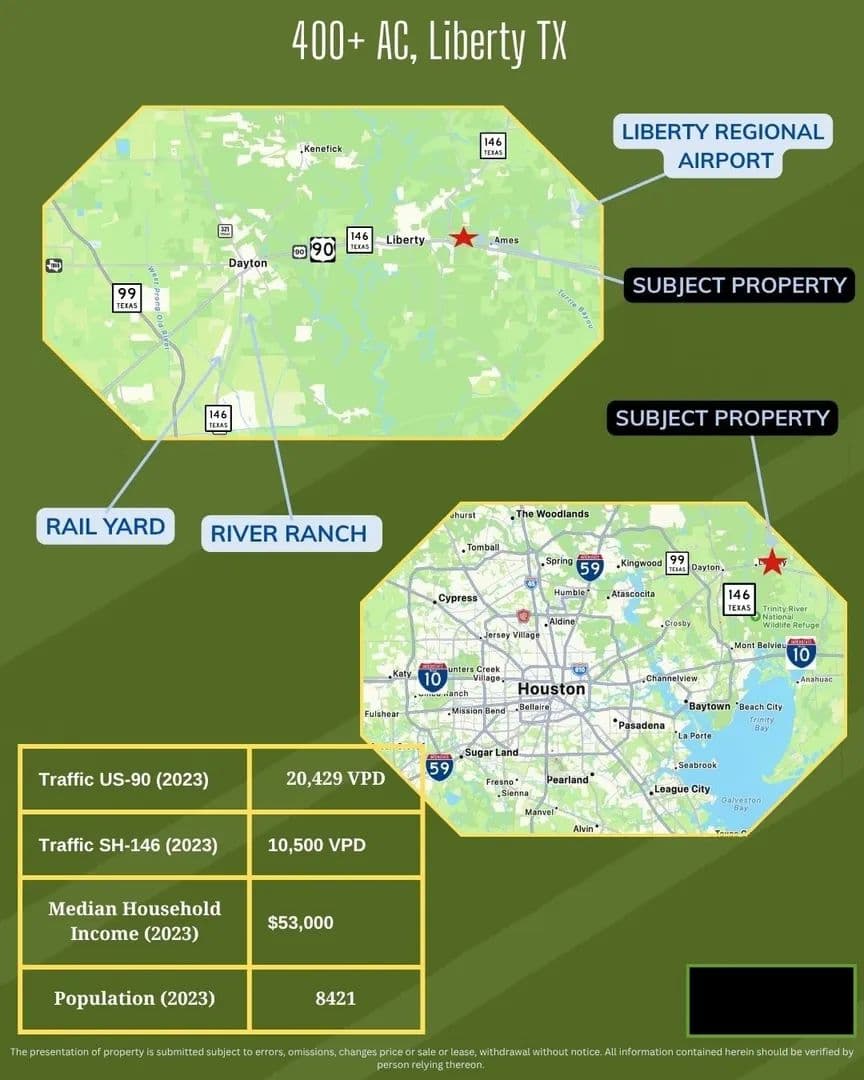 Located in rapidly growing Liberty county in southeast Texas. Discover an opportunity nestled adjacent to the Liberty City Golf Course, where 420+ acres of prime land await your vision. Located within city limits and situated outside the Special Flood Hazard Area, per Fema. Strategically positioned near TX-146 and TX-90, the property benefits from high visibility. A rail line runs parallel to TX-90, providing convenient access to freight transport, while the Liberty Regional Airport and the rail yard in Dayton—just a short drive away—further enhance the site’s logistical advantages. This expansive parcel offers the canvas for a variety of developments.