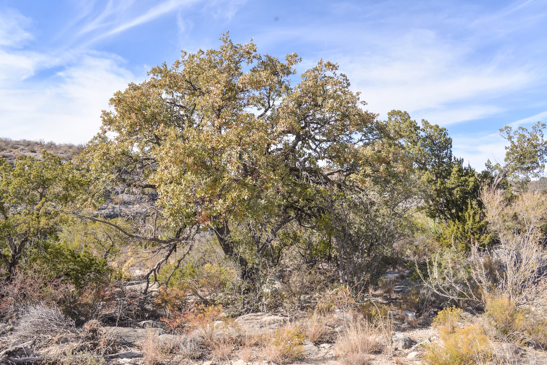 DESCRIPTION: Along Outlaw Canyon, there is an occasional grove of Graves Oaks can can be found as well as Blue Oaks and straggling Red Berry Juniper. Associated with the oaks are different kinds of desert short grasses including the most palatable Grama grasses-Blue Grama, Black Grama, and Hairy Drama along with several species of 3 Awns Grass and Tobosa Grass.