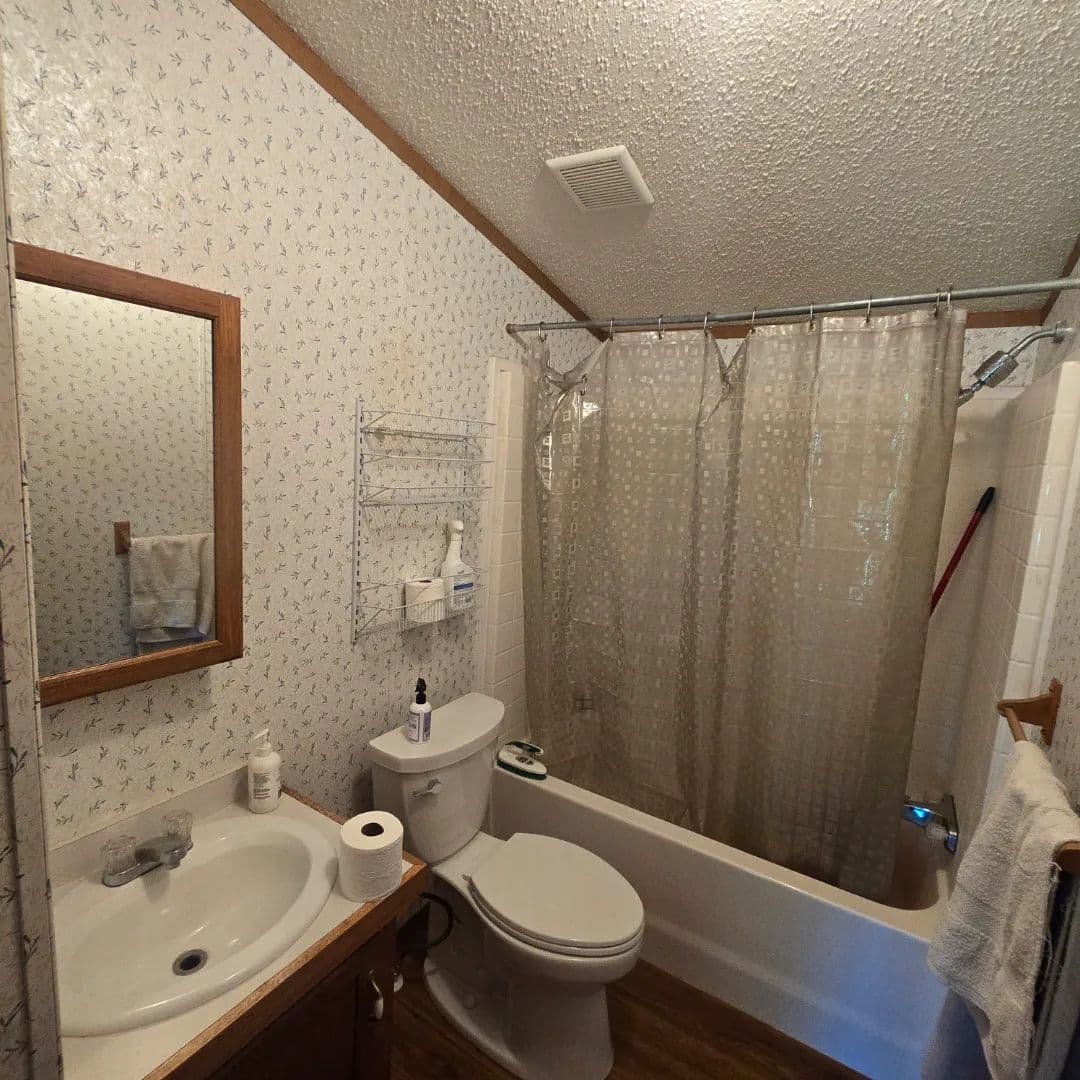 The welcoming entry opens into a generously sized kitchen, ideal for hosting gatherings, and includes a supplemental wood stove. The center of the home features a large living room complete with a fireplace. Very similar to the “Key Hole” field halfway back in the woods also made for mingling. Sorry I got off track there. The residence comprises a master bedroom with an en-suite bath, and two additional bedrooms sharing a second full bathroom, providing ample personal space within its 1,334 sq ft floor plan.