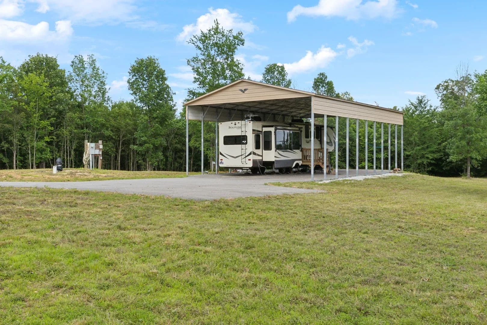 Amp Electric and RV hookups. High Speed Fiber internet in place. Gated entrance leads to paved driveway and onto a concrete pad with an incredible RV Metal Cover that measures 30'W X 50'L X 16'H and the side legs are doubled. The cover is pinned and anchored with Mobile Home Anchors. (Trailer is Not included) Gated community adds to the privacy and seclusion. Deer and Wild Turkeys are plentiful and you are only a couple of minutes to Kentucky Lake and Turkey Creek Marina and Mason's Boat Dock. Trails have been cut throughout the property. Many level homesites available to build your dream property. The sky is the limit or do absolutely nothing and have an amazing getaway. Phenomenal views and an abundance of wildlife. All of this and only 15 minutes to town and 2 miles to Kentucky Lake/Tennessee River. No HOA/POA. Deed restrictions: no mobile homes. Modular homes & RV's are allowed. Electricricity & fiber high speed internet available at road. 45 minutes to Dickson & 1hour 30 minutes to Nashville. Abundance of recreational opportunities hunting, fishing, & boating. Close by Loretta Lynn's Ranch Visit Pebble Isle & Turkey Creek Marinas which include food, drinks, & entertainment. This could be your dream!