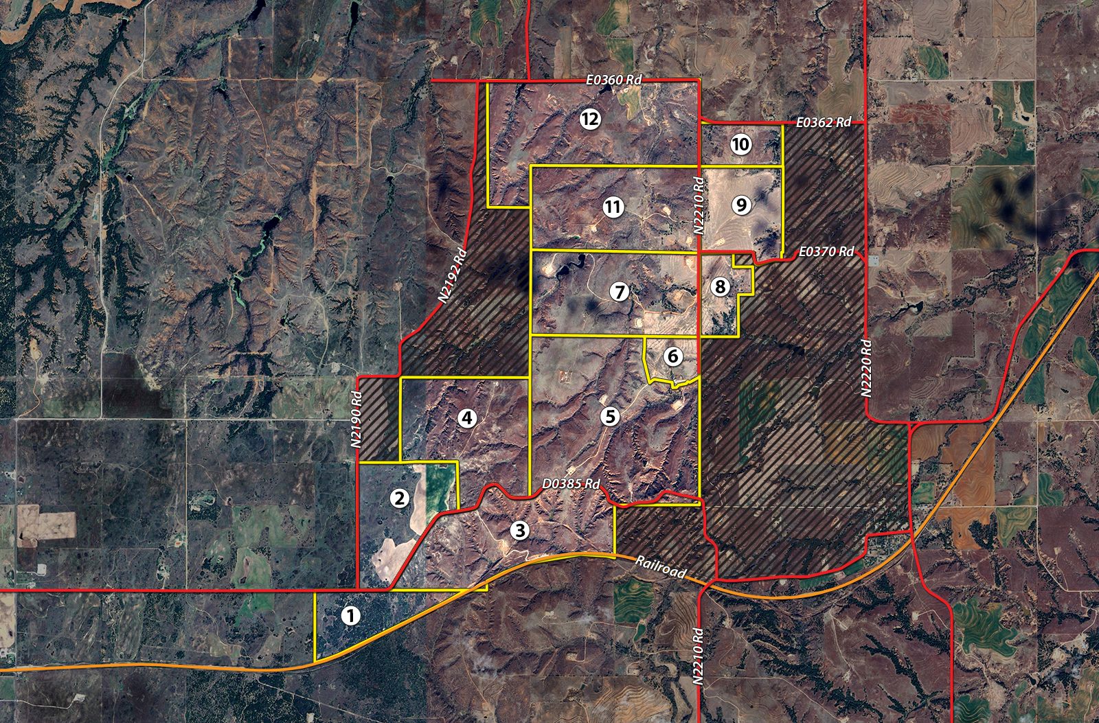 Tract 8: 76± ac Located along the eastern boundary, this tract includes Old World Bluestem pasture and approximately 36+/- tillable acres per FSA, predominately Carey silt loam soils. A heavily wooded draw provides excellent hunting potential.