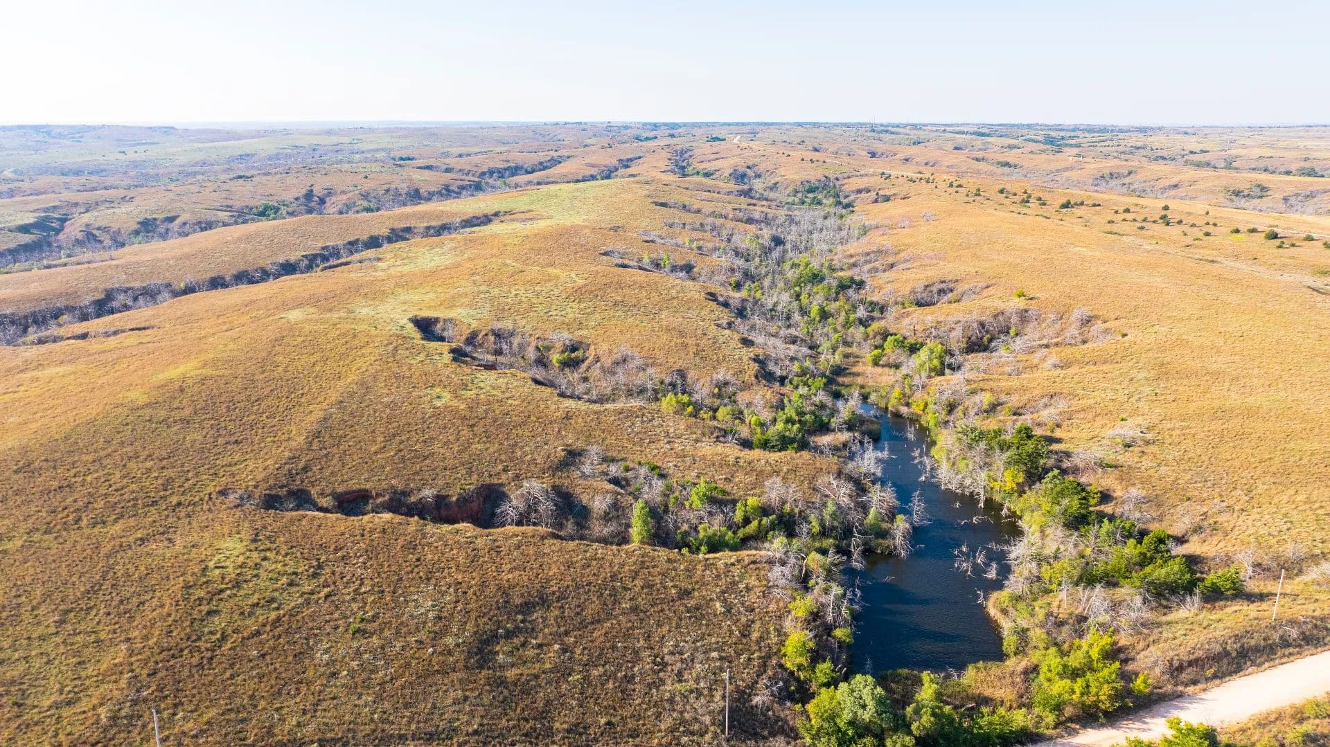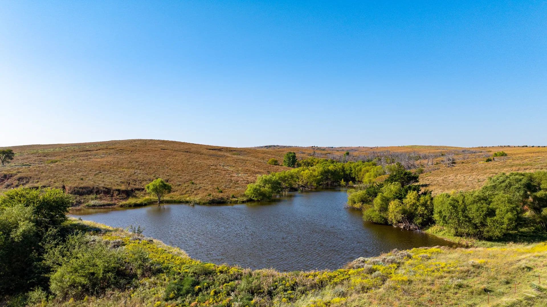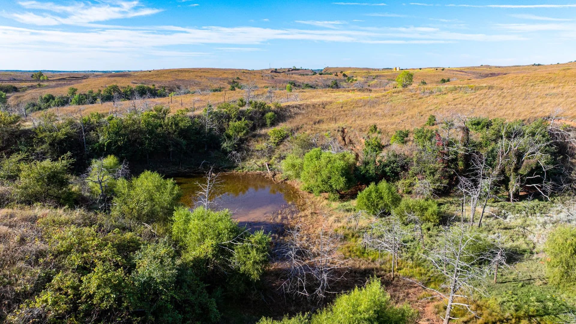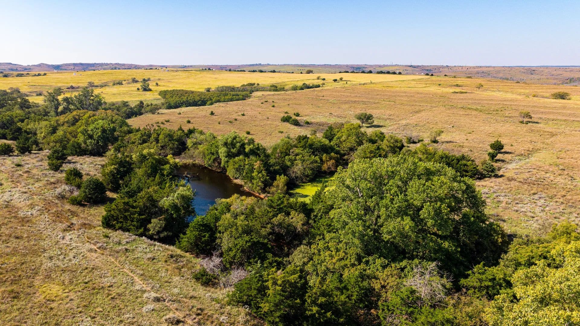 Tract 11: 320± ac Predominately mixed-grass pasture with wooded draws, featuring a clear-water pond along the south boundary and a spring-fed creek running north to south across the tract.