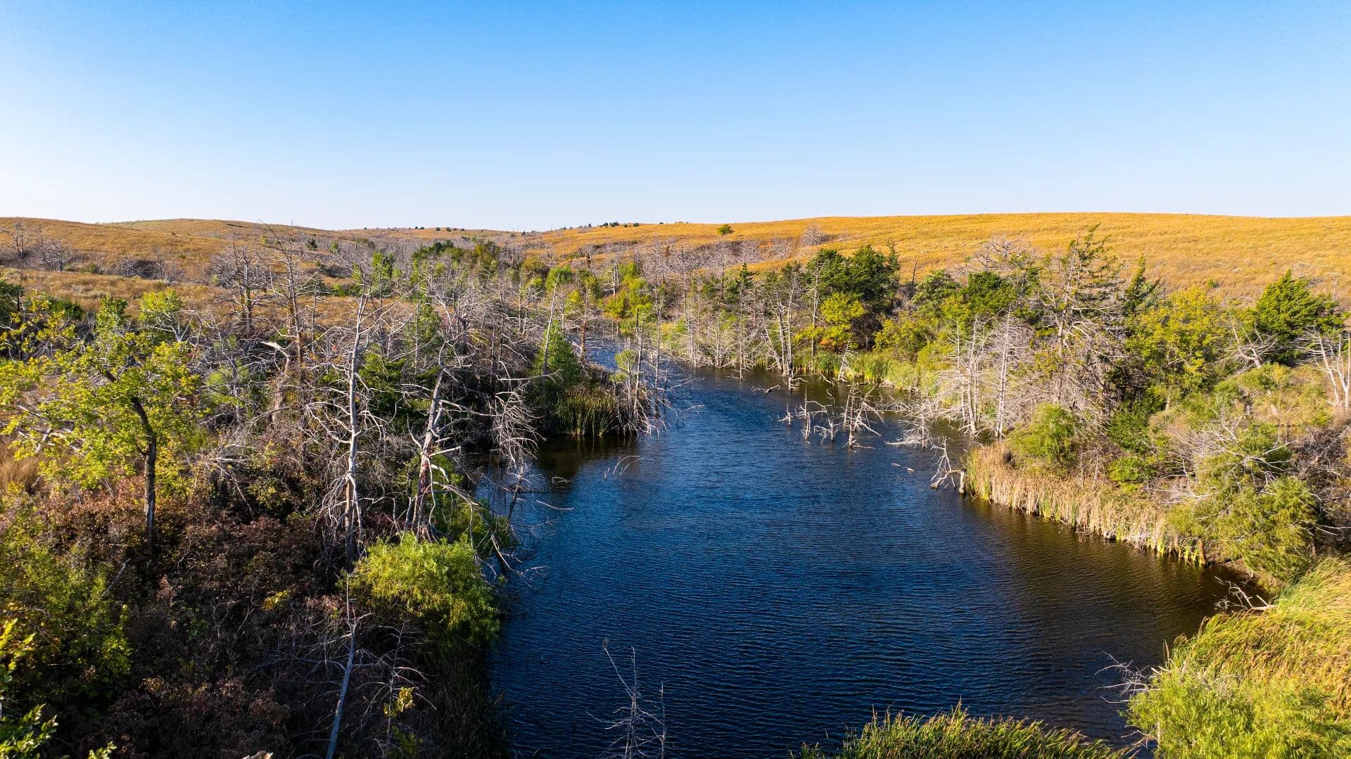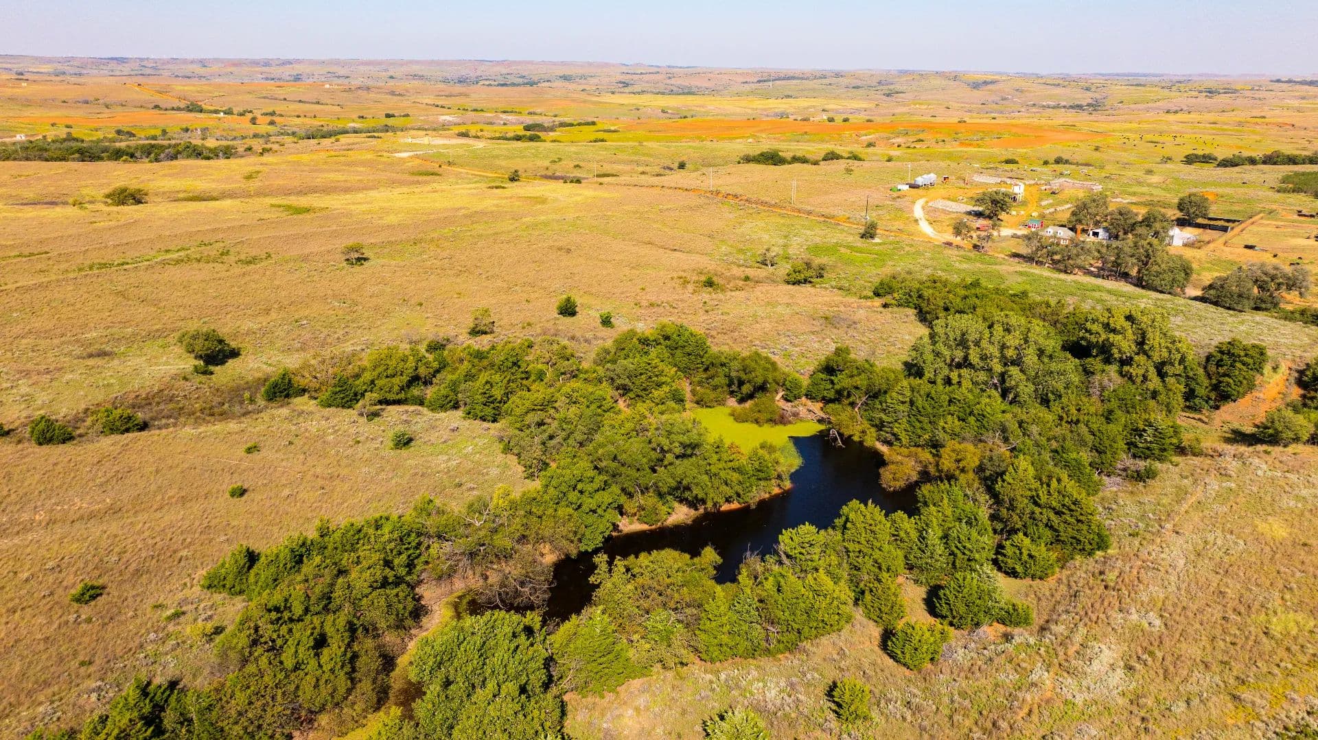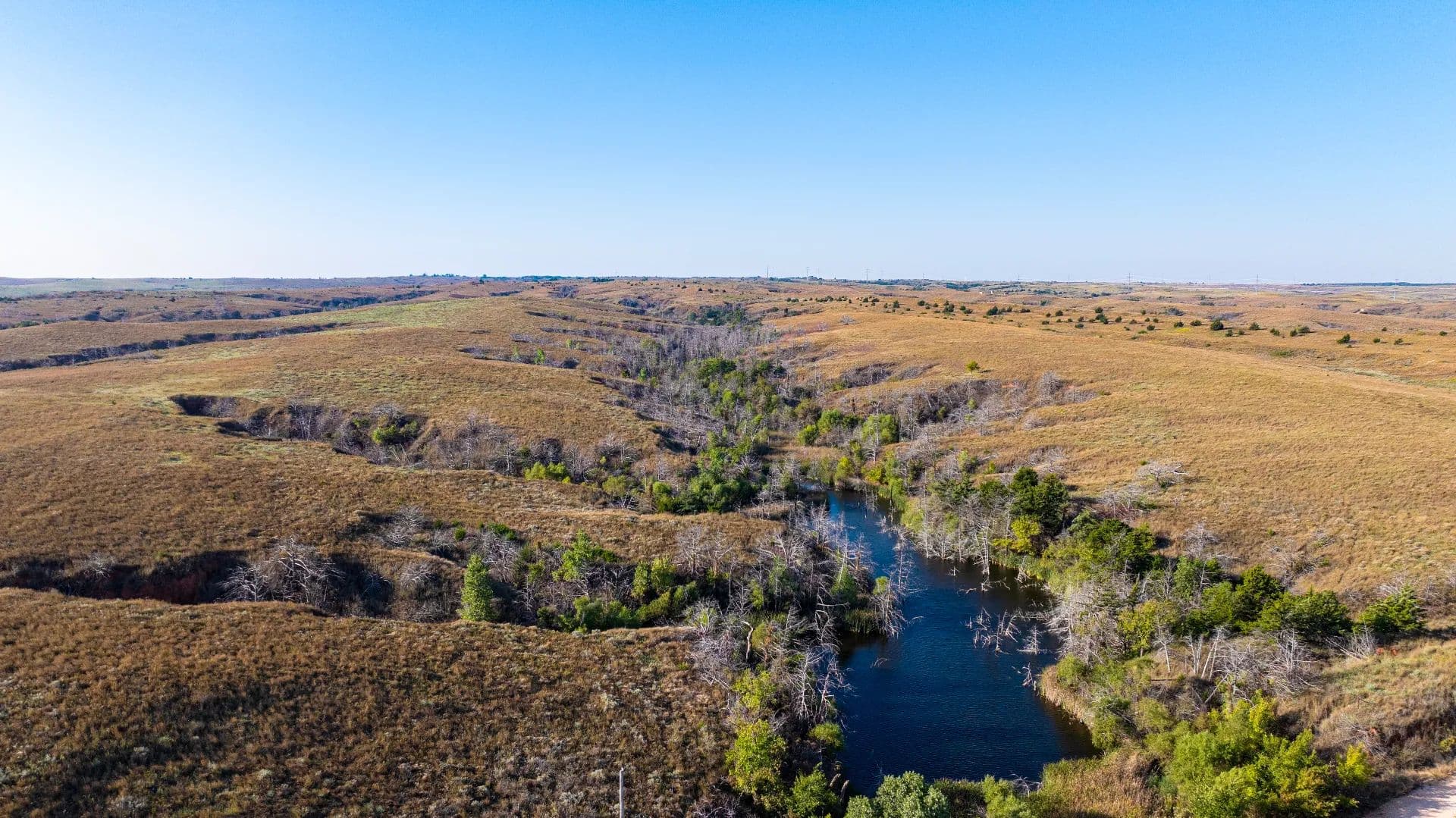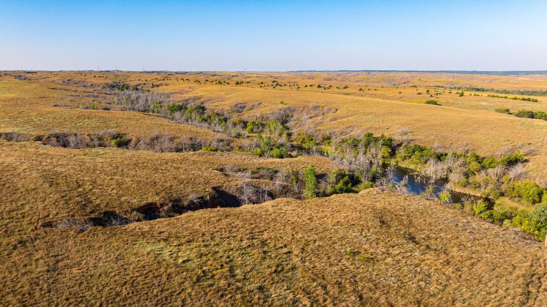 Tract 11: 320± ac Predominately mixed-grass pasture with wooded draws, featuring a clear-water pond along the south boundary and a spring-fed creek running north to south across the tract.