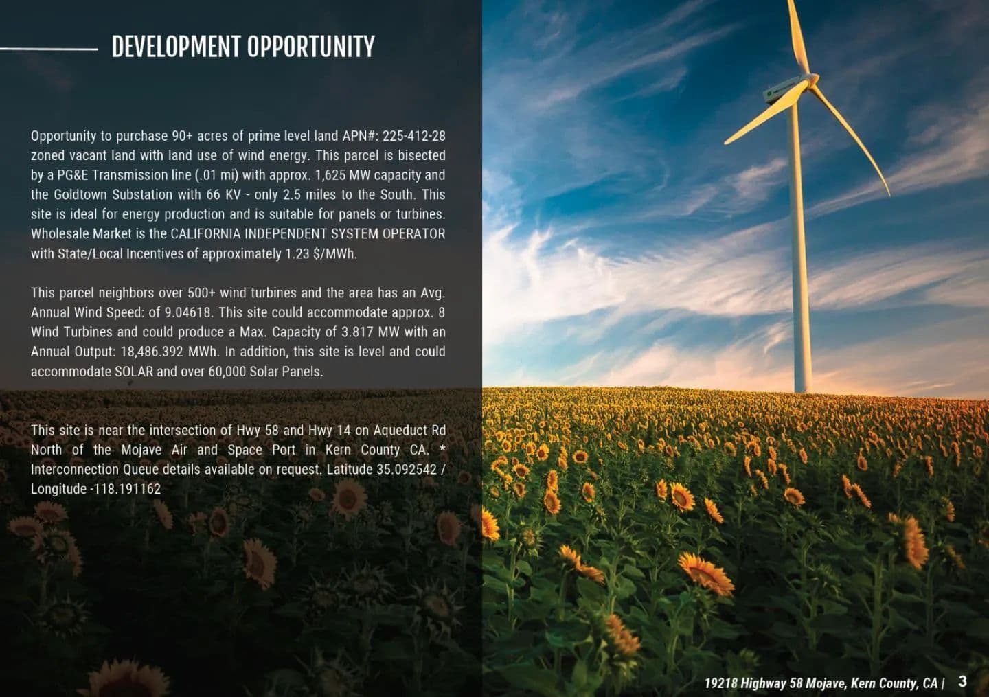 Opportunity to purchase 96+ acres of prime level land APN#: 225-412-28 for Energy Production. Zoned Vacant Land with land use code of Renewable Energy. This parcel is bisected by a PG&E Transmission line (.01 mi) with approx. 1,625 MW capacity. The Goldtown Substation with 66 KV is only 2.5 miles to the South. This site is ideal for energy production and is suitable for turbines or panels. Wholesale Market is the CALIFORNIA INDEPENDENT SYSTEM OPERATOR with State/Local Incentives of approximately 1.23 $/MWh. This parcel is in a region with over 1000+ wind turbines with an Avg. Annual Wind Speed: of 9.04618. This site could accommodate approx. 8 Wind Turbines and could produce a Max. Capacity of 3.817 MW with an Annual Output: 18,486.392 MWh. In addition, this site would be ideal for Solar with its level terrain and lack of severity zone(s) with the potential for over 60,000 Solar Panels.