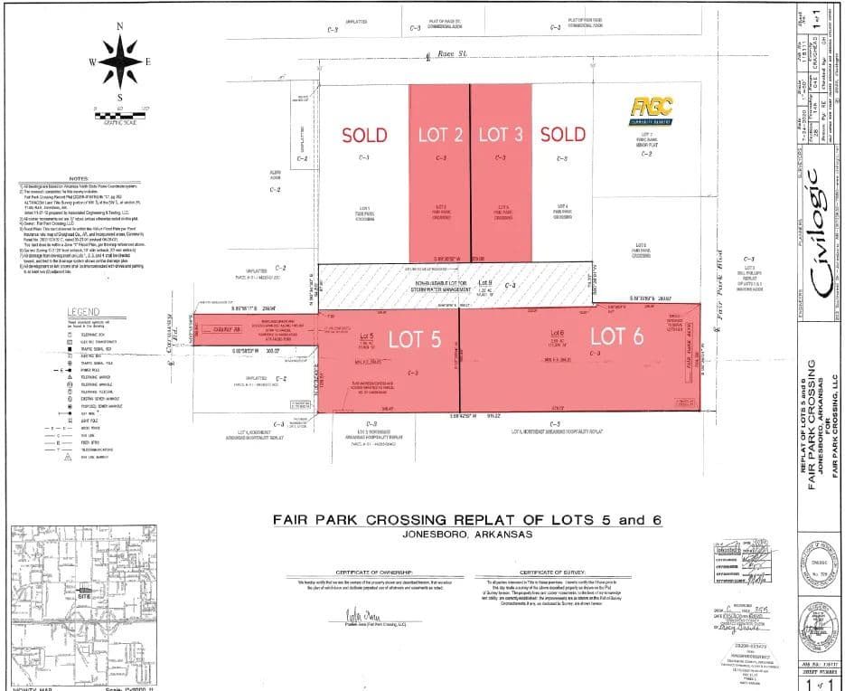 Great location! This property sits near the corner of Race St and Fair Park Blvd, a major connecting road in the heart of Jonesboro from Red Wolf Blvd (Hwy 49) and Caraway Rd, making this property a developers dream. Neighbor to FNBC Bank, across from Plato's Closet, adjacent to the United States Post office, Gateway Tire, Aldi Grocery, a newly constructed shopping center that features Auntie Anne's, Magnolia Soap, and Rock-N-Roll Sushi, and other local retail. This lot and all available lots can be replatted smaller or larger. All utilities are available. All water detention has been completed by developer.