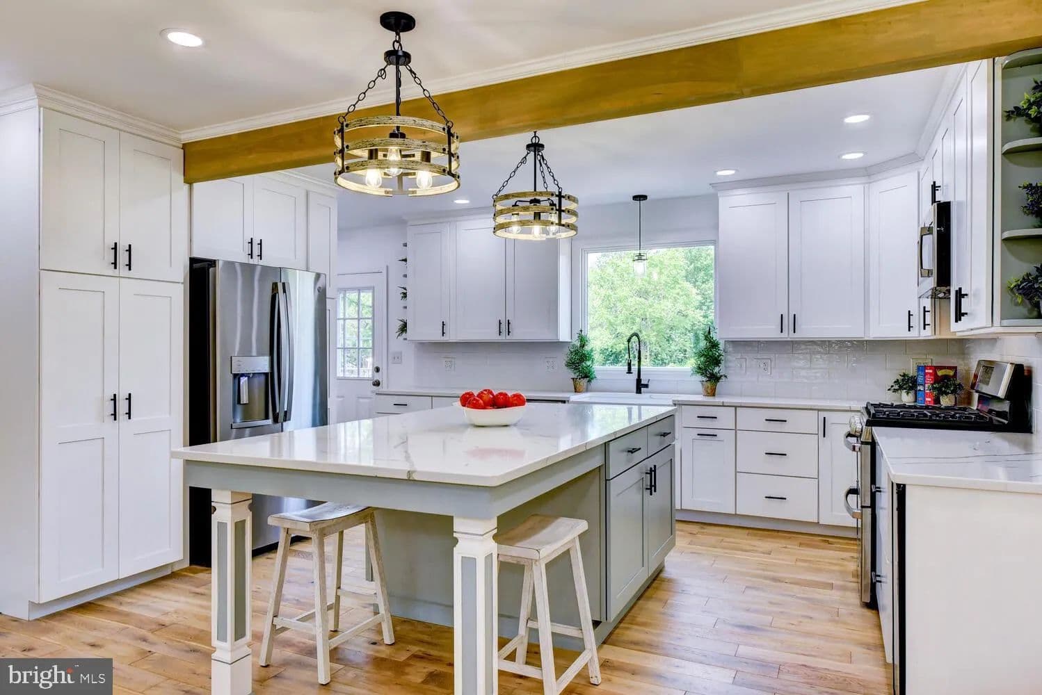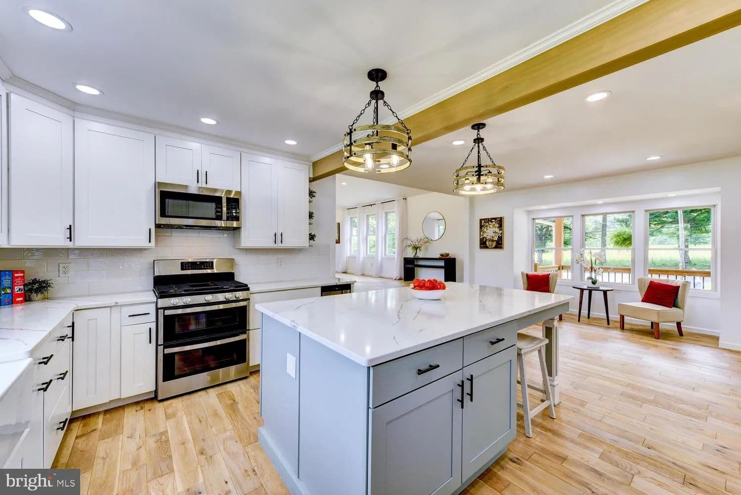 At the heart of the main floor is the farmhouse-style kitchen featuring custom wood cabinetry, quartz countertops, a large center island with seating, a farmhouse sink, a wine refrigerator, and a full suite of GE appliances—including refrigerator, double oven, stove, microwave, and dishwasher. The adjacent dining area flows seamlessly into the open layout, perfect for entertaining.