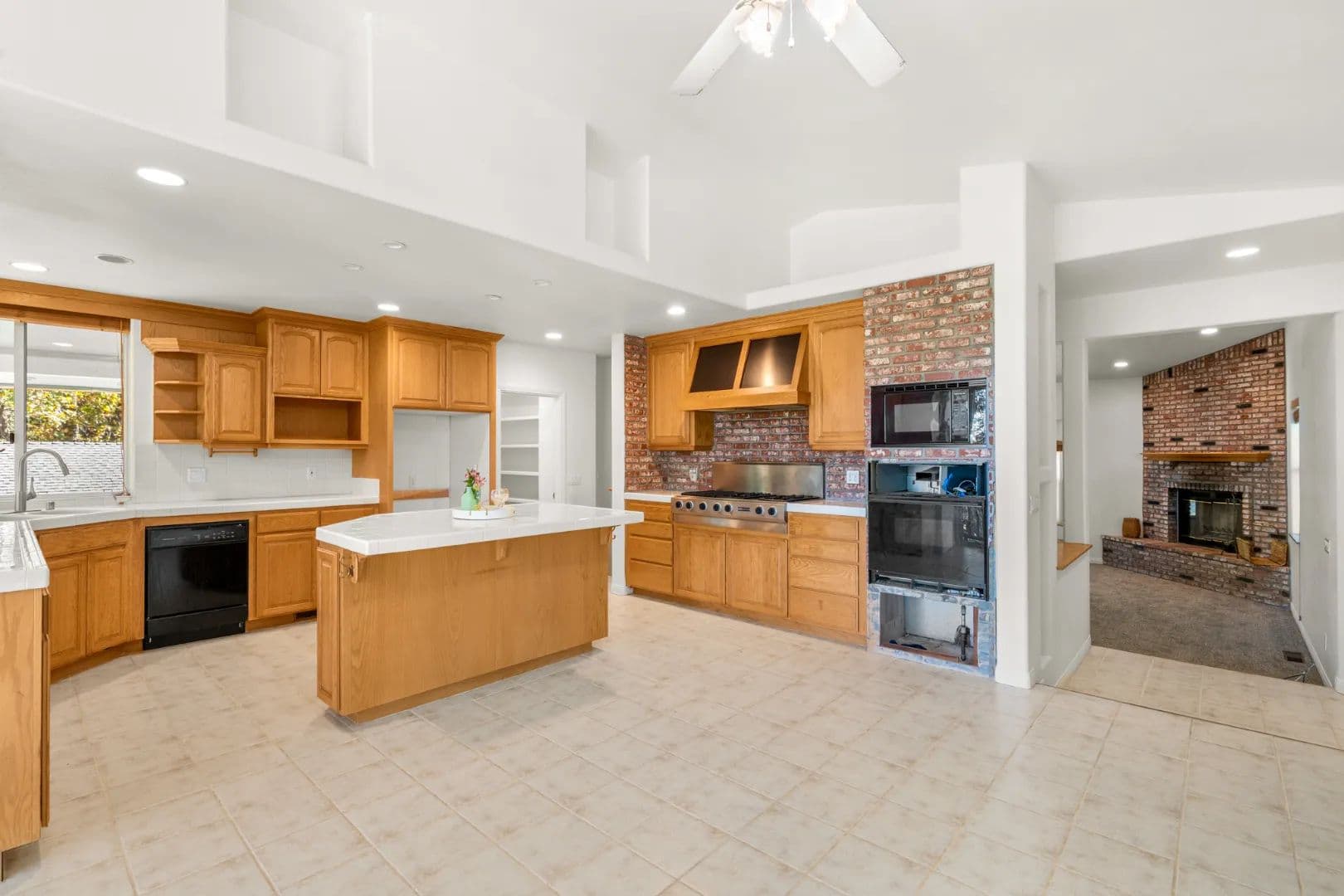 Step inside to a spacious great room anchored by a handsome brick fireplace and a large bay window that fills the space with natural light. Vaulted ceilings enhance the airy ambiance, while a built-in bookcase add charm and functionality. The kitchen – ideal for both everyday living and entertaining – features a generous center island, natural oak cabinetry, a walk -in pantry and a chef’s stove. The open layout connects seamlessly to the dining and living areas, creating an inviting flow for gatherings large or small.