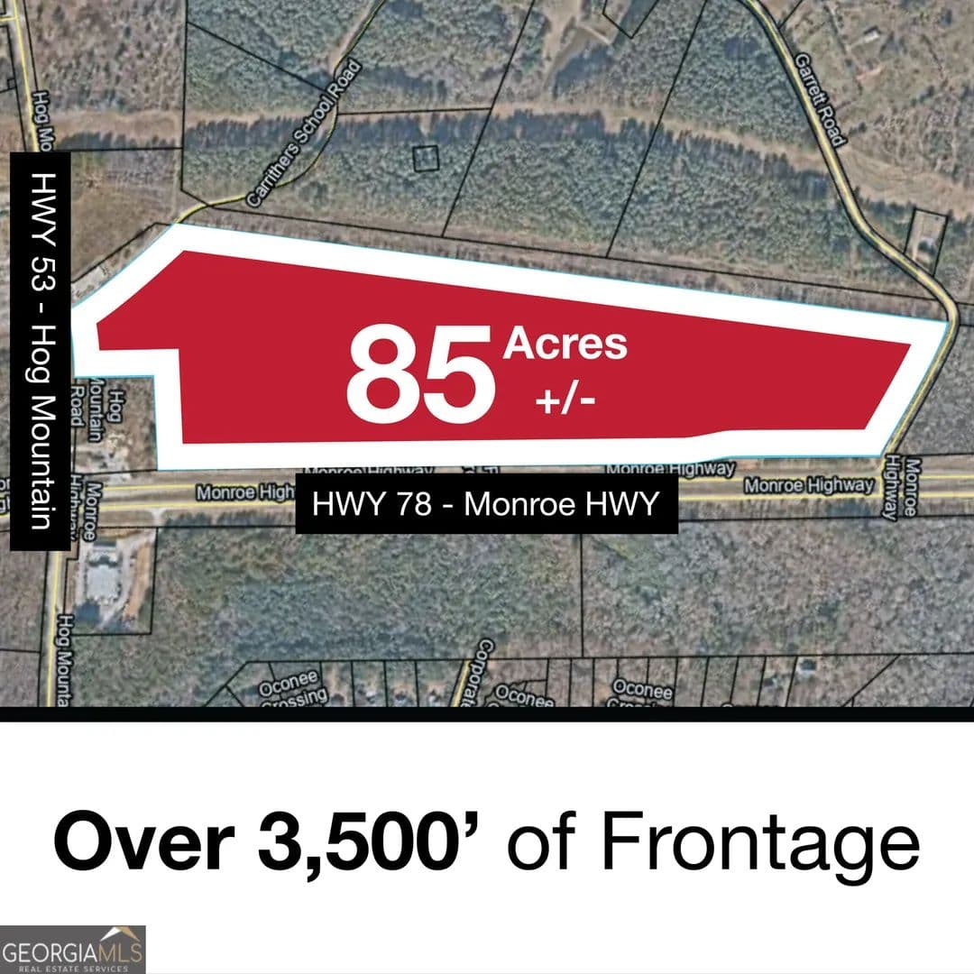 Vacant land has mIxed use opportunity with frontage on both Highway 53 (550' of frontage) and Highway 78 (3500' of frontage) Located just 13 miles from UGA. This location has water and sewer within 600 feet of the site. the topography is as level as they come! This parcel can be subdivided if necessary. AREA IS GROWING FAST.