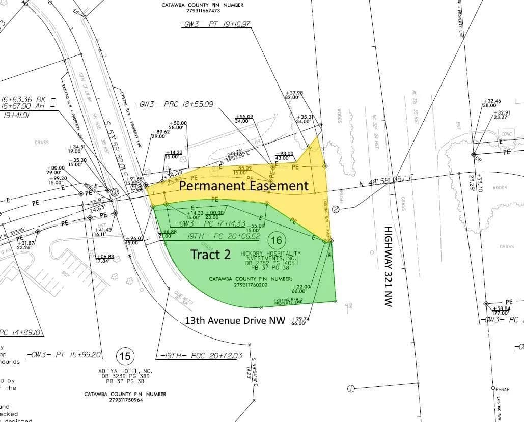 PRIME COMMERCIAL LOCATION along Hwy 321 and Hickory's Aviation Walk at the new pedestrian overpass crossing over Highway 321. This level, corner lot offers over 450 feet of road frontage and will feature a traffic light intersection after the expansion of Highway 321. Tax records indicate acreage as 0.59 acre, but part of that acreage may be affected by a permanent easement running along the City Walk, see associated MLS Docs. Exact buildable acreage is yet to be determined, seller is awaiting a completed professional survey. Currently daily traffic counts along Highway 321 exceed 35,000 vehicles per day. Pedestrian traffic across the Aviation Walk will soon open up, and the total passersby will go up even higher! The possibilities are endless!