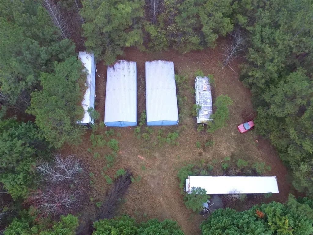 Private unrestricted 11.65-acre wooded property with paved road frontage, natural terrain, and a secluded setting. The land includes a gated entry, some fencing and a cleared area with two existing metal storage buildings and mobile units/trailers. Aerial views showcase the size, layout, and depth of the property, offering a quiet and spacious tract with a mix of open and wooded areas.