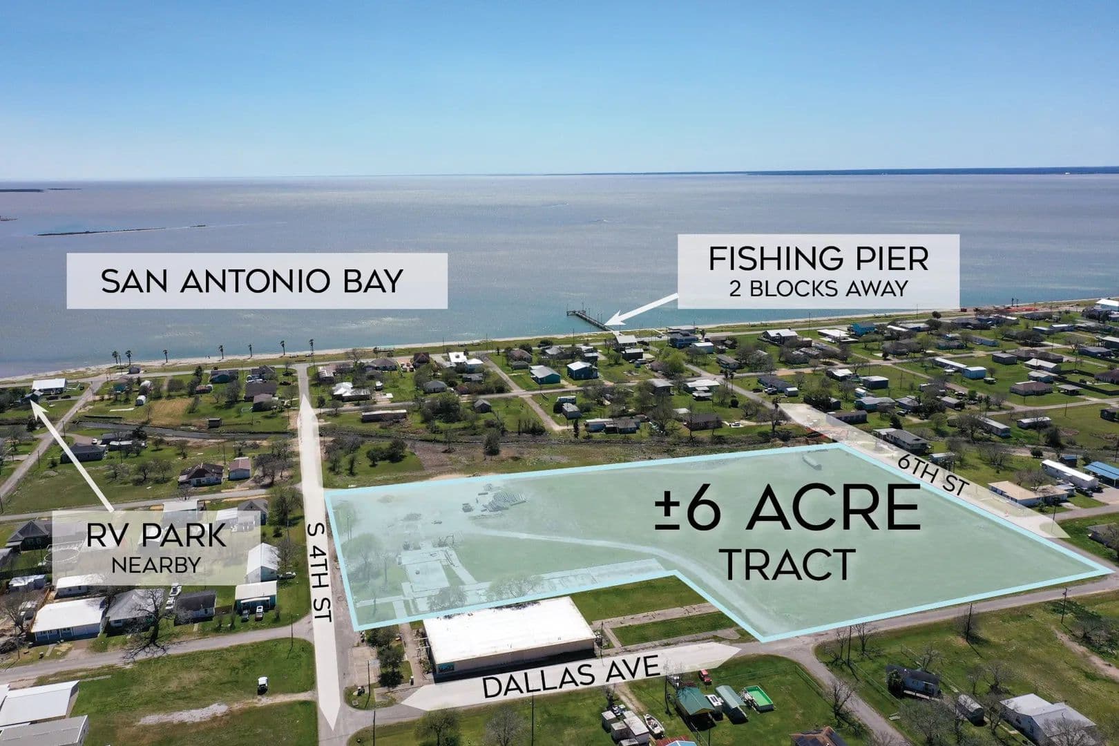 Unlock endless possibilities with this prime 6+/- acre tract, offering expansive frontage along S. 4th St., Dallas Ave. and 6th St. It is ideally situated in the heart of Seadrift just two blocks from the scenic San Antonio Bay and popular fishing pier. This property boasts exceptional visibility and easy access. With city water and sewer connections available, it is perfectly suited for a wide range of commercial or residential projects. Whether you are planning a vibrant commercial complex, a retail center or a mix-use development it is a fantastic investment opportunity with versatility. Don't miss your chance to own a piece of PRIME real estate in the rapidly growing Seadrift, Tx!