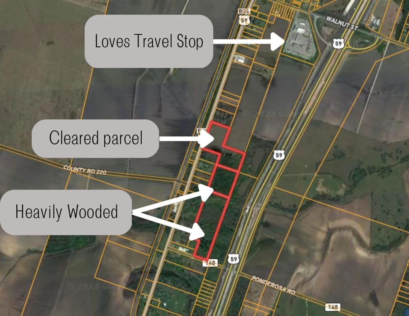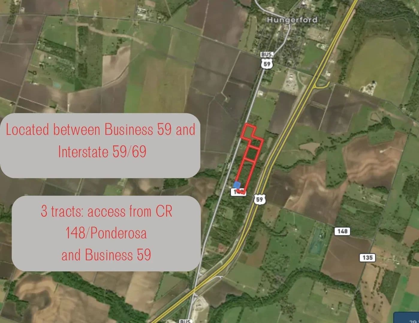 Excellent location between I 59/69 and Business 59 just South of Hungerford, Tx. Existing electricity, there is evidence that a water well existed at one time, septic is non working. Partially wooded, part cleared. Location near Kansas City Southern Intermodal railroad transportation center. See Tx Dot expansion plans for Interstate 69 that are underway now. This property is ready for development of storage, mobile homes park, business or industrial.