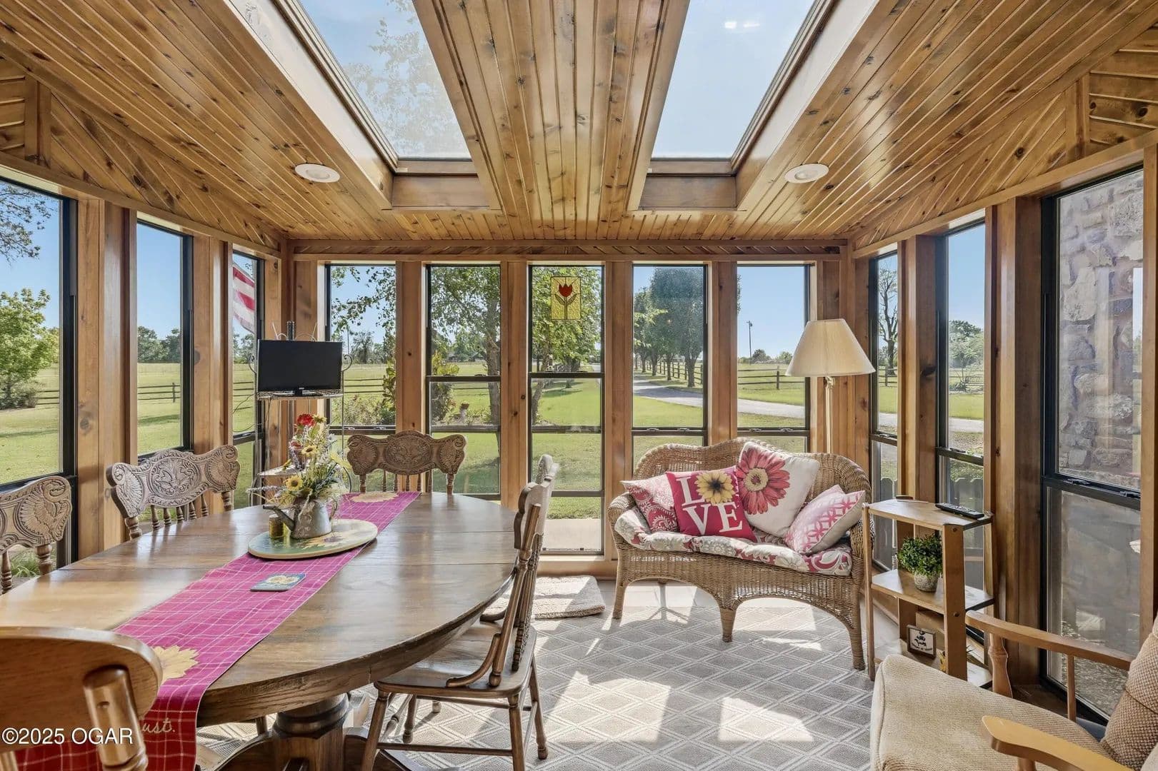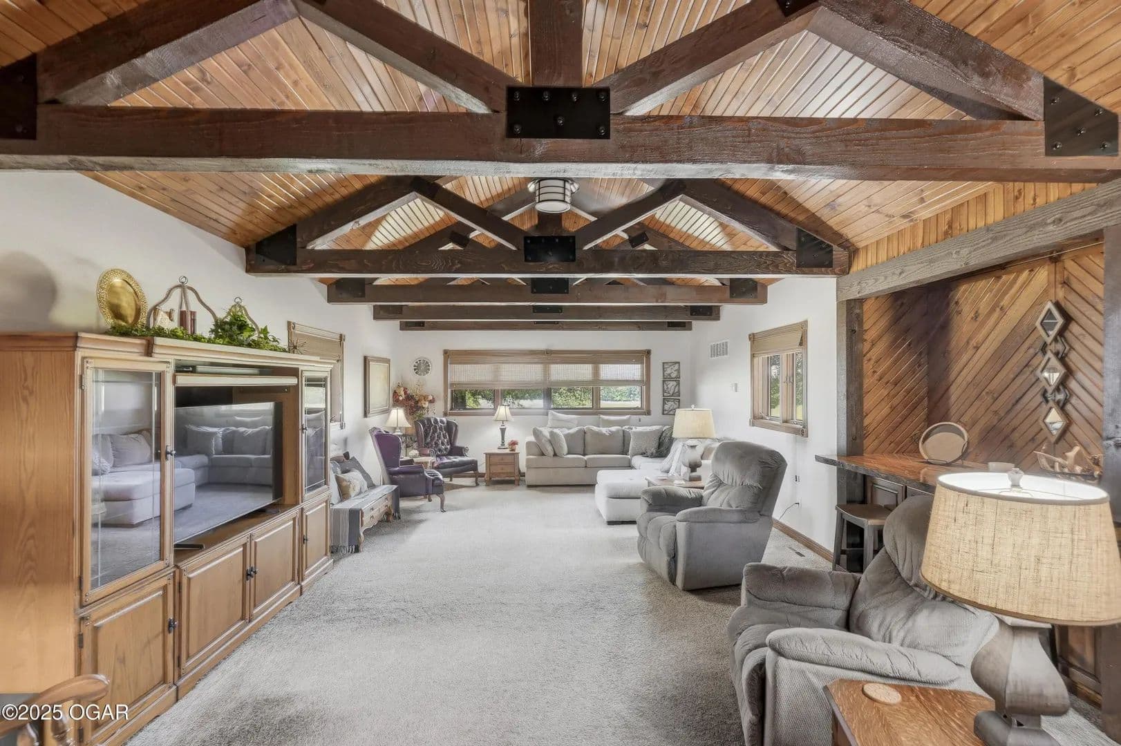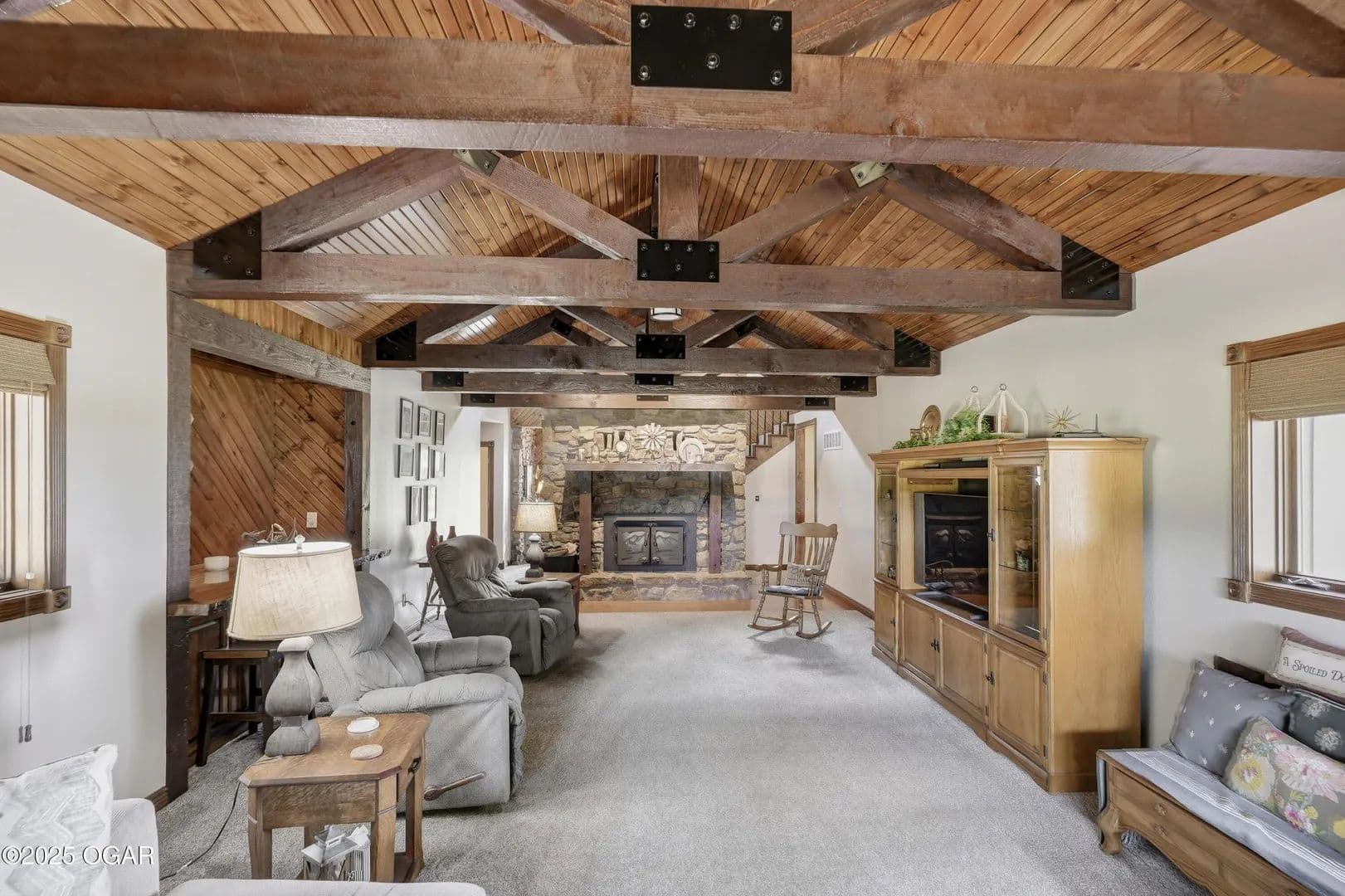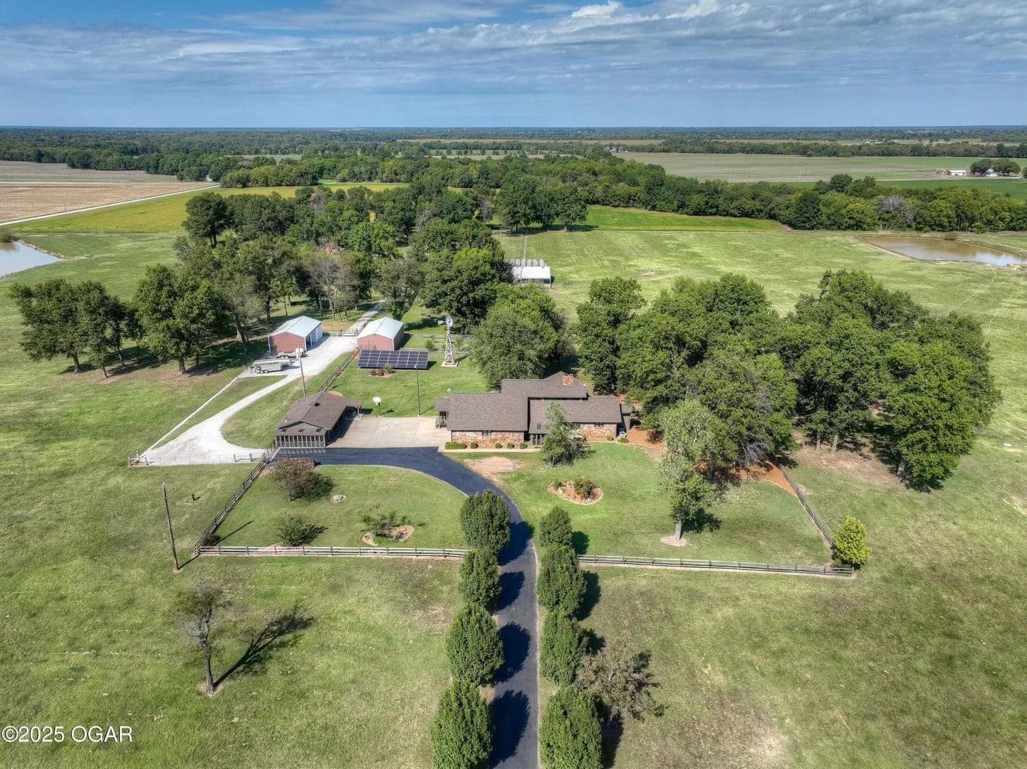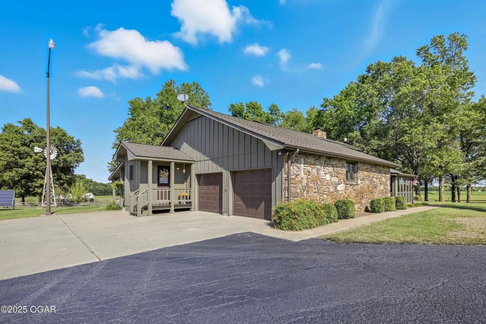 Set on 76 picturesque acres just outside Carl Junction, Missouri, this high-end custom home blends refined craftsmanship with rustic charm. Constructed with 2x6 framing and genuine Arkansas stone, it showcases thoughtful details throughout—wood beams, wood-paneled ceilings, Arkansas stone accents, and warm, natural tones that create a welcoming atmosphere. A new Tamko roof was installed on both the home and shop in September 2025, offering long-lasting peace of mind.