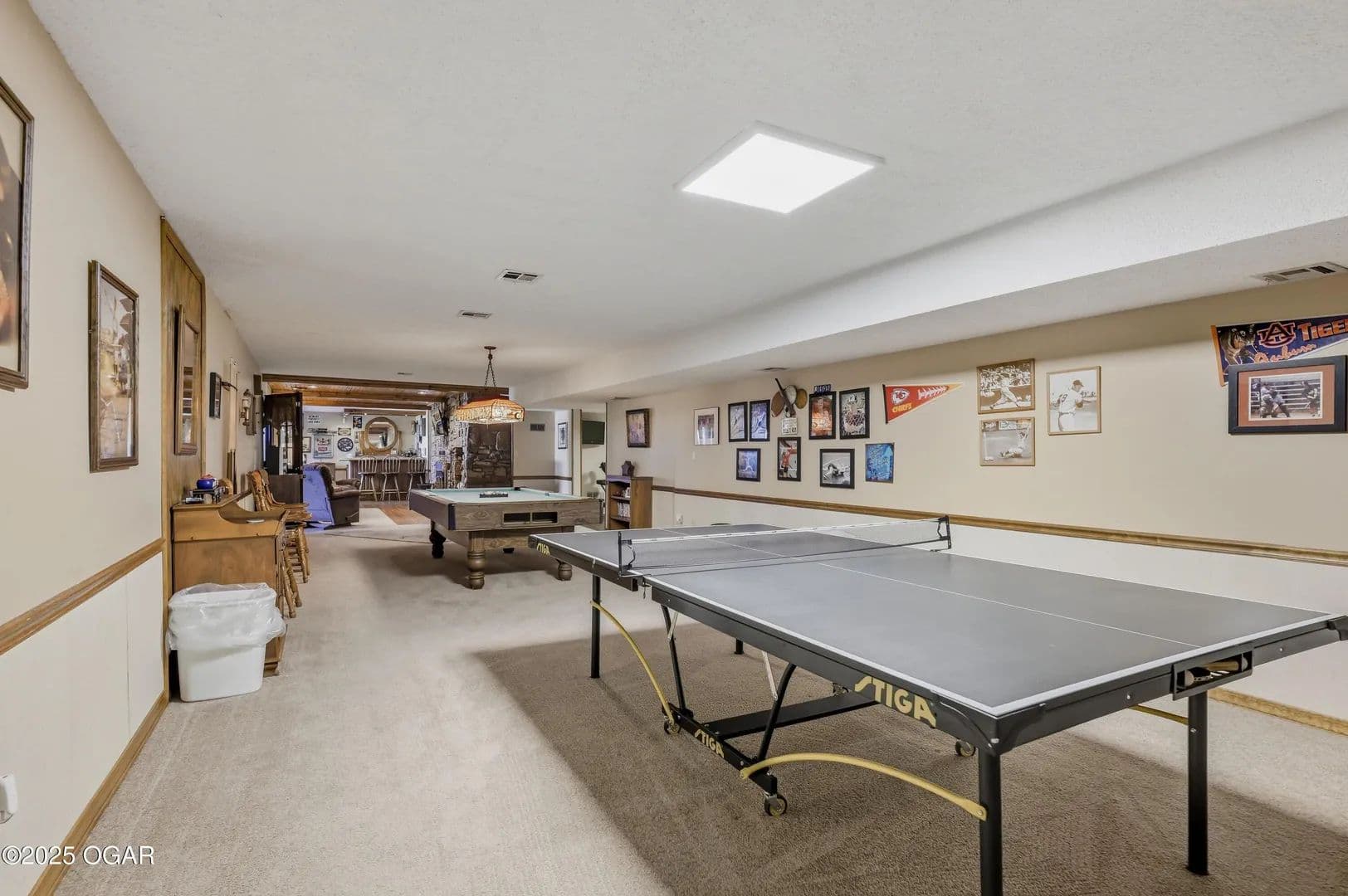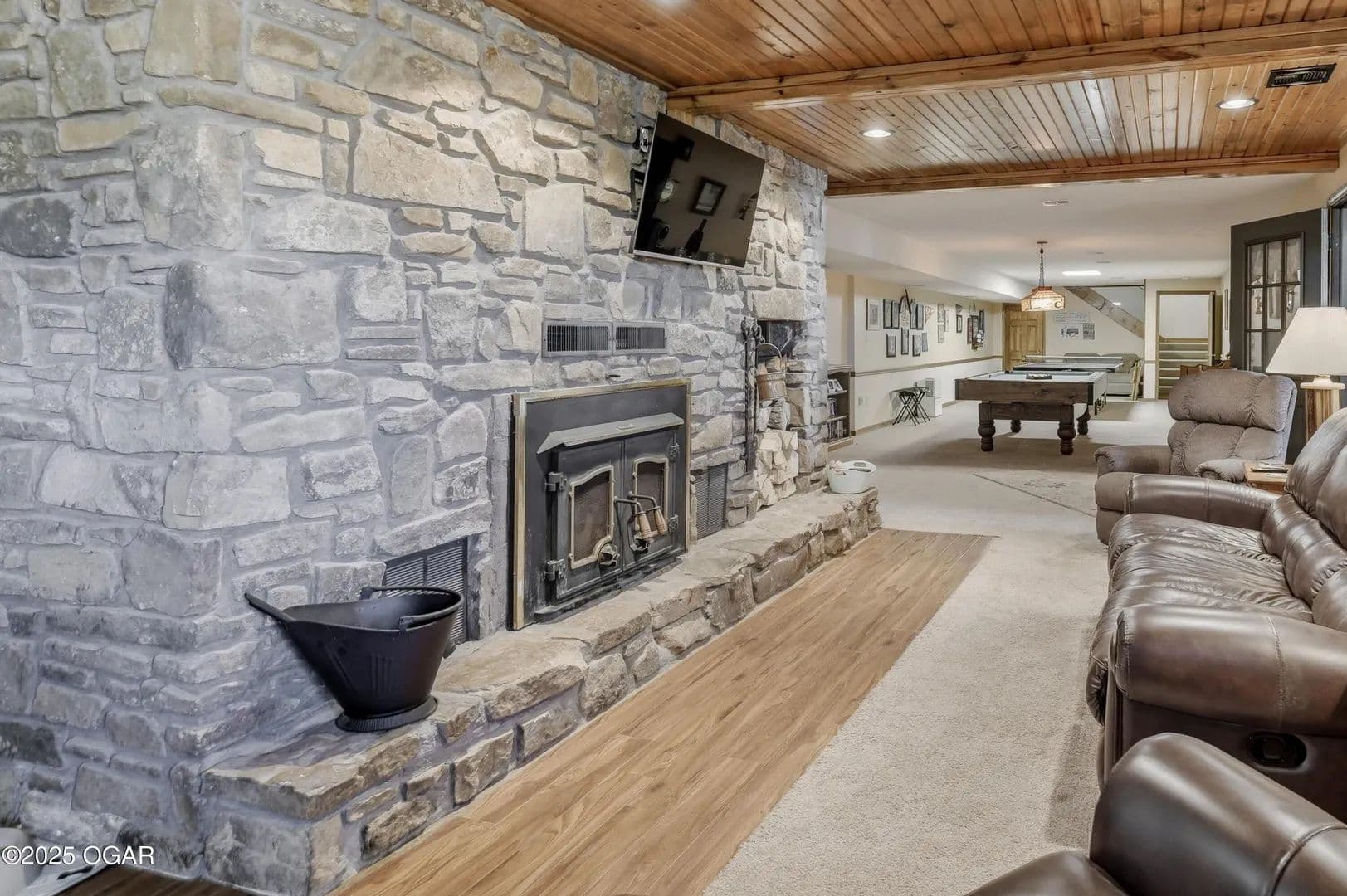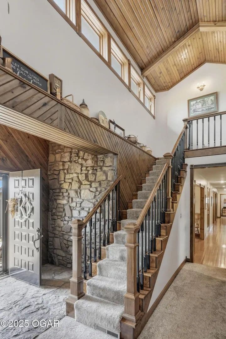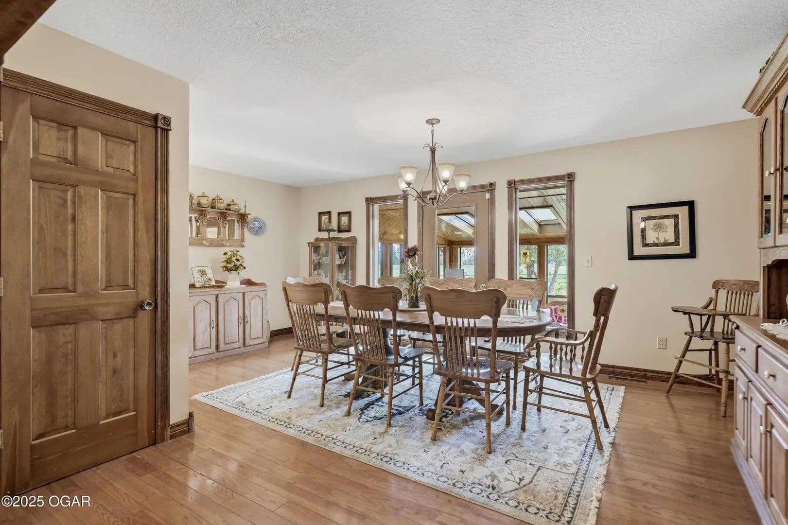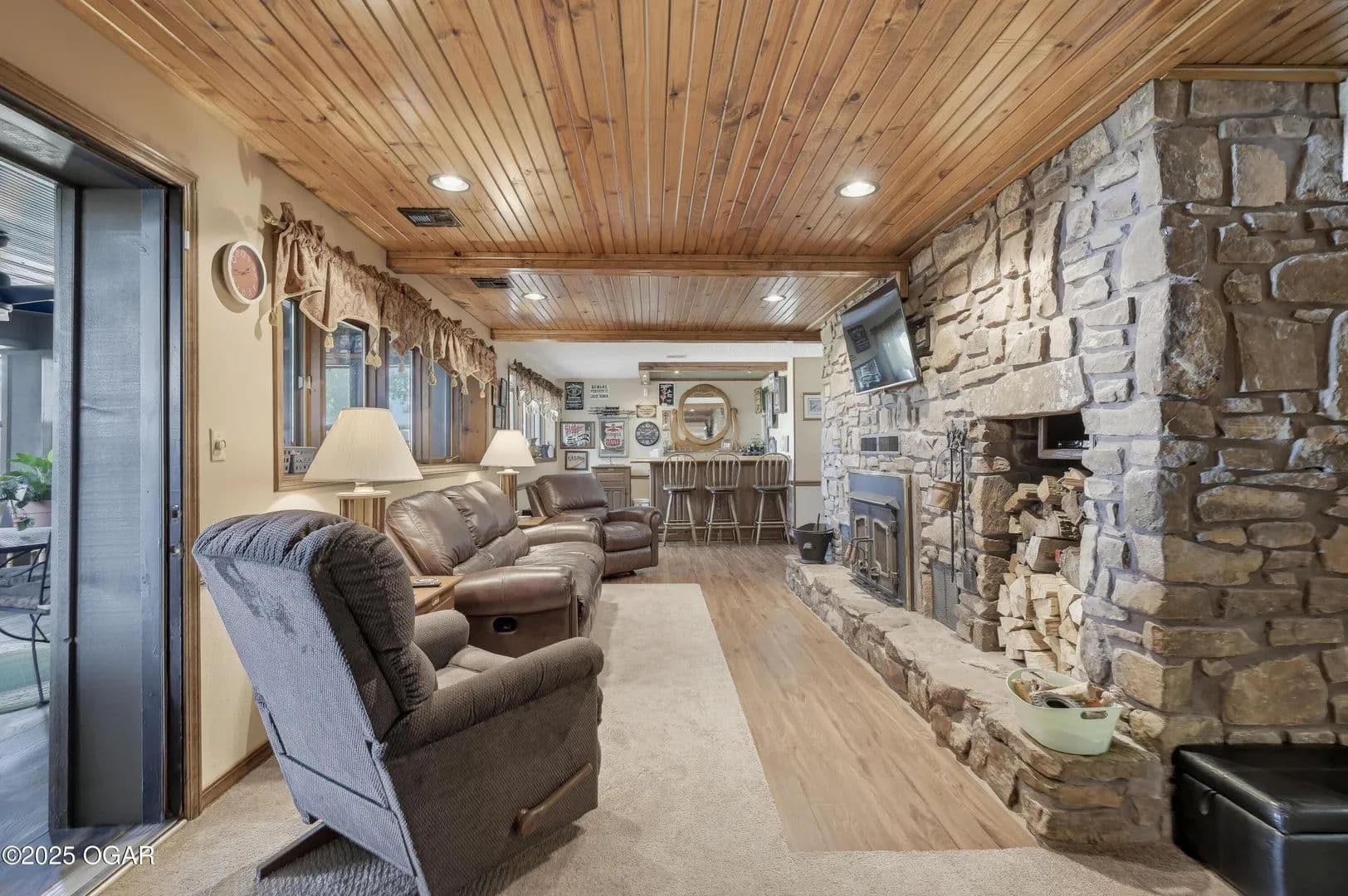 Set on 76 picturesque acres just outside Carl Junction, Missouri, this high-end custom home blends refined craftsmanship with rustic charm. Constructed with 2x6 framing and genuine Arkansas stone, it showcases thoughtful details throughout—wood beams, wood-paneled ceilings, Arkansas stone accents, and warm, natural tones that create a welcoming atmosphere. A new Tamko roof was installed on both the home and shop in September 2025, offering long-lasting peace of mind.