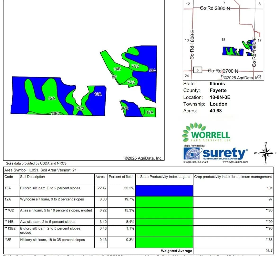 Property Location & Directions: Property is located in Northeastern Fayette County, IL Section 18 – Township 8N – Range 3E. From St. Elmo head North on 1250/County Road 4 then West on 2700 then North on 1900.