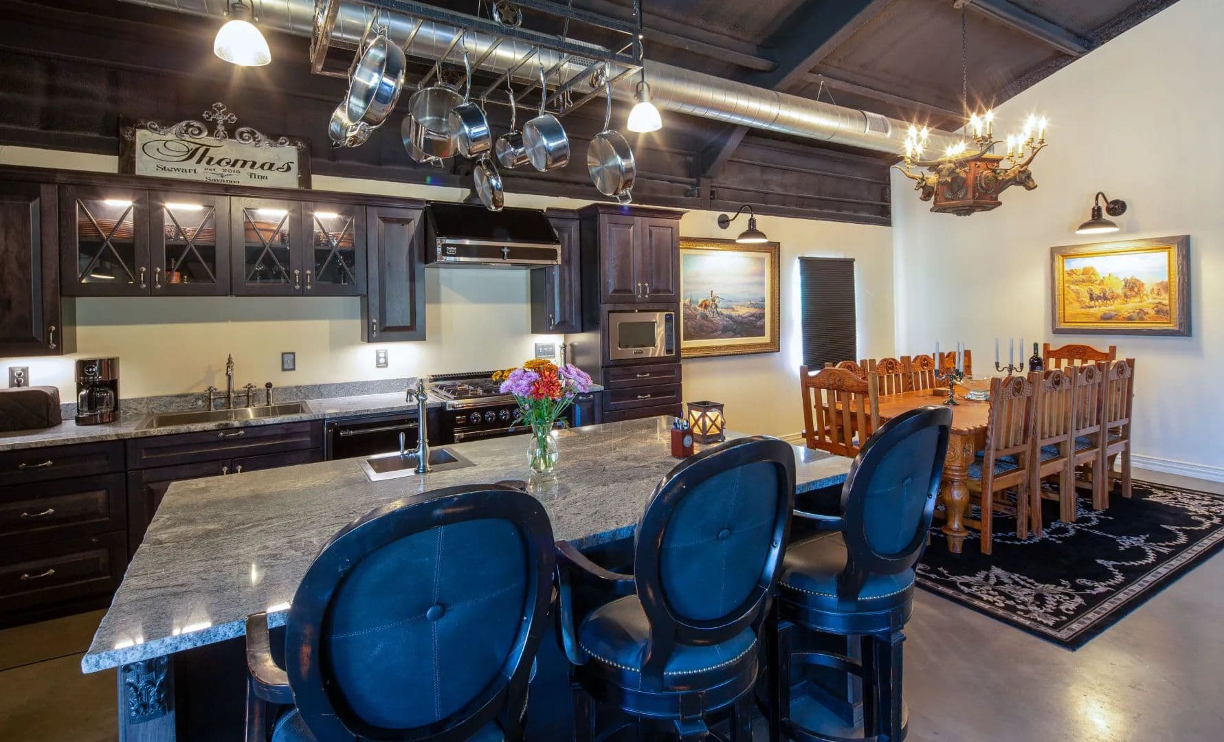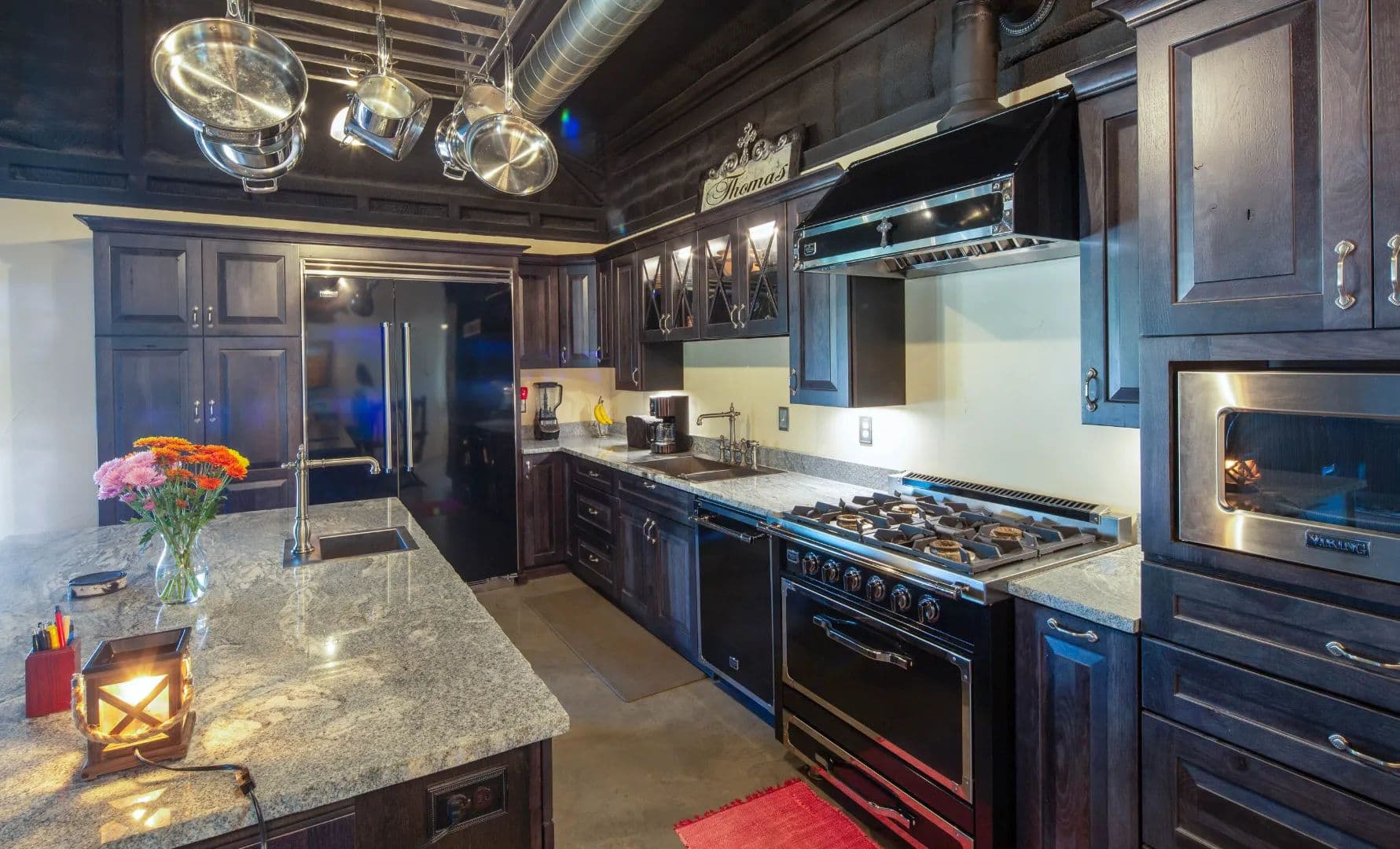 The kitchen is a showpiece, equipped with a 36-inch Viking Tuscany dual-fuel range with hood and blower, a 48-inch Viking 5 Series side-by-side refrigerator, convection microwave, and 24-inch panel-ready dishwasher, all in classic black. Custom soft-close cabinetry, crown molding, a 7×4 granite island, breakfast bar, pantry, warming drawer, and ice maker add both beauty and utility.
