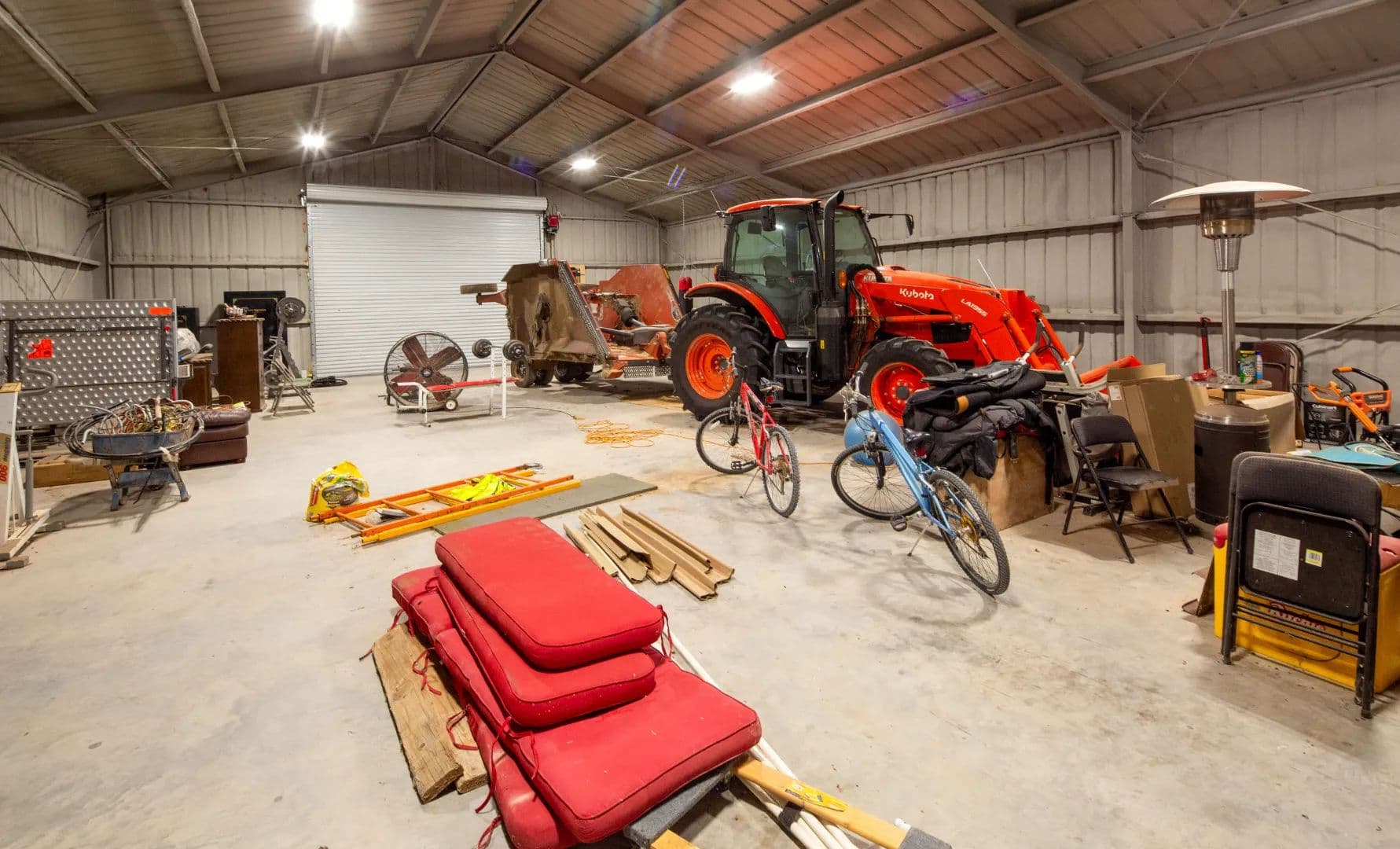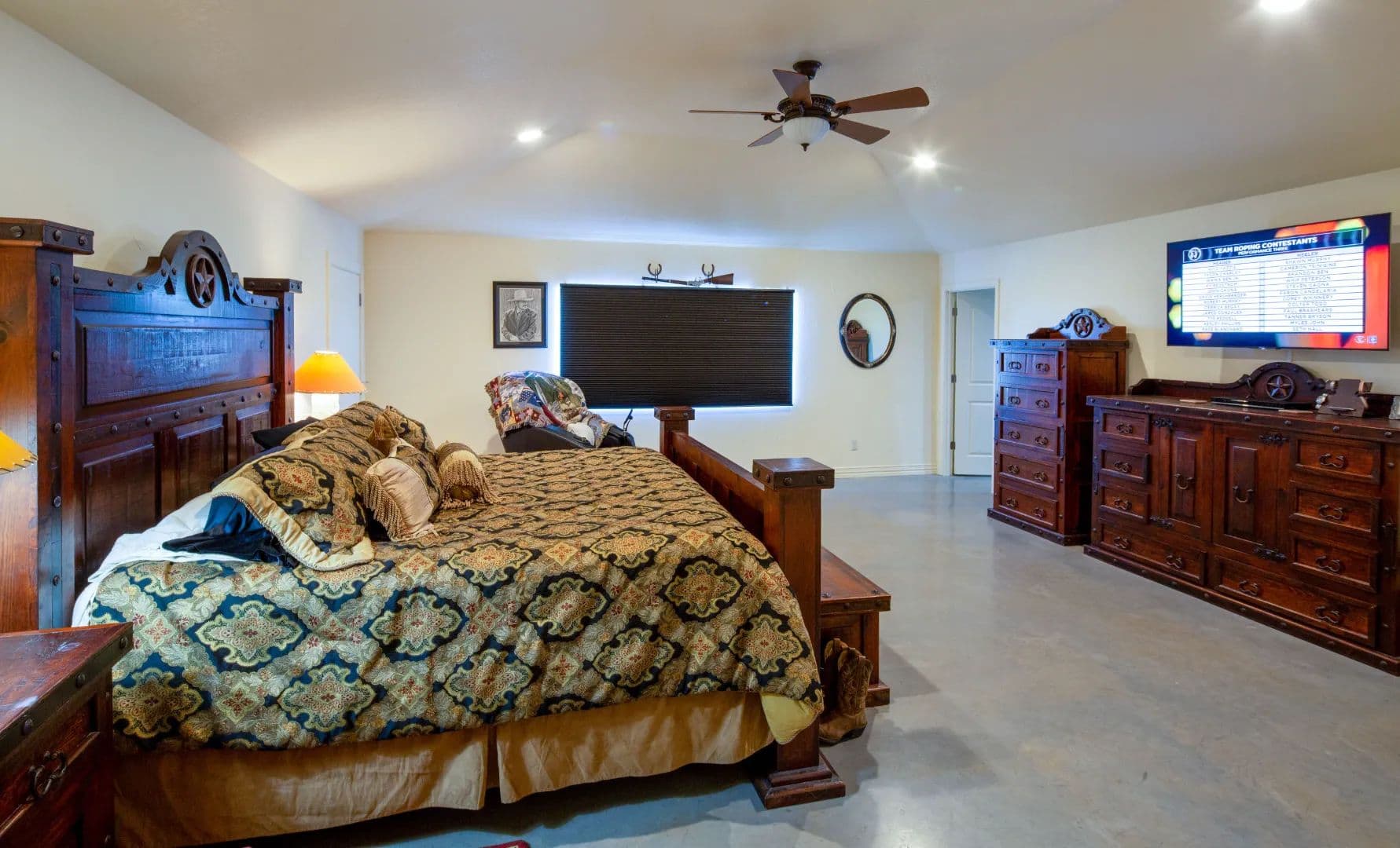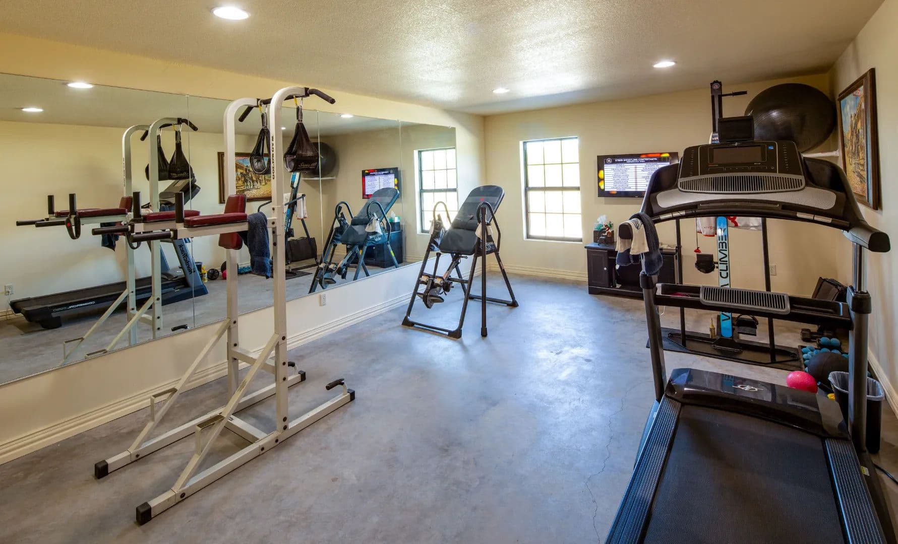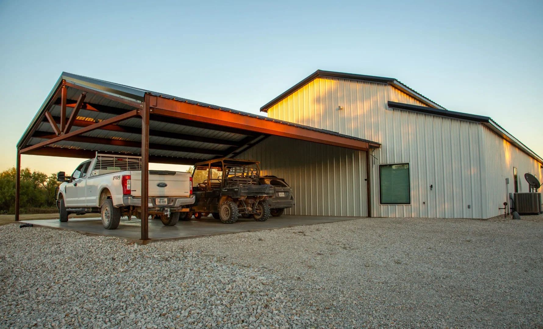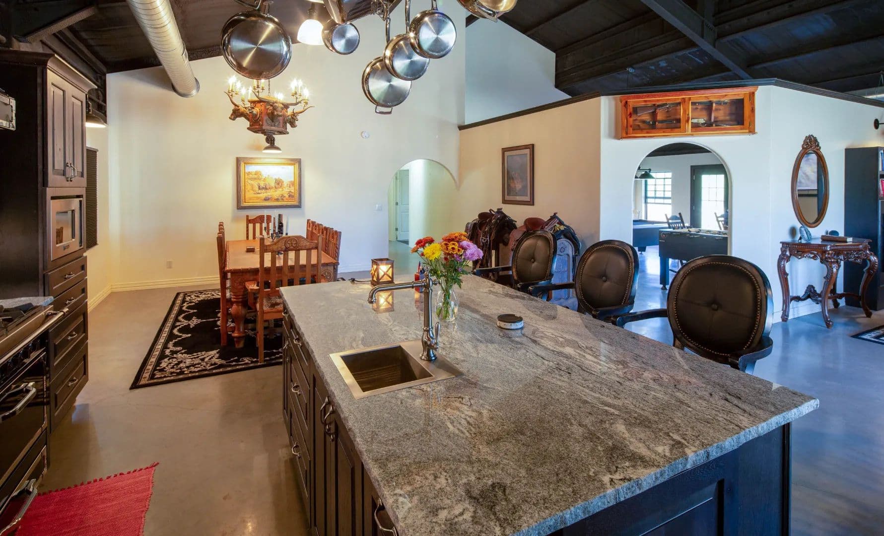 The barndominium features three bedrooms, two full baths, an office, a game room, and a dedicated workout area. Sealed natural concrete floors flow throughout, complemented by vaulted ceilings and a ventless gas fireplace in the open concept living area. The home is climate-controlled by Lennox ENERGY STAR-qualified heat pumps and spray insulation, and for peace of mind, there is a built-in safe room and a 24 kW Generac backup generator available. A drive-through covered carport with circular drive provides convenient vehicle access.