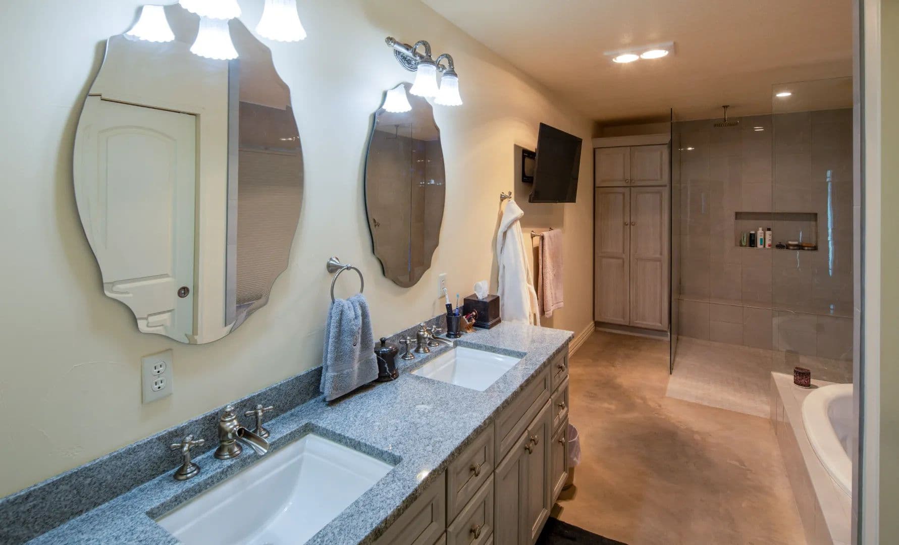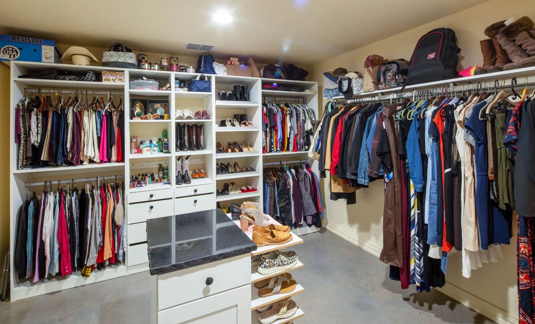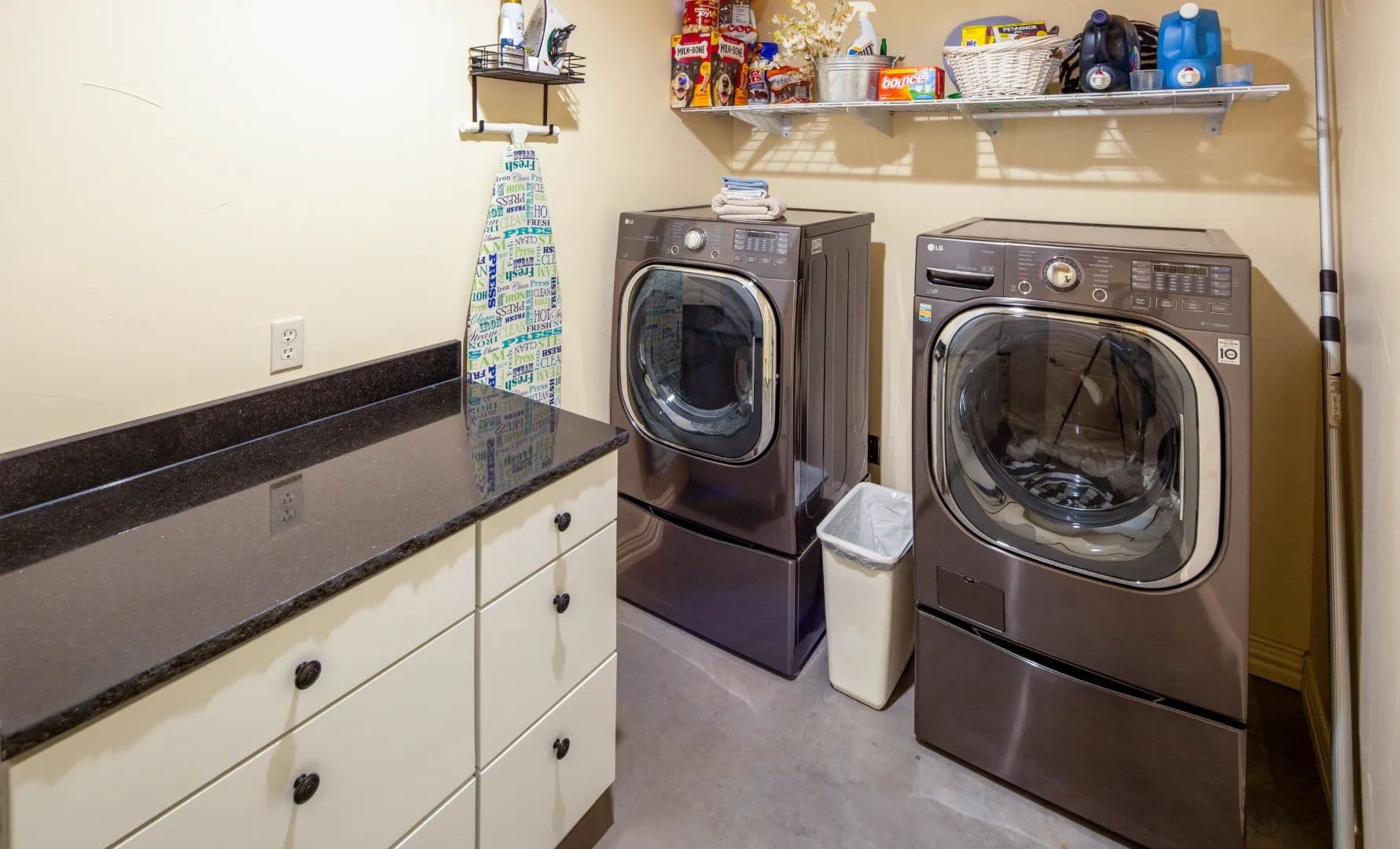 The master suite includes his-and-her walk-in closets, vaulted ceilings, and mood lighting. The bath features a heated floor, 6×6 walk-in shower with dual shower heads, a drop-in tub, and elegant Kohler fixtures—creating a spa-quality experience. The laundry room offers an island work center with granite countertops for added functionality.