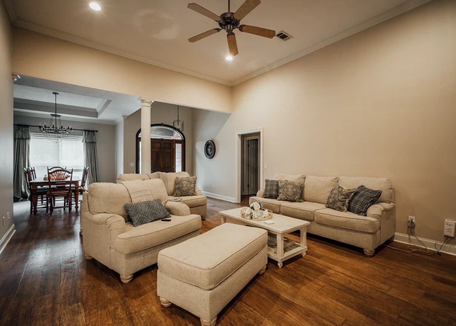 Of the four bedrooms, two full baths, and one half bath, the primary suite includes his-and-hers closets and a double vanity bathroom, offering a private and relaxing retreat at the end of the day. The three additional bedrooms are located on the opposite side of the home, ensuring privacy and comfort for family members or guests.