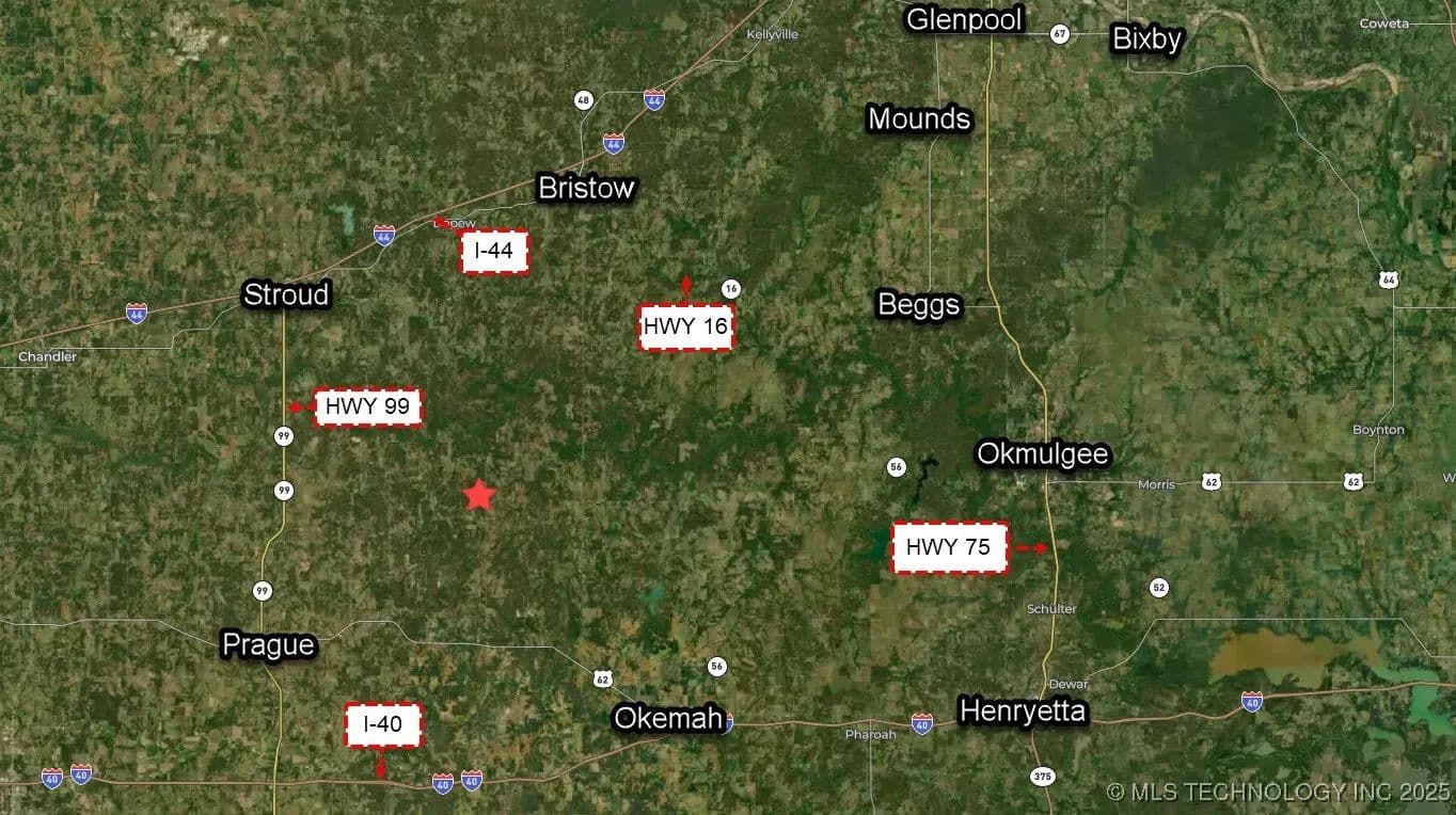 Despite its quiet setting, the property is well connected to surrounding towns and highways. It is located 6 miles from Highway 48, 8 miles from Highway 62, 10.5 miles from Highway 99, 22 miles to I-40, and 23 miles to I-44, giving easy access in all directions. Nearby communities include Welty, Boley, and Castle, all within 10 miles, and Bristow is only 19 miles down the road and Tulsa is less than an hour for additional shopping, dining, and services.