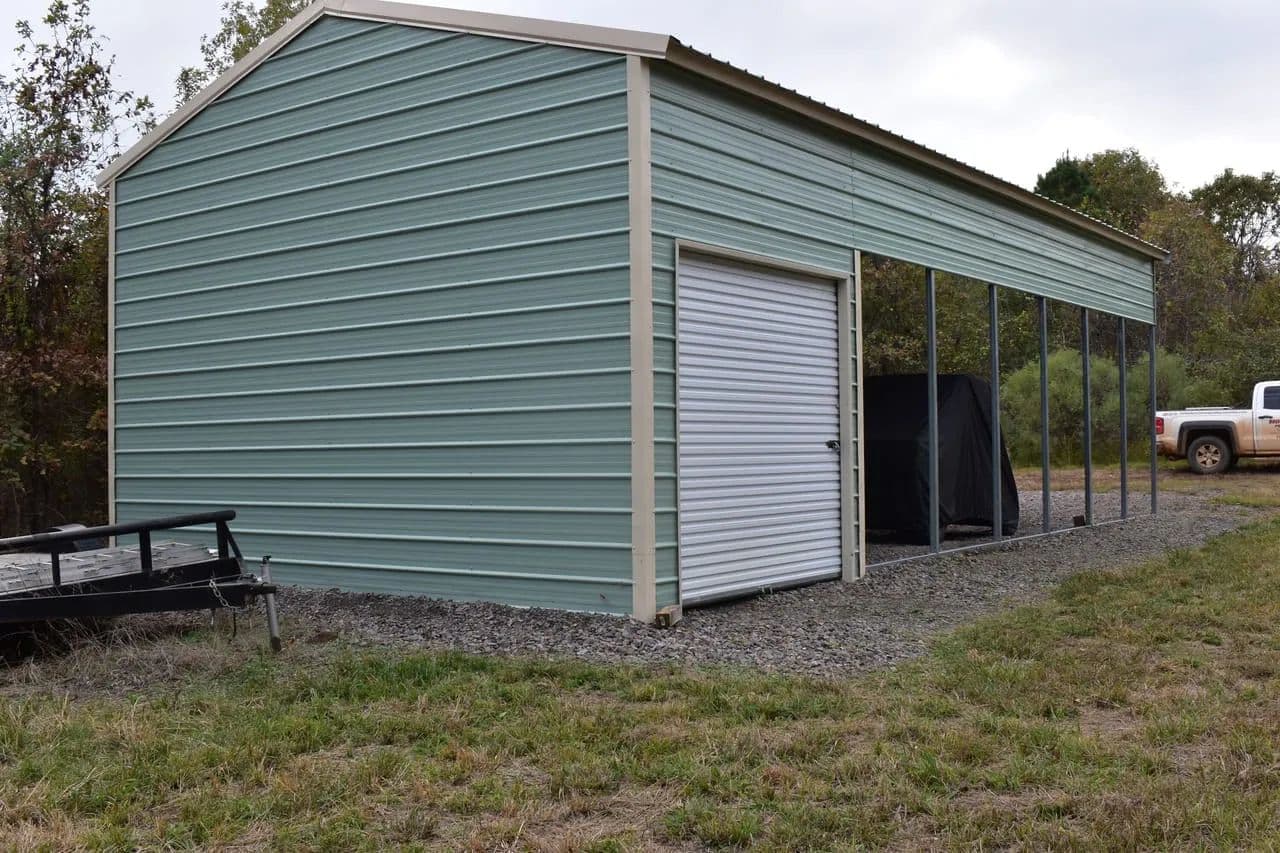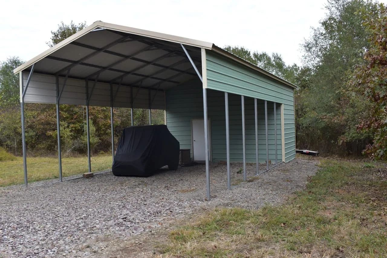 New Storage Building: Spacious building with canopy cover large enough for a travel trailer, side-by-side, tractor, or even bunks for overnight stays.