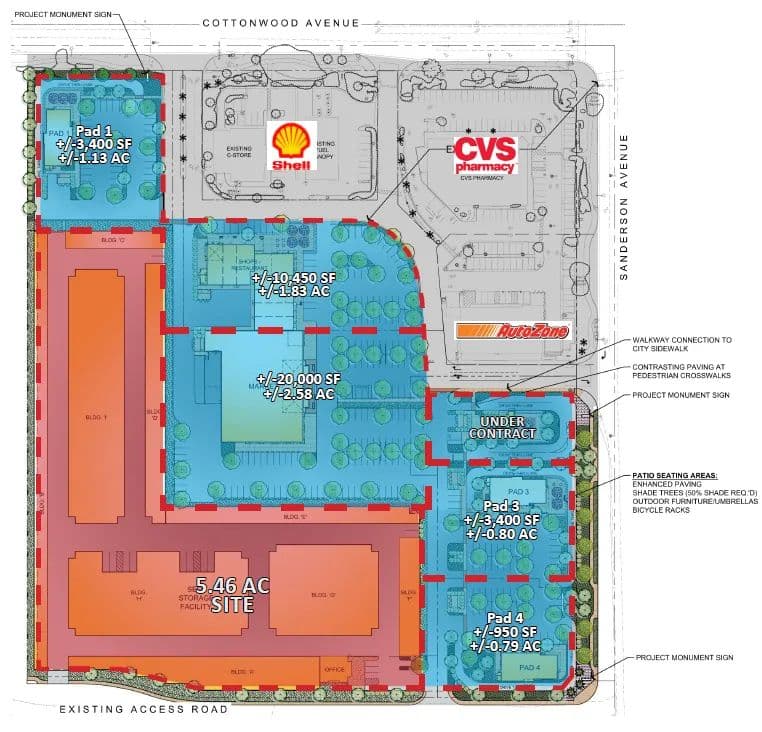 Located in the heart of San Jacinto, Riverside County, this ±5.46-acre site presents a prime opportunity for a self-storage developer to enter a rapidly growing residential and commercial corridor. The property is nearly fully entitled for a self-storage facility, with full approvals anticipated in Q3 2025. Situated at the signalized intersection of Sanderson Avenue and Cottonwood Avenue, the site offers exceptional visibility with ±461 feet of frontage on Sanderson and ±255 feet on Cottonwood, benefiting from high traffic volumes of over 35,000 cars per day.