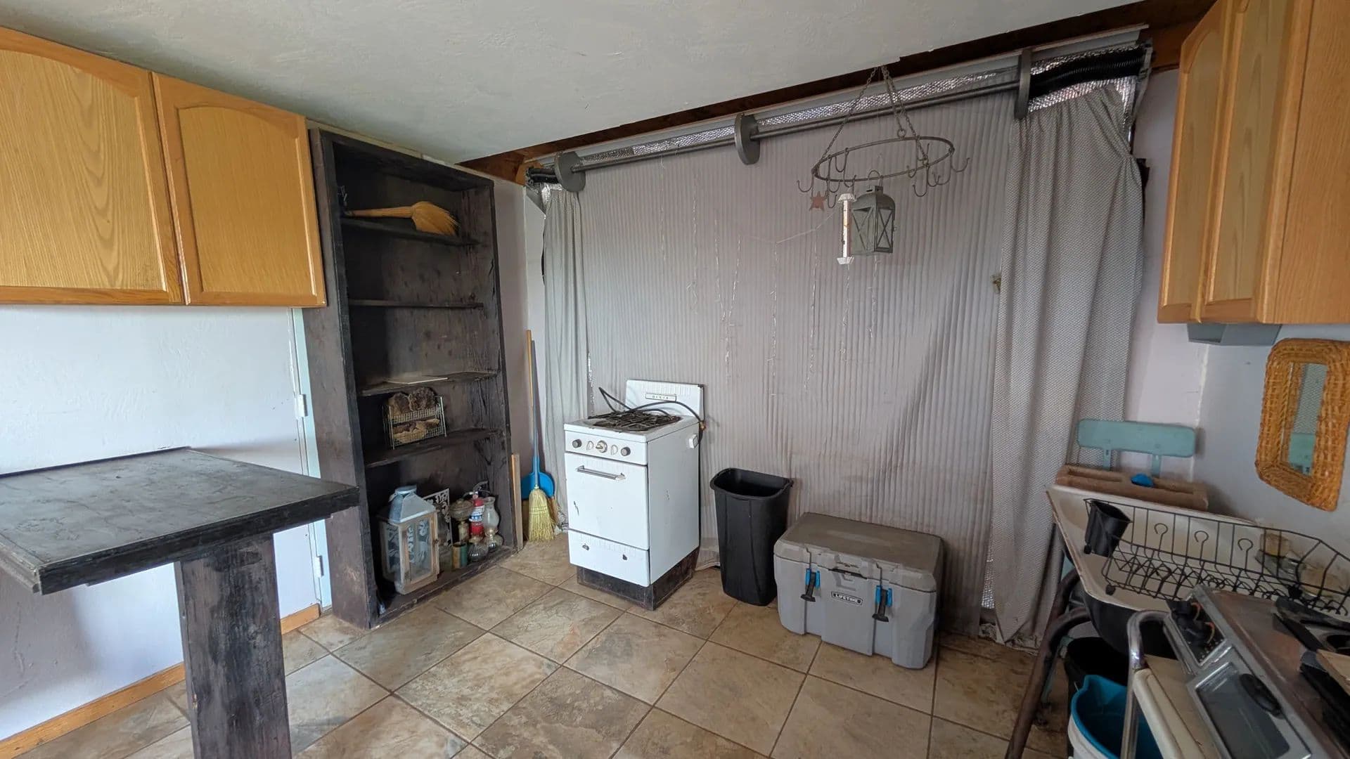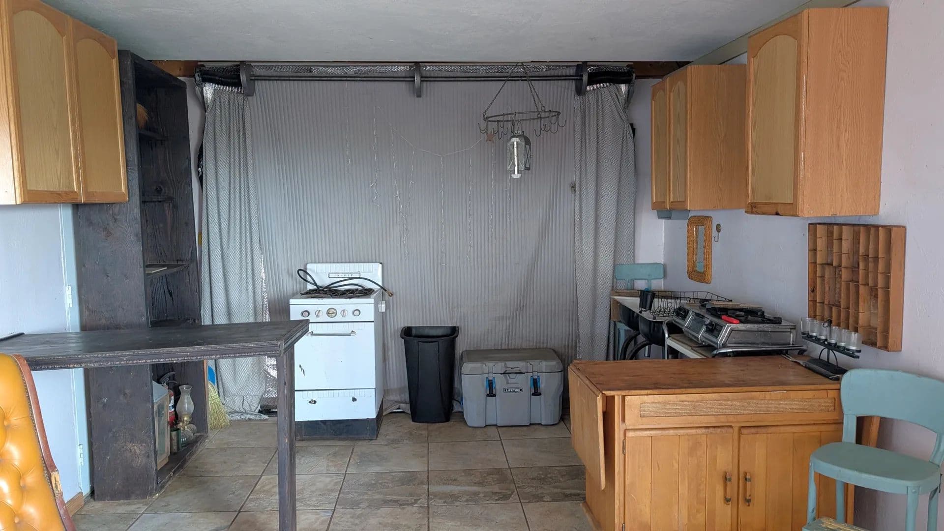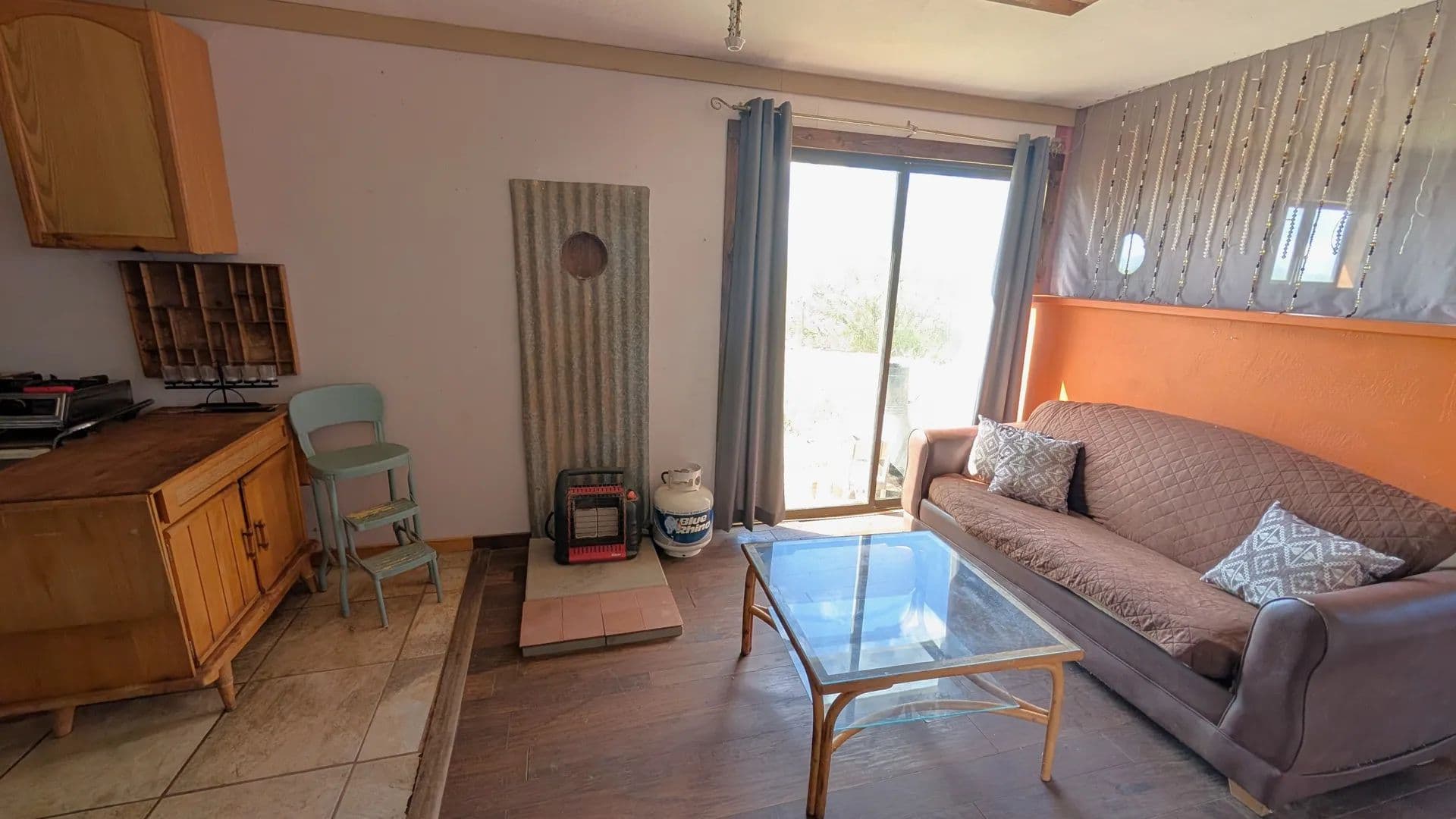 A Mennonite-built storage shed has been thoughtfully converted into a tiny home, complete with a metal roof, a place for a wood-burning stove/fireplace, and attic storage space. The layout provides room for a bedroom, living area, and kitchen. A propane-ready stove is in place, ready to be connected to your tank for cooking convenience.