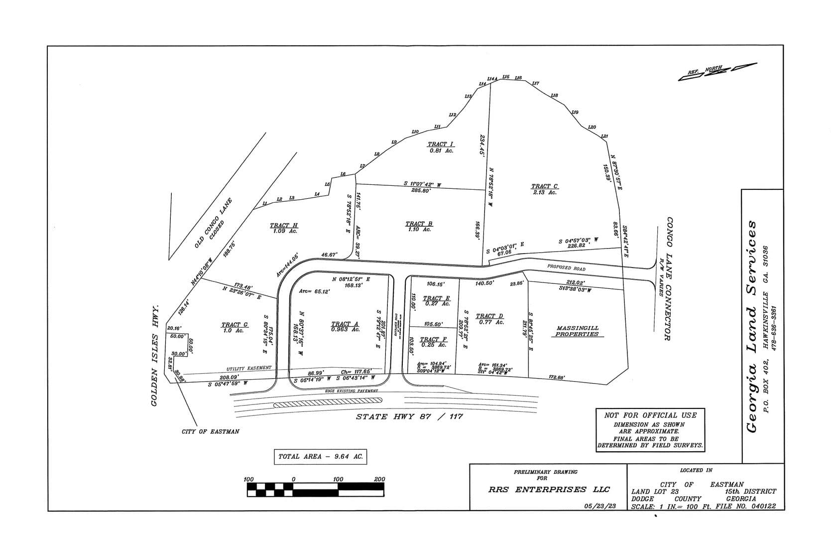 0.25 Acre - 2.32 Acre Tracts (See Plat Page 2 brochure) Divisible Lots will be filled and rough graded with utilities in place; stormwater retention pond on Tract I Two (2) access points to Griffin Avenue (HWY 87) and one (1) access road to Congo Lane Connector Zoned Commercial TRACT A: