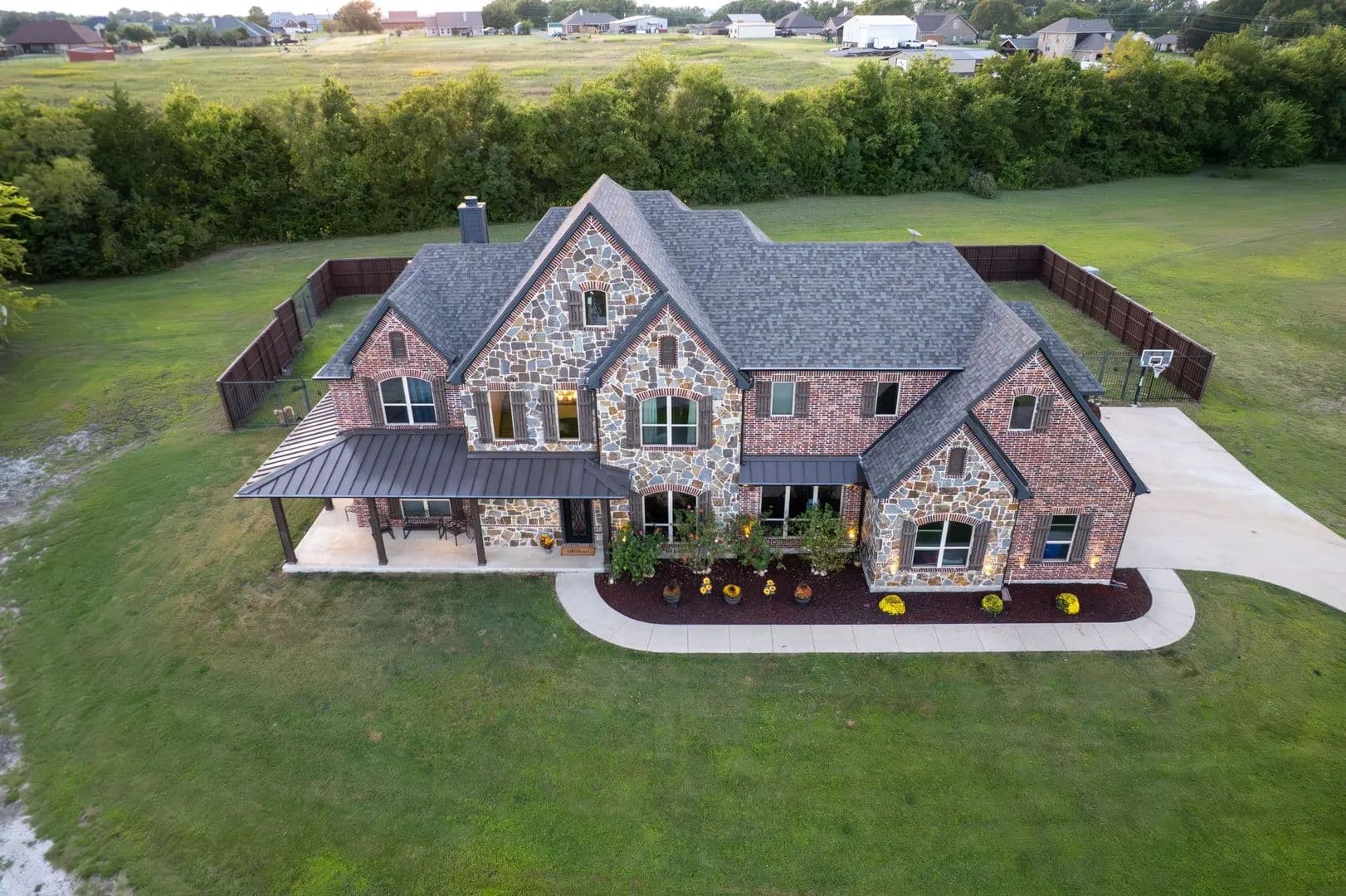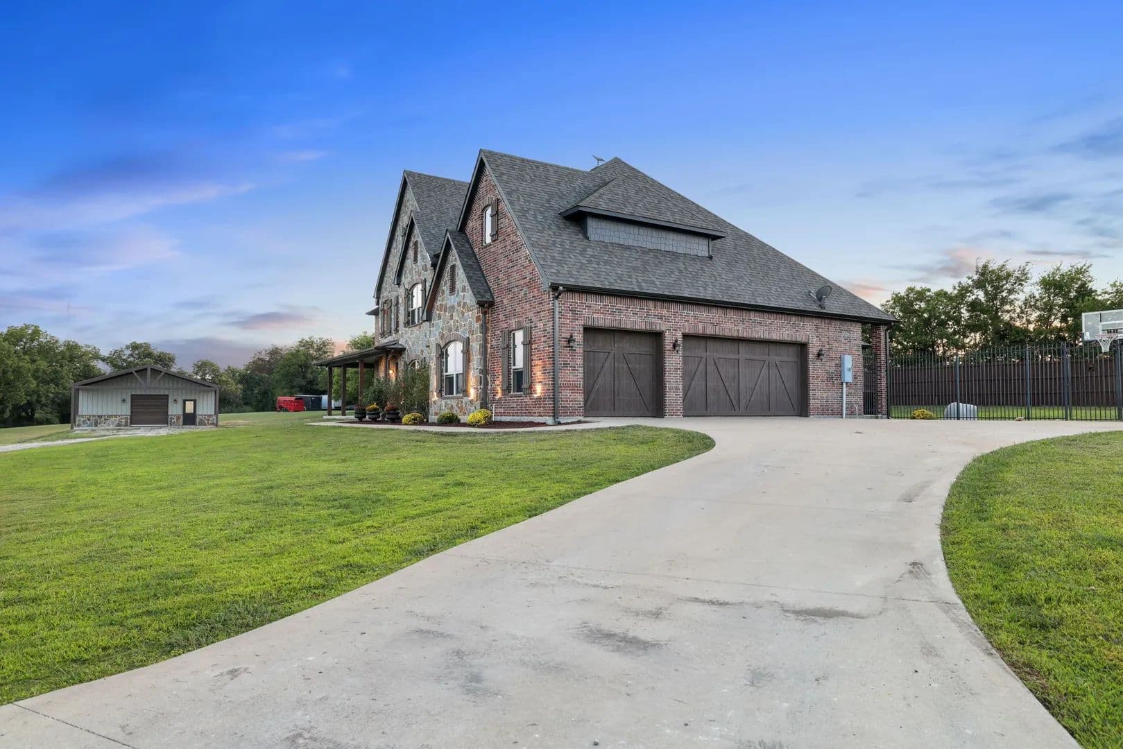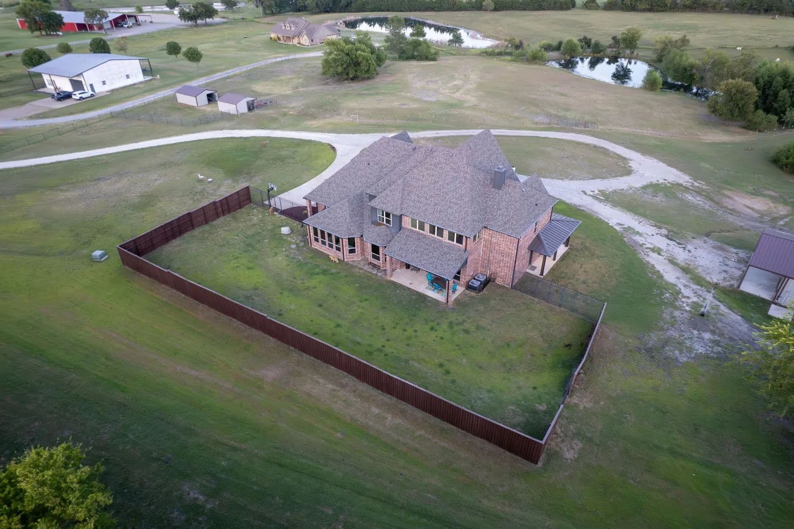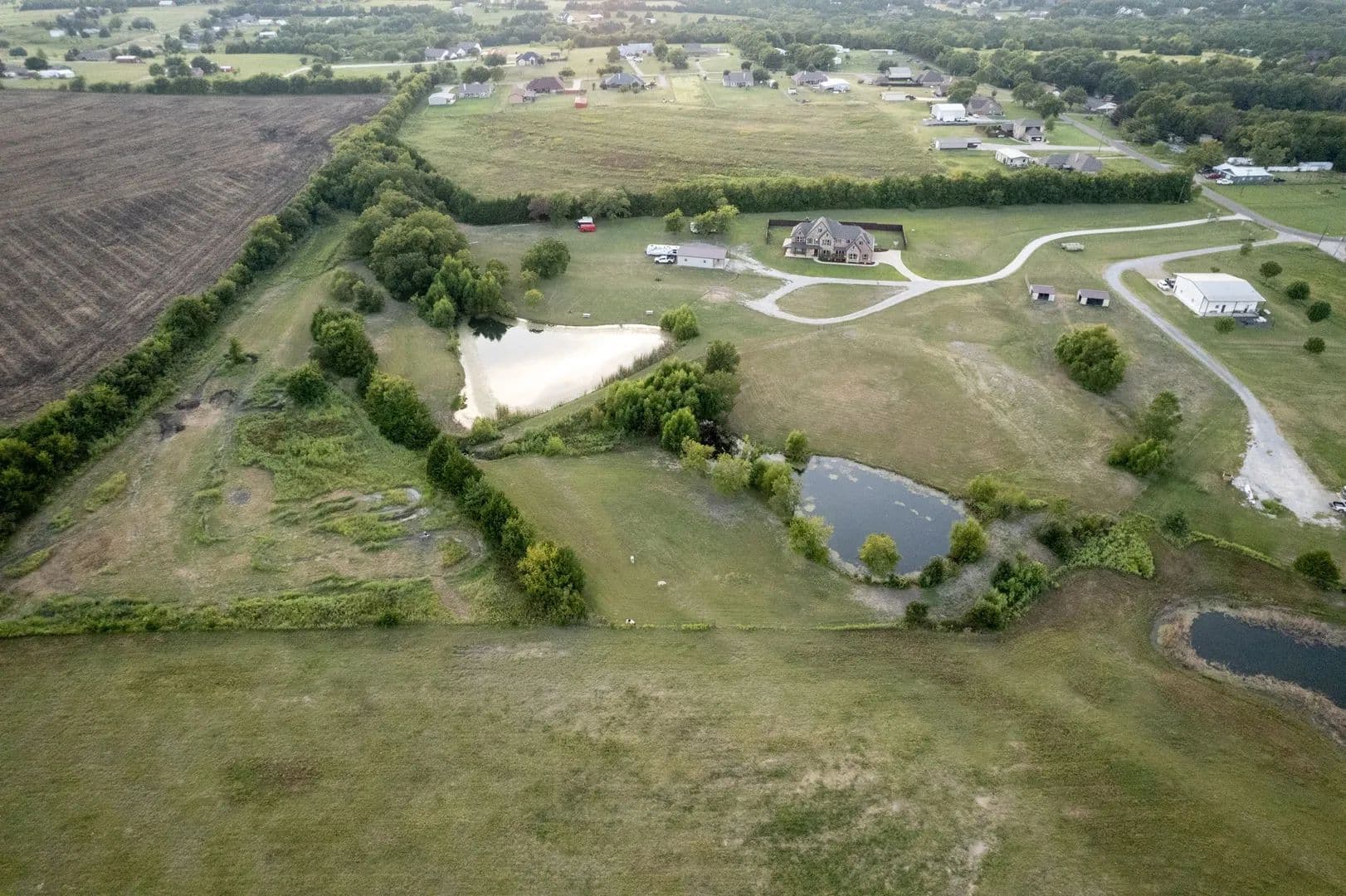 WELCOME TO YOUR OWN SLICE OF PARADISE, WHERE COUNTRY LIVING MEETS REFINED COMFORT! Set on 13.28 picturesque AGG EXEMPT acres with two stocked ponds, mature trees, and sweeping countryside views, this custom-built rock-and-brick home offers peace, privacy, and luxury in one beautiful package. Inside, the main living area wows with a soaring 20-ft ceiling, wood crossbeams, and a floor-to-ceiling stone fireplace—perfect for cozy evenings. The chef’s kitchen features an 8-ft island, custom cabinetry with under-cabinet lighting, black stainless appliances, granite counters, a walk-in pantry, and a breakfast nook with its own TV for relaxed mornings. Also, downstairs are a spacious guest or in-law suite, a generous game room, and a dedicated office with elegant 8-ft double doors. Hand-scraped hardwood floors, tall ceilings, graceful chandeliers, and detailed crown molding bring warmth and sophistication throughout the home. Upstairs, the private primary suite offers a tray ceiling, spa-inspired travertine bath with dual shower heads, a jetted tub, and an enviable walk-in closet with seasonal storage. Two additional bedrooms each include ensuite baths and walk-in closets. The utility room is thoughtfully designed with a sink, drying rack, and dual attic access, including one walk-out attic with abundant storage. Outdoors, enjoy endless possibilities: a large, covered patio for entertaining, a 30’x40’ shop with electricity and RV hookup, sprinkler system, and two loafing sheds for animals. A charming, gated entrance with stone columns, Texas-star gate, and black pipe fencing welcomes you, while the expansive backyard—enclosed by an 8-ft privacy fence—offers plenty of room to add your dream pool.