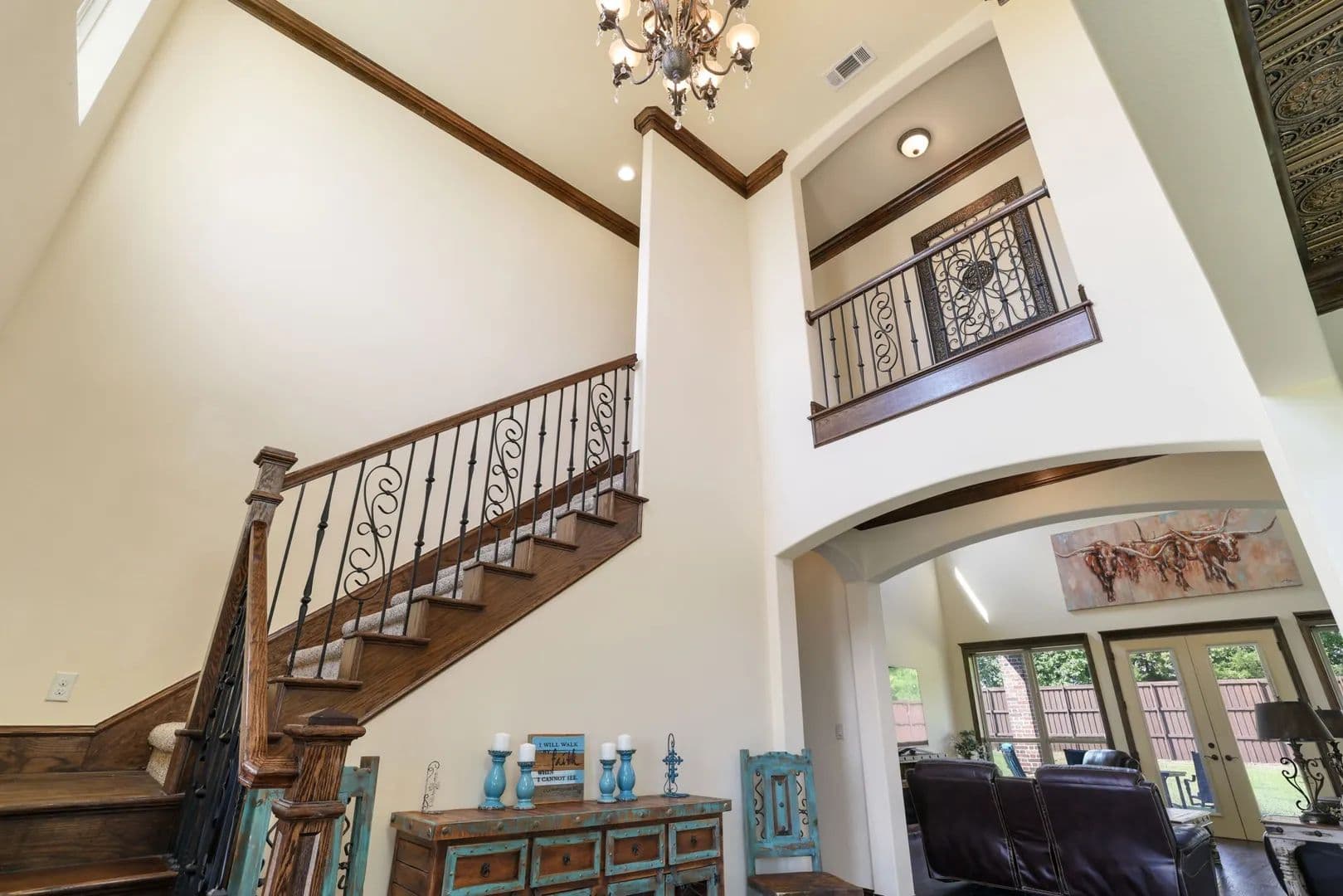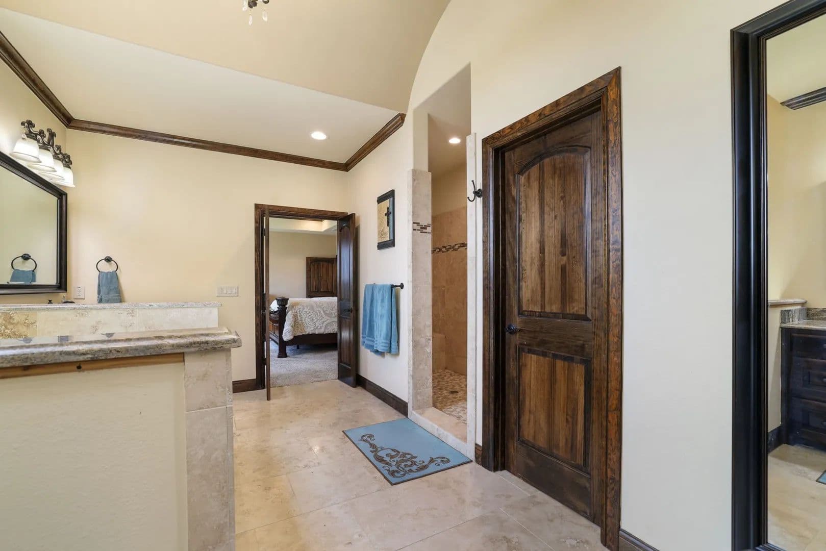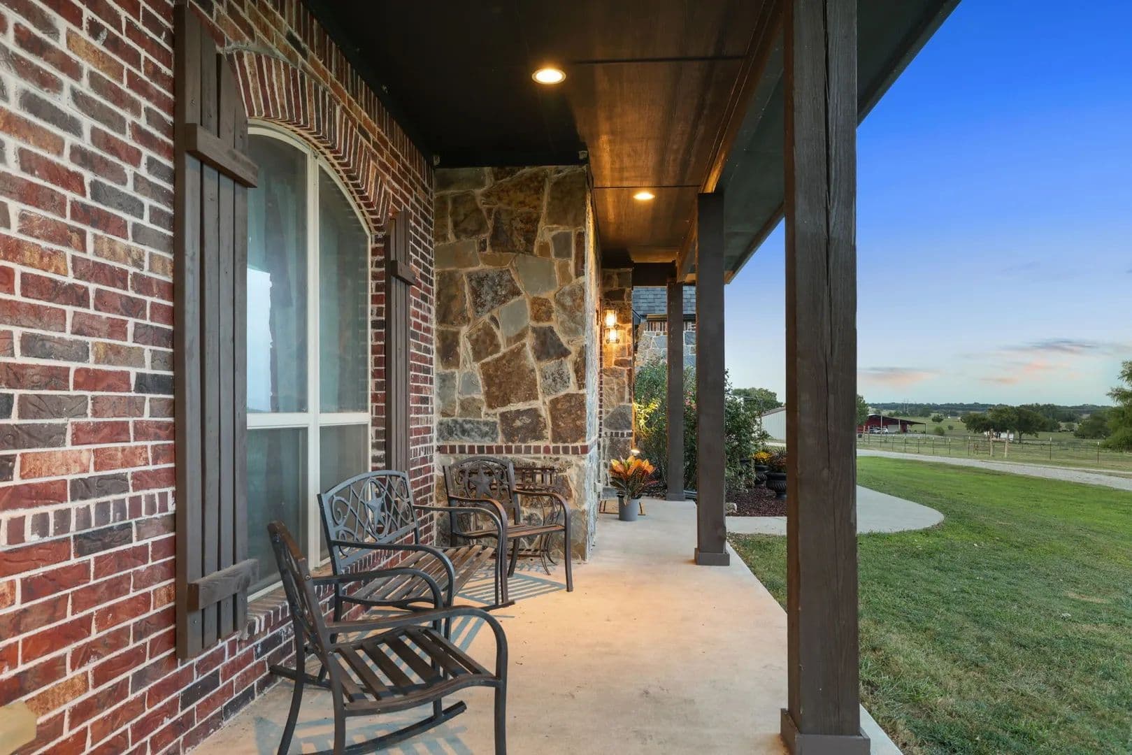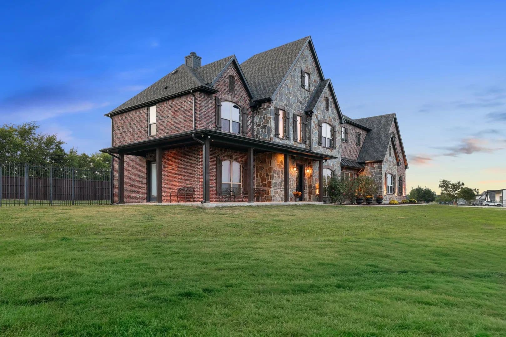 WELCOME TO YOUR OWN SLICE OF PARADISE, WHERE COUNTRY LIVING MEETS REFINED COMFORT! Set on 13.28 picturesque AGG EXEMPT acres with two stocked ponds, mature trees, and sweeping countryside views, this custom-built rock-and-brick home offers peace, privacy, and luxury in one beautiful package. Inside, the main living area wows with a soaring 20-ft ceiling, wood crossbeams, and a floor-to-ceiling stone fireplace—perfect for cozy evenings. The chef’s kitchen features an 8-ft island, custom cabinetry with under-cabinet lighting, black stainless appliances, granite counters, a walk-in pantry, and a breakfast nook with its own TV for relaxed mornings. Also, downstairs are a spacious guest or in-law suite, a generous game room, and a dedicated office with elegant 8-ft double doors. Hand-scraped hardwood floors, tall ceilings, graceful chandeliers, and detailed crown molding bring warmth and sophistication throughout the home. Upstairs, the private primary suite offers a tray ceiling, spa-inspired travertine bath with dual shower heads, a jetted tub, and an enviable walk-in closet with seasonal storage. Two additional bedrooms each include ensuite baths and walk-in closets. The utility room is thoughtfully designed with a sink, drying rack, and dual attic access, including one walk-out attic with abundant storage. Outdoors, enjoy endless possibilities: a large, covered patio for entertaining, a 30’x40’ shop with electricity and RV hookup, sprinkler system, and two loafing sheds for animals. A charming, gated entrance with stone columns, Texas-star gate, and black pipe fencing welcomes you, while the expansive backyard—enclosed by an 8-ft privacy fence—offers plenty of room to add your dream pool.
