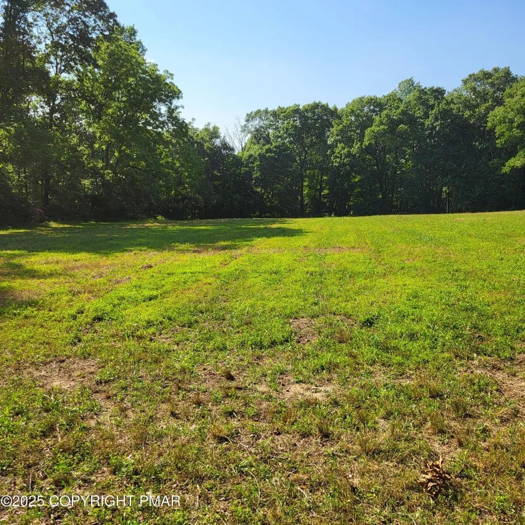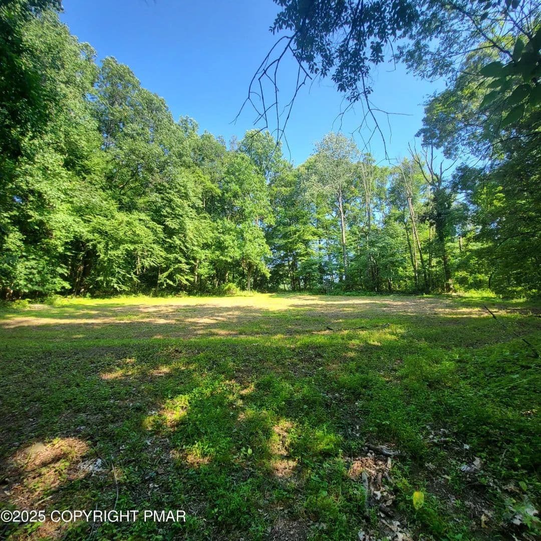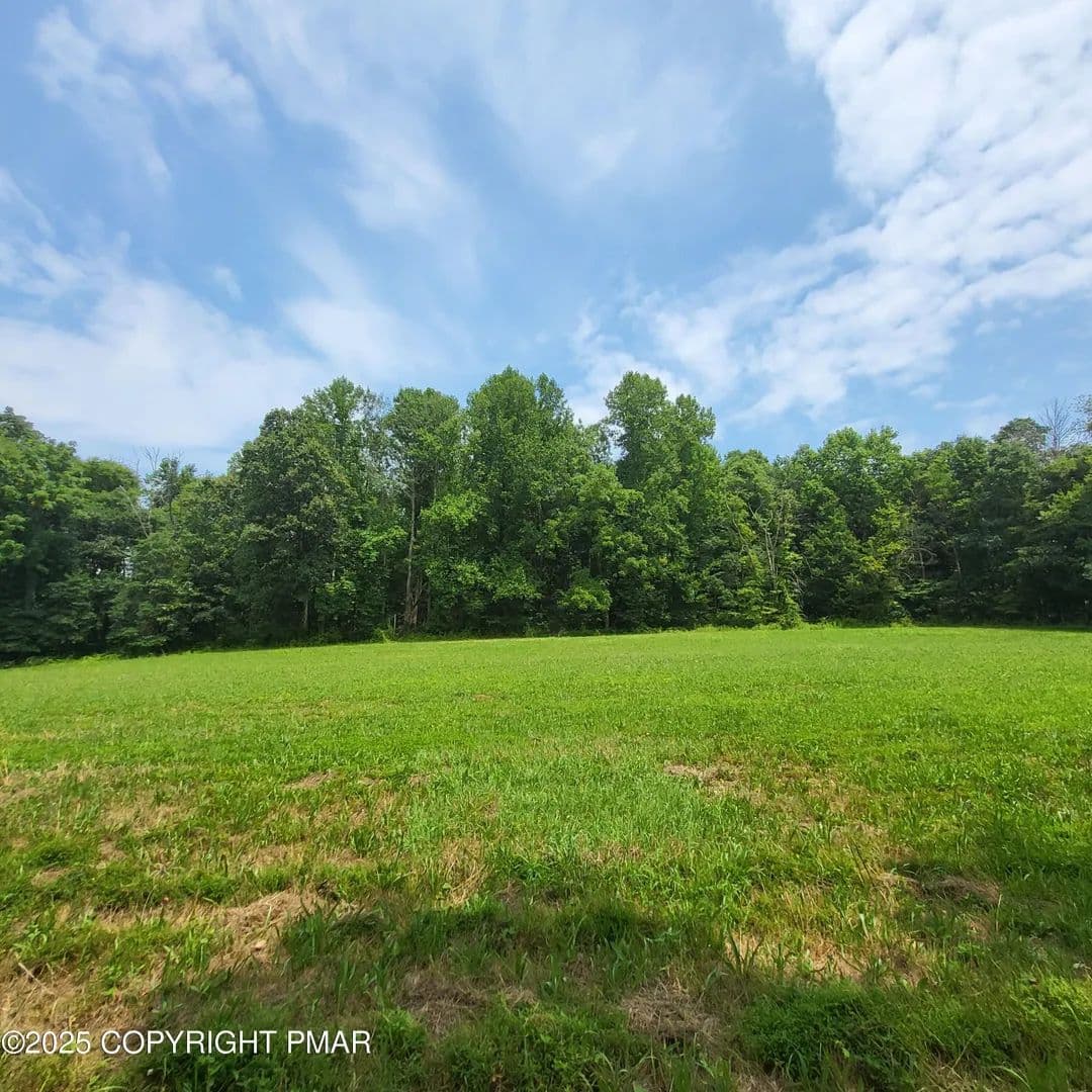 The land features a mix of mature trees and an expansive clearing that provides a natural building site with ample room for landscaping, gardens, or outdoor living spaces. Several informal walking paths trace portions of the clearing's edge and nearby wooded areas. The northern meadow offers gentle shading and natural habitat, while the southern