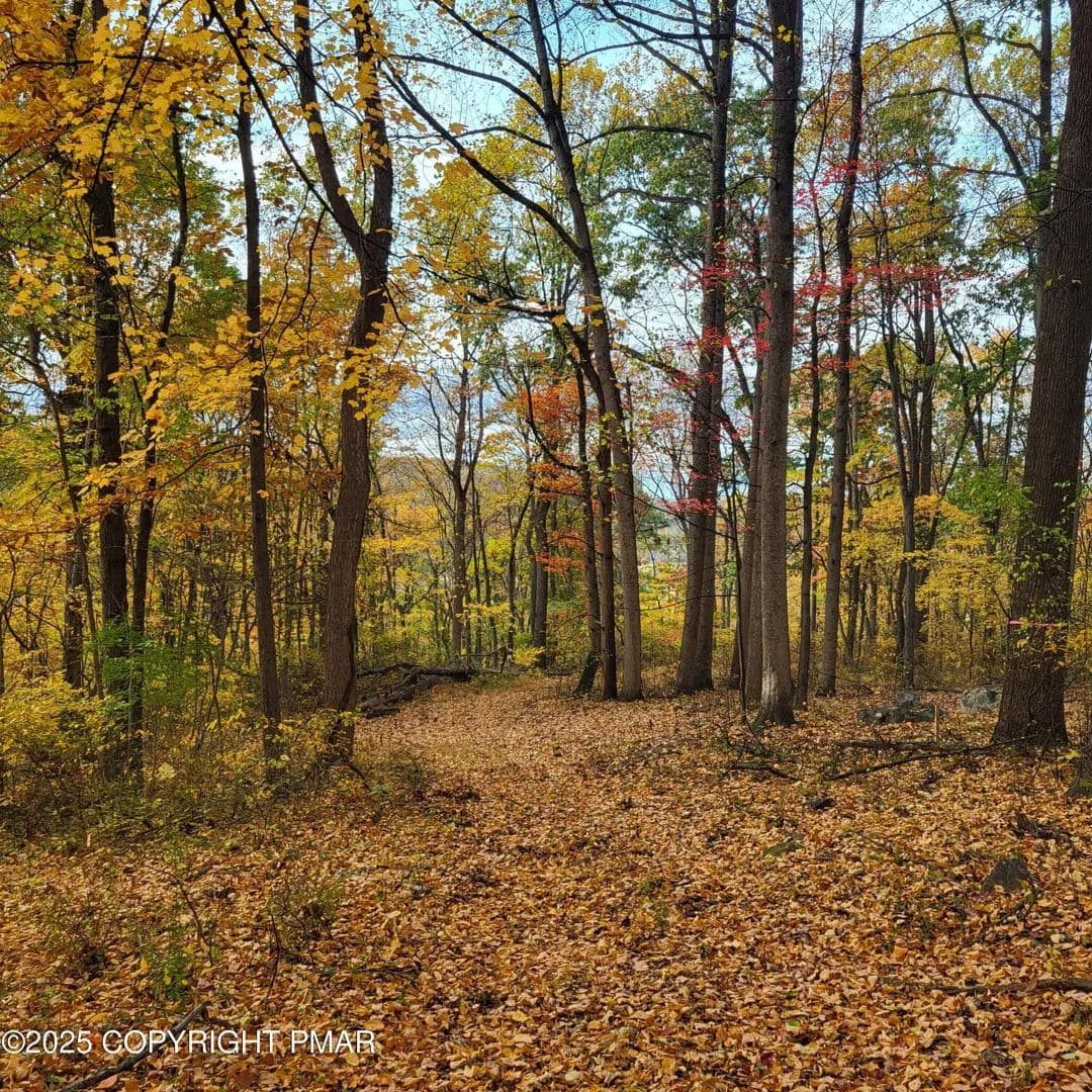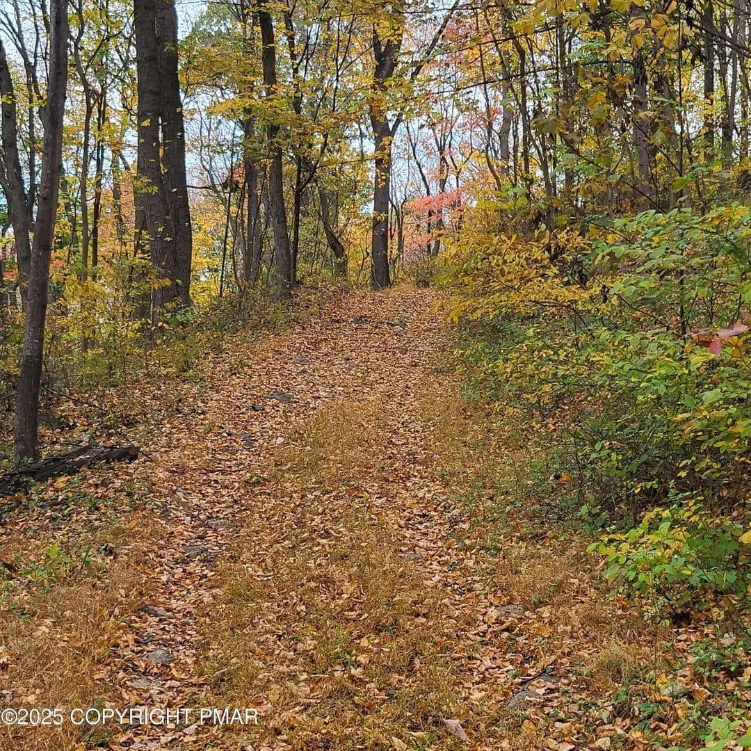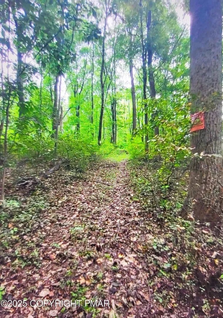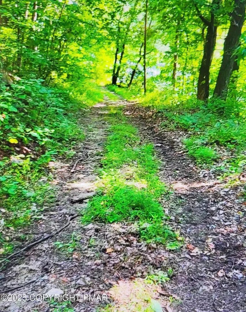 The land features a mix of mature trees and an expansive clearing that provides a natural building site with ample room for landscaping, gardens, or outdoor living spaces. Several informal walking paths trace portions of the clearing's edge and nearby wooded areas. The northern meadow offers gentle shading and natural habitat, while the southern