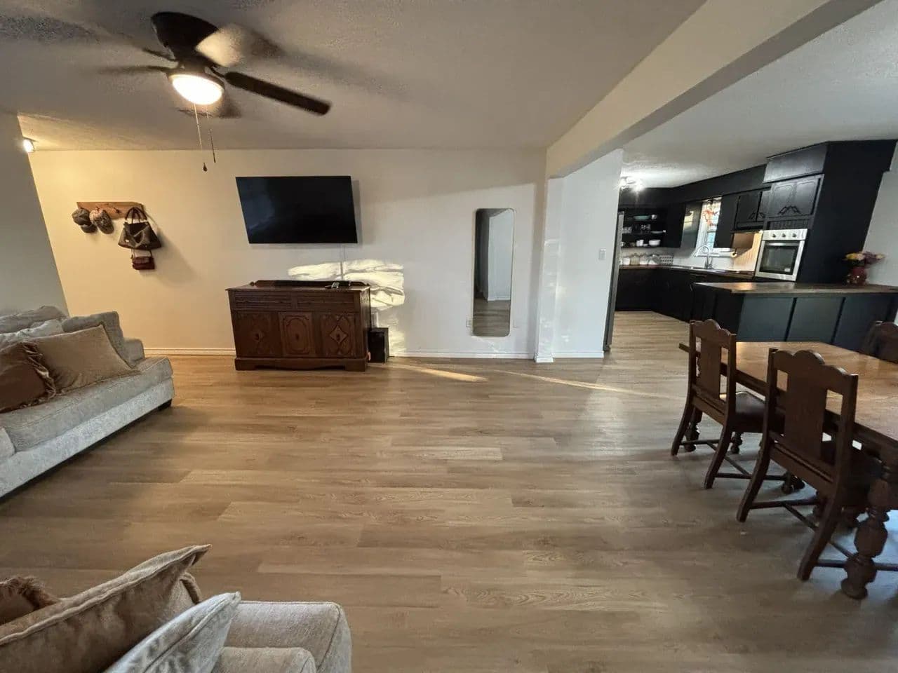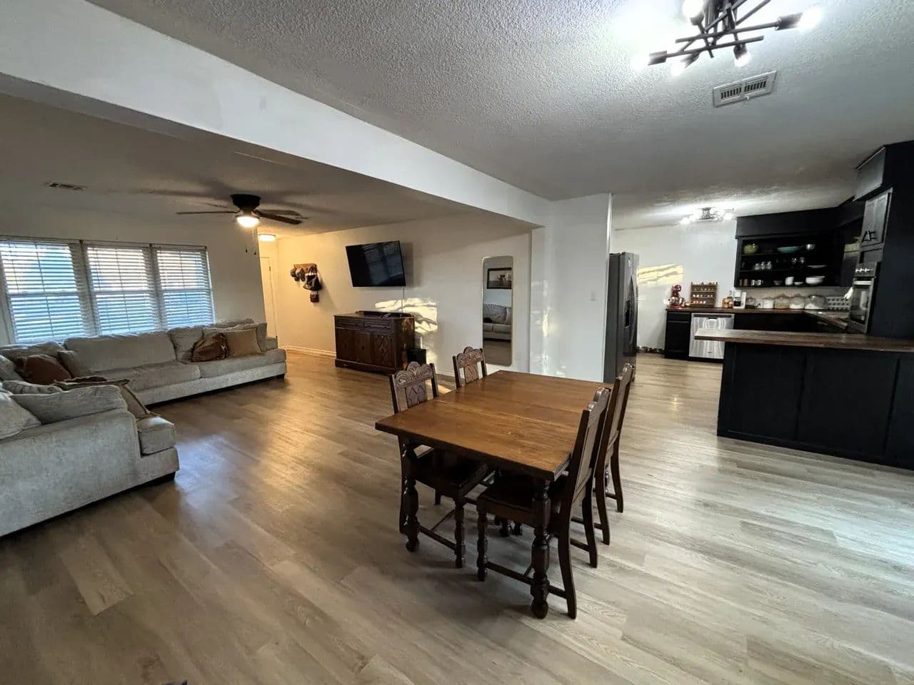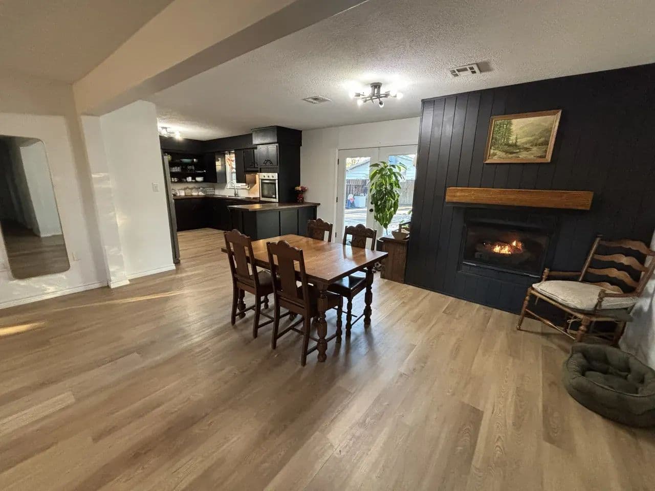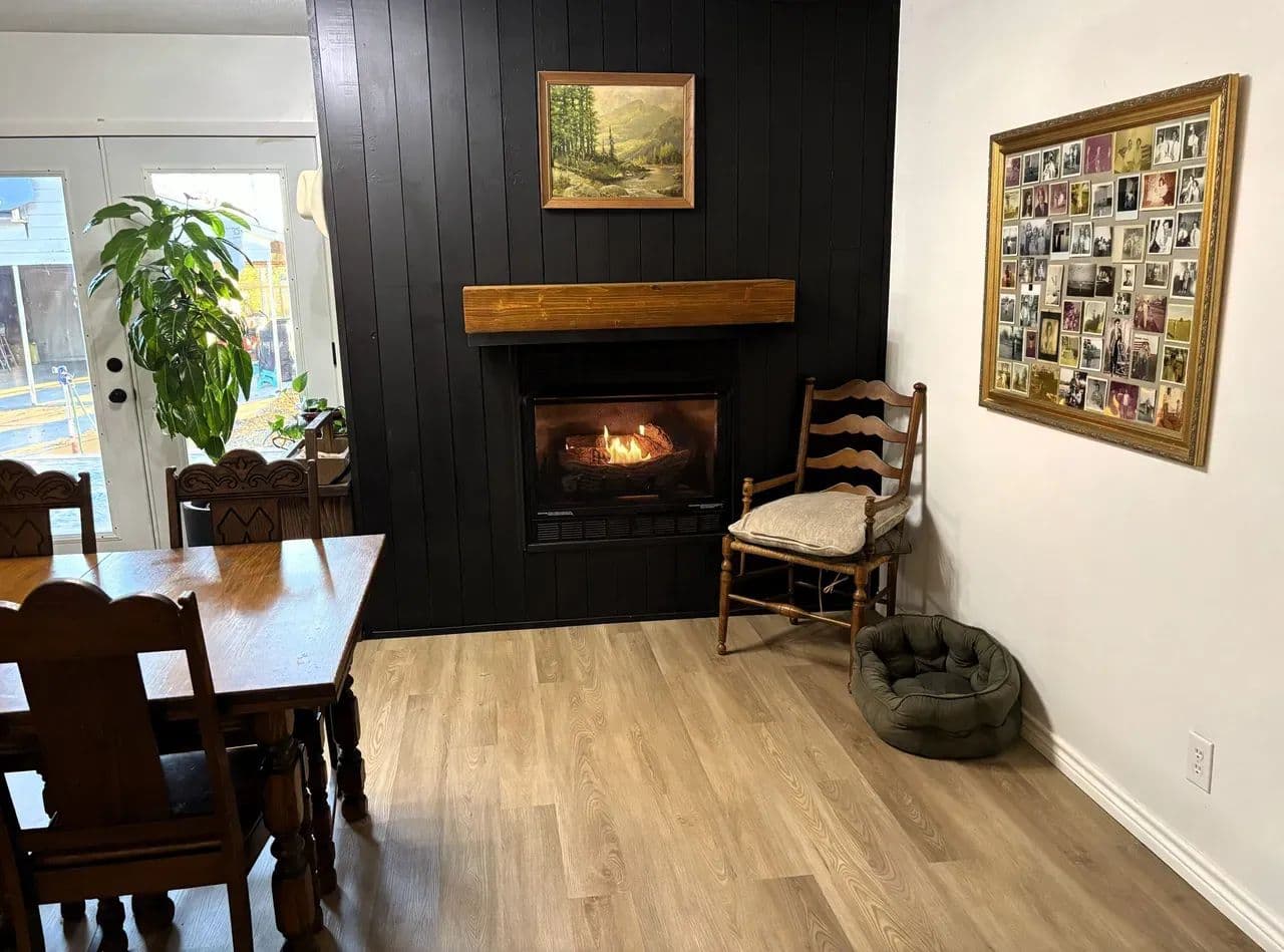 The newly opened floor plan creates a seamless connection between the living and dining areas, making the home feel bright, spacious, and inviting. A gas fireplace makes a strong statement at the center while the kitchen delivers modern efficiency with updated appliances, crisp finishes, and plenty of space for cooking or gathering with friends and family.