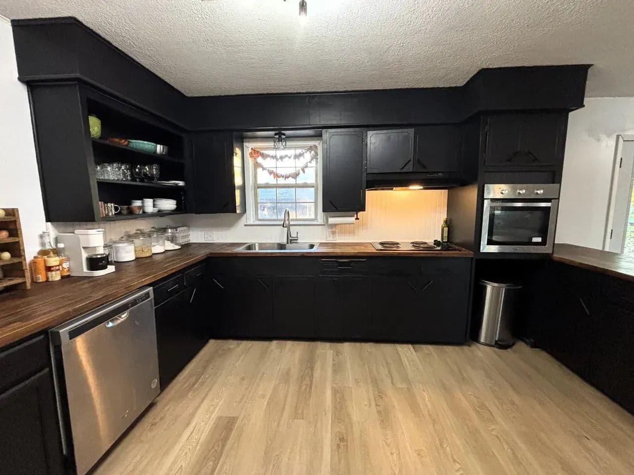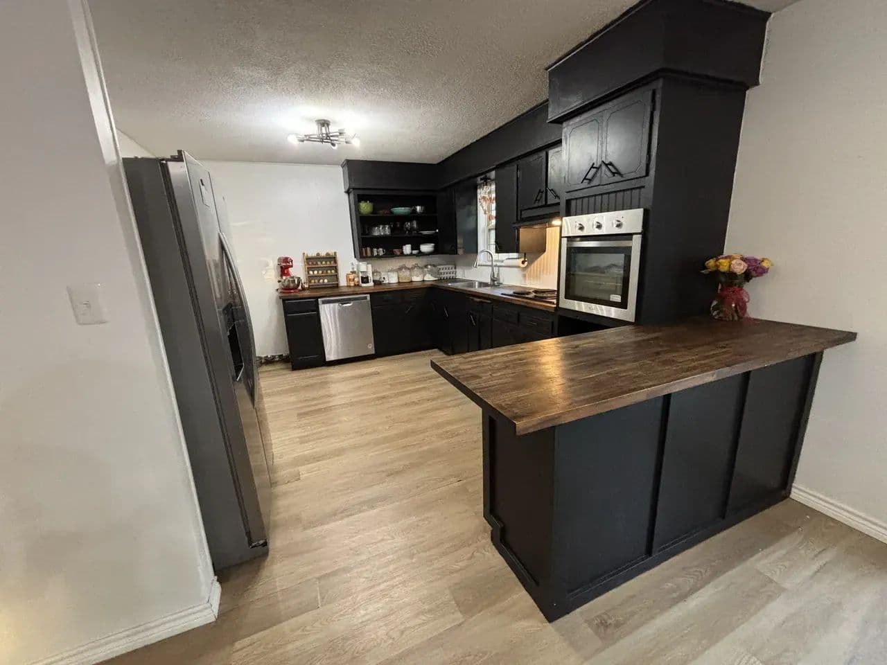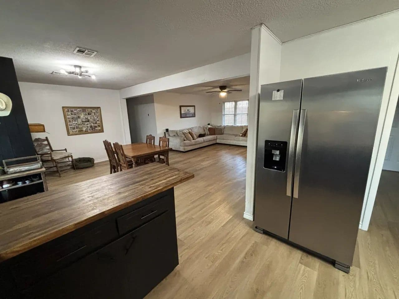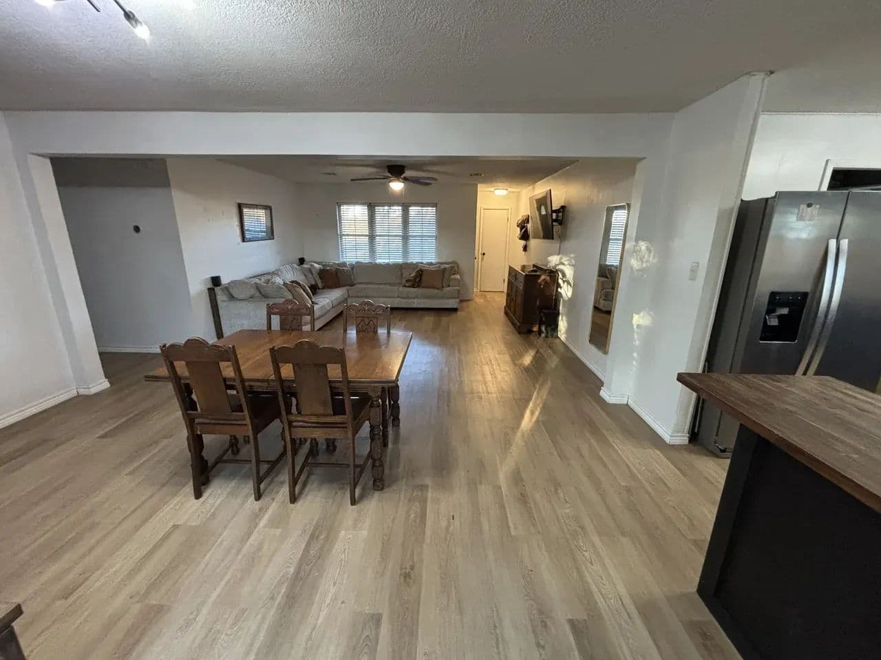 The newly opened floor plan creates a seamless connection between the living and dining areas, making the home feel bright, spacious, and inviting. A gas fireplace makes a strong statement at the center while the kitchen delivers modern efficiency with updated appliances, crisp finishes, and plenty of space for cooking or gathering with friends and family.
