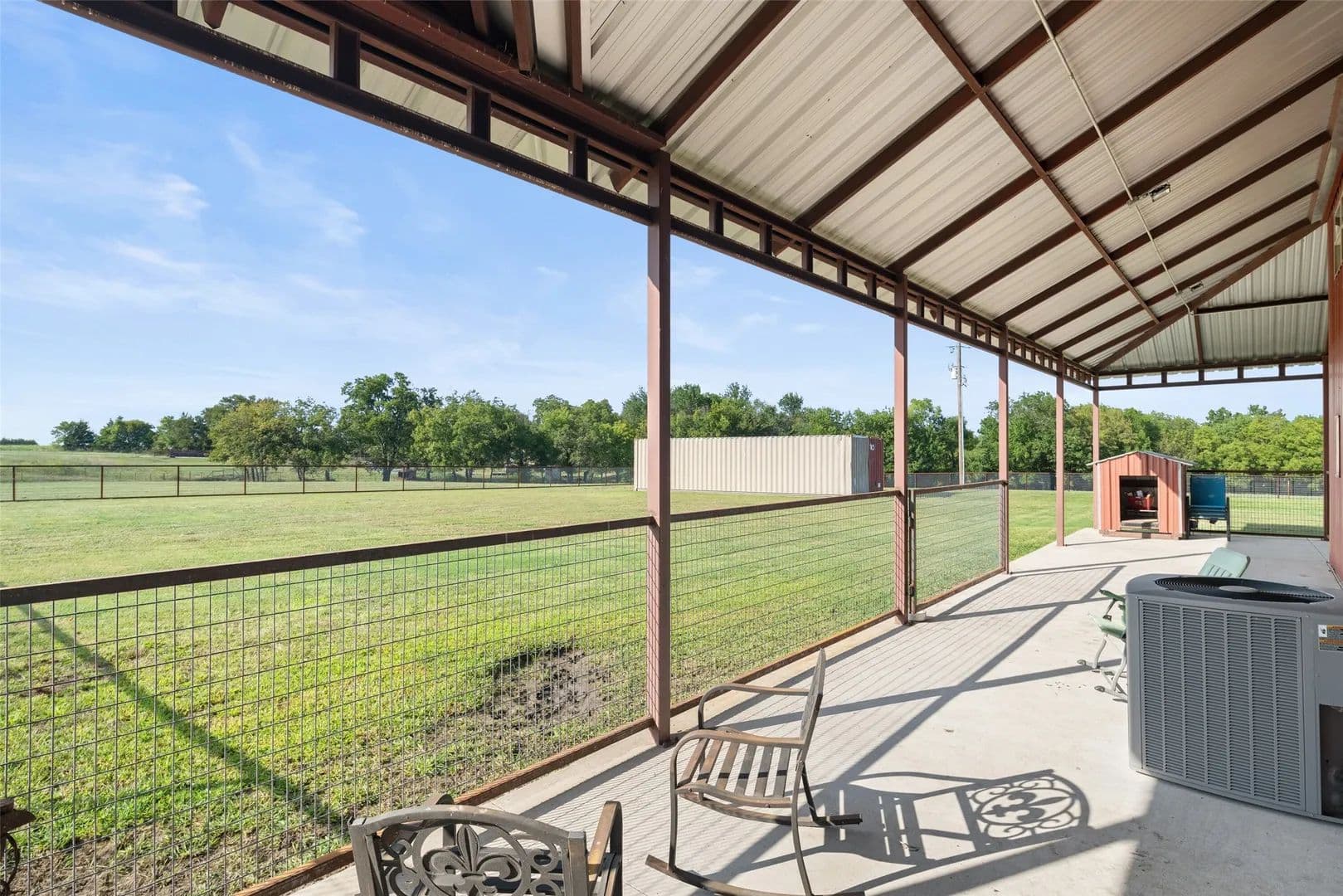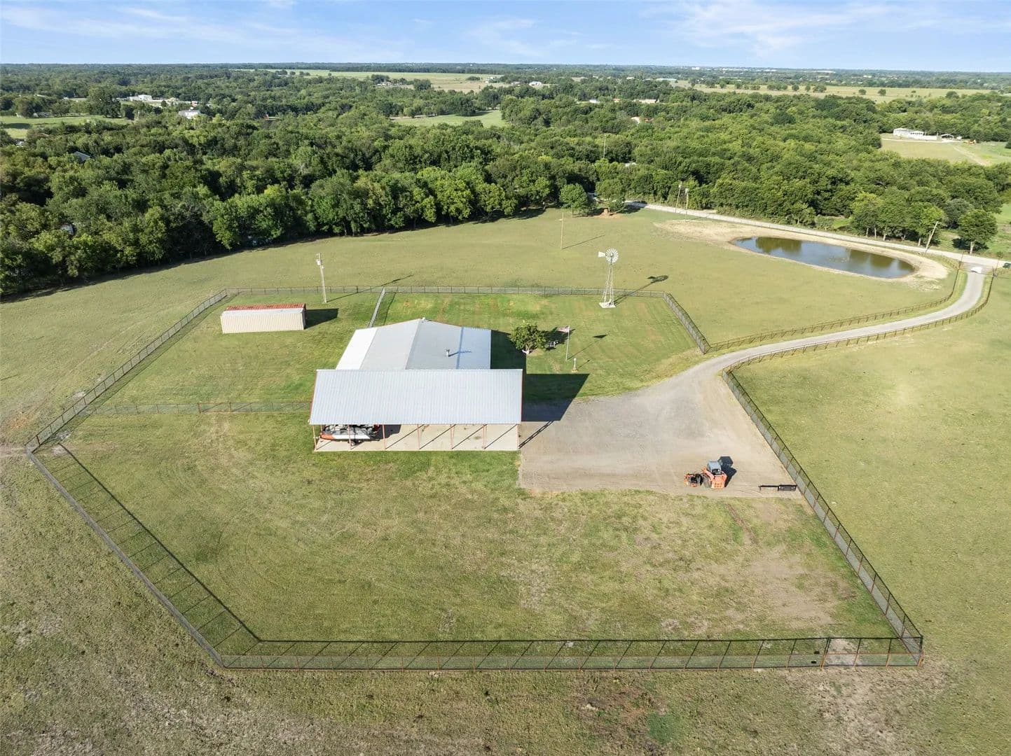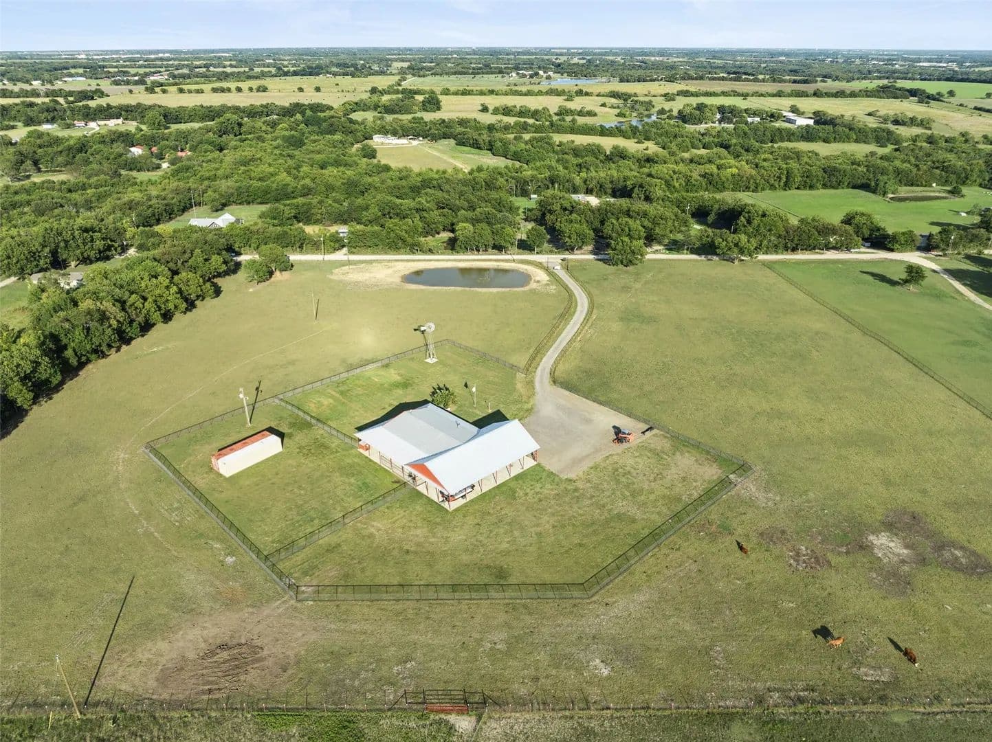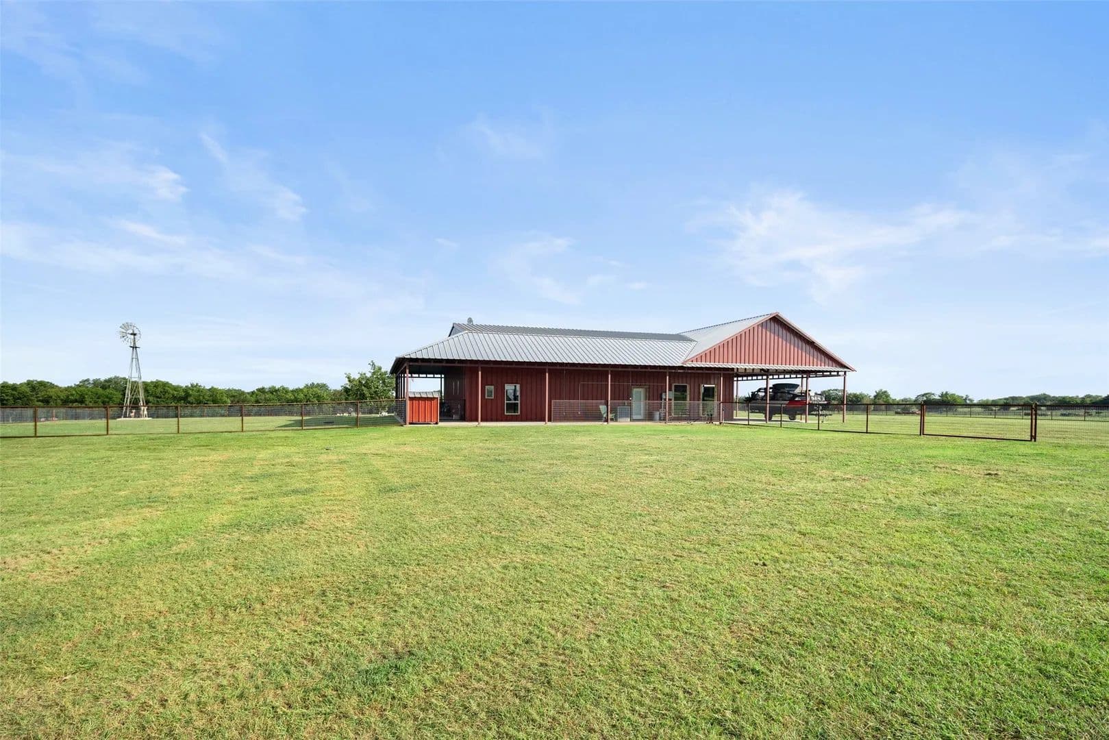 As you pass through the custom gated entrance, the majestic ranch views unfold. Perched on a gentle hilltop, a stunning barndominium stands alongside a classic windmill. The surrounding pastures are alive with the sight of cattle, the views are picturesque. More than a property it's a private retreat where the big sky and quiet landscape create a sense of freedom. Custom double doors with Texas star accents say come on in. The home's soaring ceilings and open floor plan are breathtaking. The living area easily accomodates big sofas, the wood burning stove is a masterpiece. A stunning kitchen with a rugged, chiseled granite island serves as the centerpiece. The faux stone walls add texture, the entire kitchen is a visual delight, stainless appliances are top of the line. The primary suite is a true retreat, with a relaxing en-suite BA. For those working from home or seeking a quiet space for hobbies or home school, the home office provides the perfect, sunlit spot to focus and create. With 4 BR, 2.1 BA, this home is designed for both comfort and convenience. Hickory hardwood floors upstairs, tasteful knotty pine tongue and groove walls, beams, are only a few of the features that add warmth to this wide open space. The over 3,000 sq ft wraparound porch showcases the ranch, enjoy quiet country sunsets or watch the storm roll in. Extended covered parking will accomodate the height of an RV, multiple vehicles. For the discerning rancher. With over 12+ acres of prime agricultural land, fenced and cross-fenced for efficient, safe cattle management. The quality of the high-end fencing speaks to the property's superior standards. A beautiful stock tank with fountain, provides a reliable water source for your herd. Located within competitive Trenton ISD, close to State HWY 121 & 78, shopping and restaurants. Major thoroughfares provide quick and easy access to McKinney, Sherman, Melissa, Anna, Bonham, Greenville.