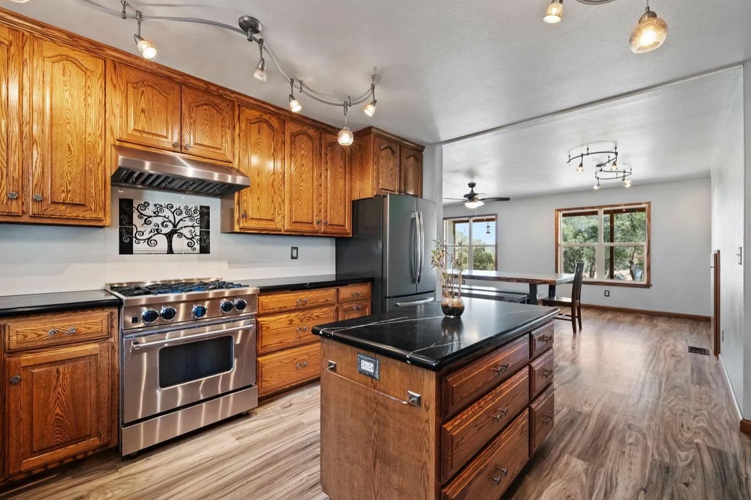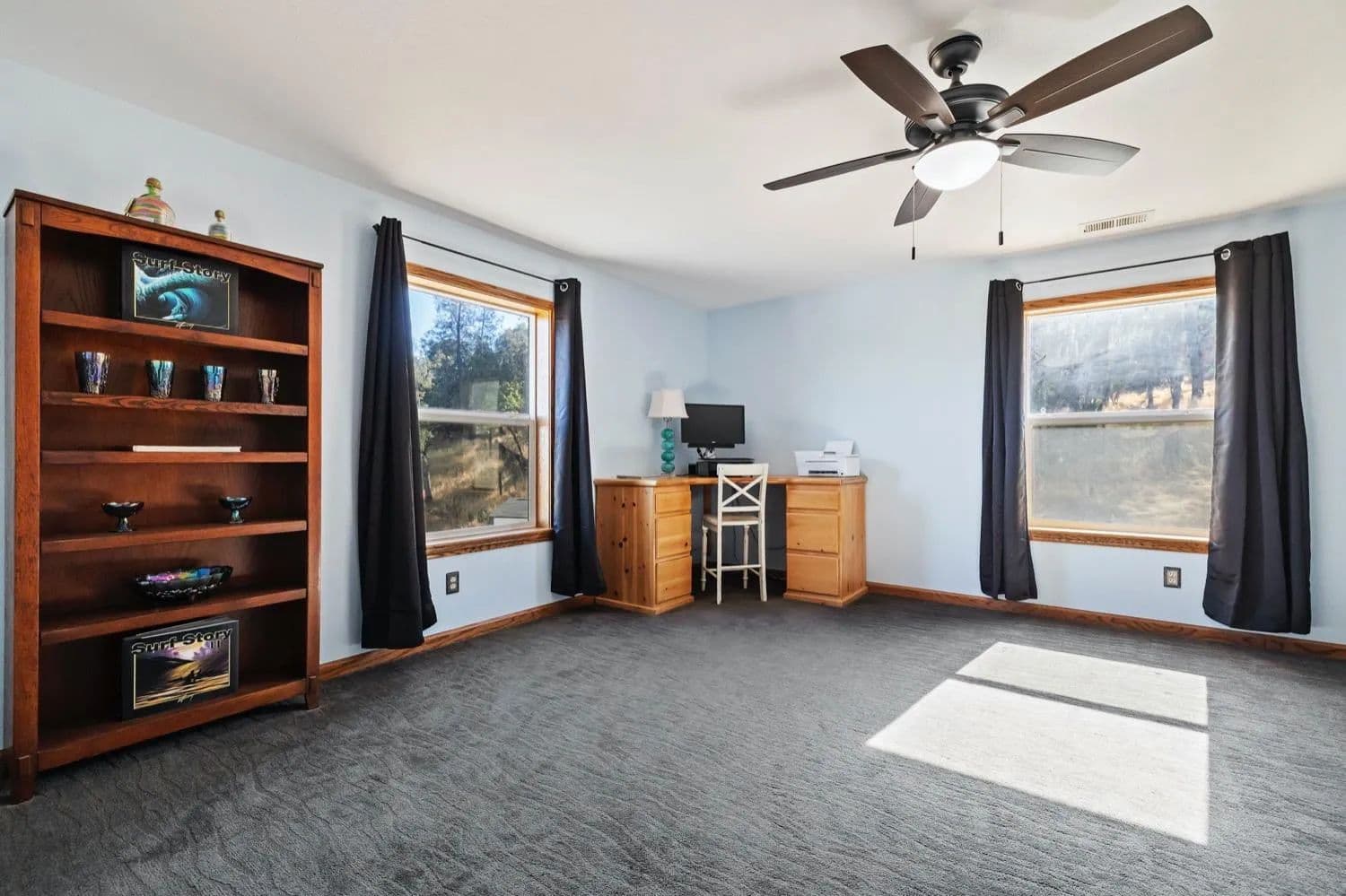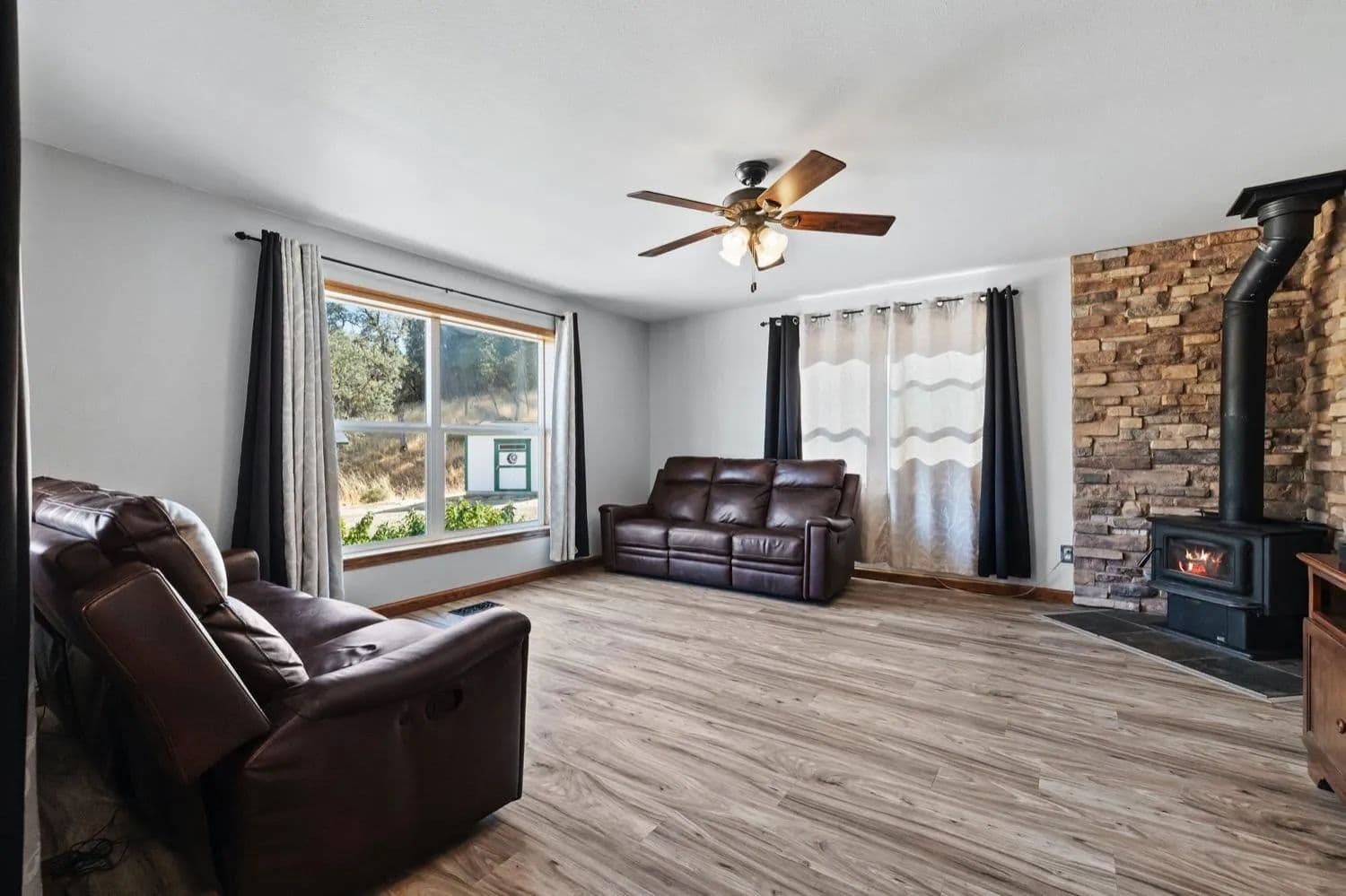 Motivated sellers would like to welcome you to your dream ranch! Experience sustainable living at this turn-key ranch on 21 acres of rolling hillside, bordering thousands of acres of BLM land. This 2,912 sq. ft. custom-built home with 2X6s offers 5-6 bedrooms, 3 full baths, and breathtaking views from every room. Designed for efficiency, it features a kitchen with quartz countertops, a Blue Star Gas Range, custom Italian mosaic tile, and a stainless steel farm sink. The kitchen flows into a spacious dining room, highlighted by a custom 13'x4' live edge pine table. The main floor master suite includes a spa-like ensuite with a two-person stone soaker tub, walk-in tile shower, double vanity, and a California Closets-designed walk-in closet. Upstairs, find four large bedrooms, an office/den, and a full bathroom. The home also includes an oversized laundry/mudroom and a 2.5-car garage with a canning room/man cave. Outside, the property is perfect for ranching with 3 fenced pastures, 2 additional fenced areas, and 3 seasonal creeks. Enjoy a deer-fenced organic orchard, raised garden beds, and multiple outbuildings, including a 1,100 sq. ft. shop, 4 storage sheds, 3 chicken coops, and a covered carport with extensive electrical. The Highland Herd, and other farm animals
