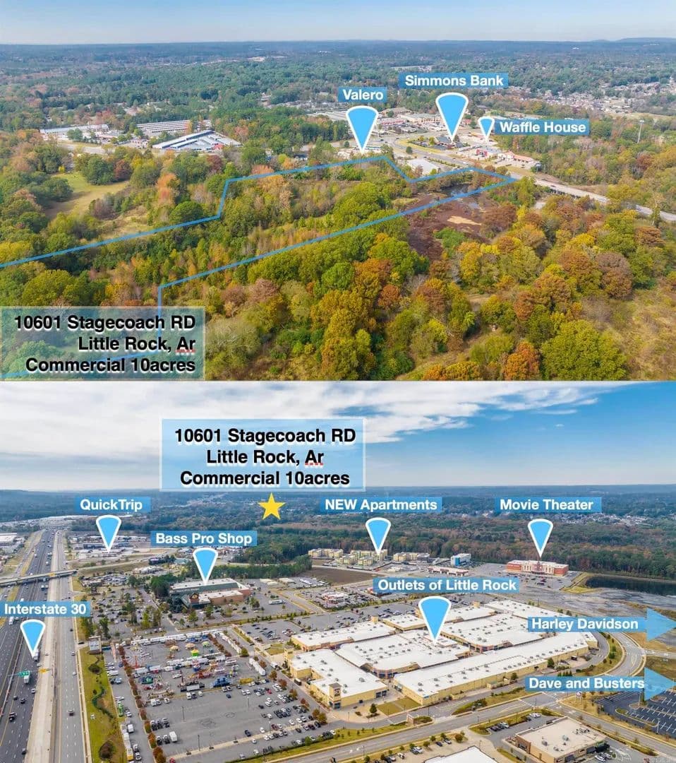 10.88 +/- Acres of Prime Undeveloped Land, less than a half mile from The Outlets, Bass Pro and I-30! Behind Valero. Right off Highway 5, near the busy Otter Creek and Stagecoach intersection. Surrounded by national retailers, restaurants, grocery store and lodging. Great frontage visibility with convenient access to Little Rock, Benton and Bryant. Don't Miss this Development Opportunity! Agents see remarks. ARIEL VIDEO https://youtu.be/xSx9n_wdkFE ***10701 Stagecoach Rd. can also be sold with this property 2 bedroom 1 bath, with 5 acres included. (250K asking price)