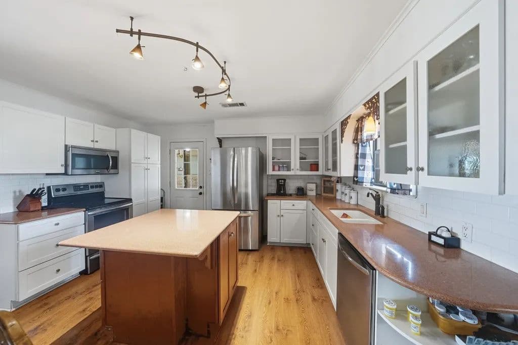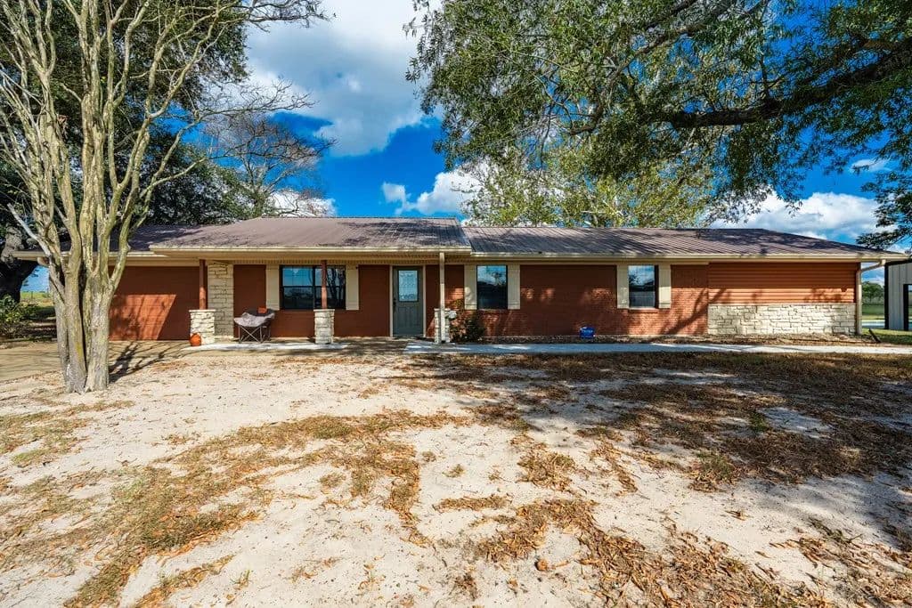 Beautiful countryside setting surrounded by large acreage tracts and impressive ranches. This updated home sits on 12 acres and offers two inviting living areas, one featuring a charming stone fireplace. The large country kitchen opens seamlessly to both living spaces, creating the perfect flow for family and friends to gather. The spacious primary suite captures peaceful countryside views and includes a luxurious bath with soaking tub, walk in shower, and an expansive closet. A 900 sq. ft. metal shop includes a 500 sq. ft. finished living area with a half bath - ideal as a bunk room, guest quarters, or entertainment space- overlooking a sparkling swimming pool.