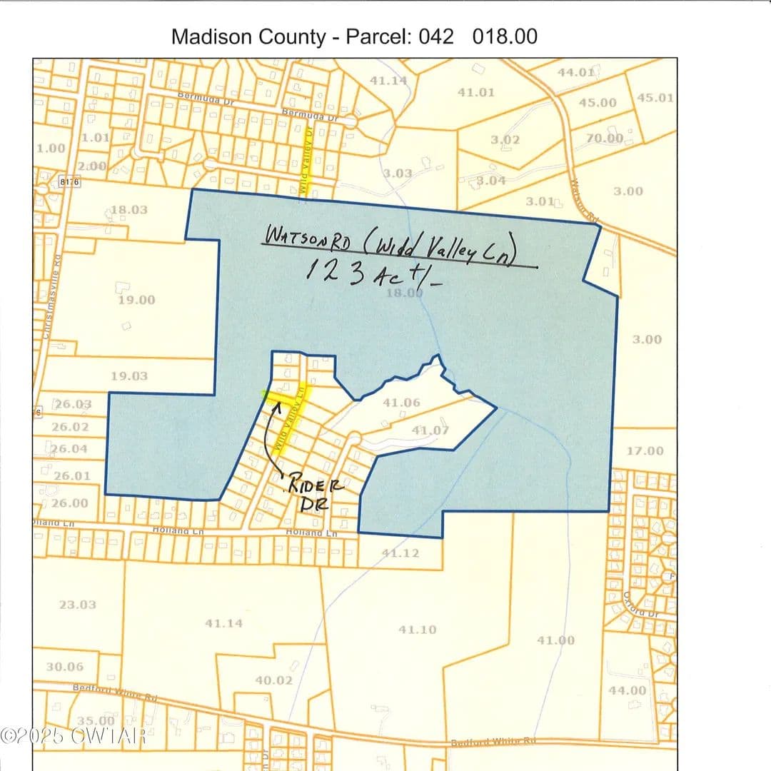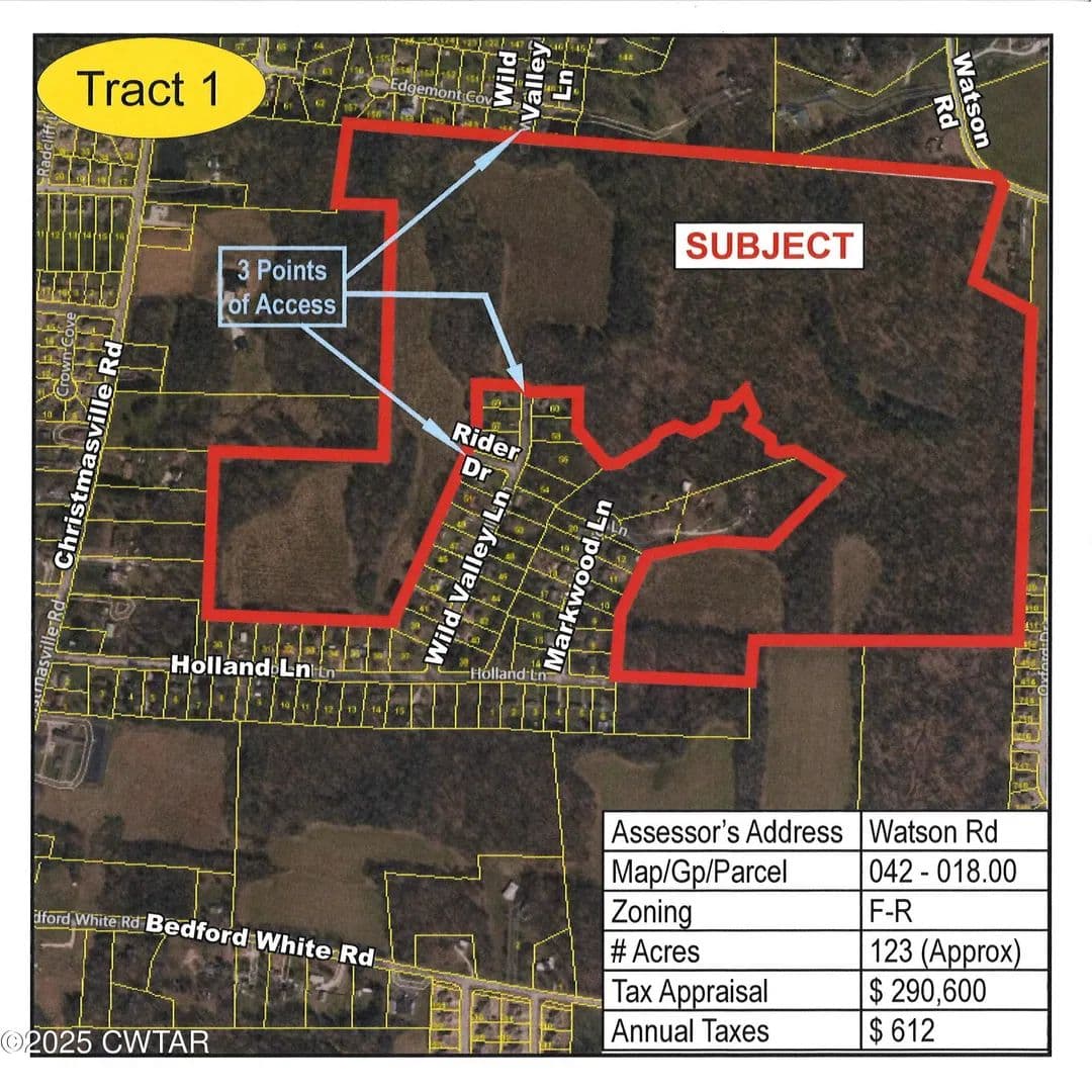 Tax Map 042, Parcel 018.00. Nice 123+/- Acre farm 1.5 Miles north of I-40 off Christmasville Rd. Tract fronts Wild Valley in 2 places + Rider Dr and Watson Rd. Potential galore with 40+/- previously in cultivation, now in pasture, balance in pasture and woods. Would make a great hobby farm with subdivision potential. If this tract is divided into 3 parcels, according to a new Planning Comm. text amendment change, 3 building permits would be available. (Tax Assessor calls for 123 calculated acres, CRS calls for 128 Acres, farm measures 124+ acres on CRS mapping system, Old quit claim deed calls for 98 Acres)