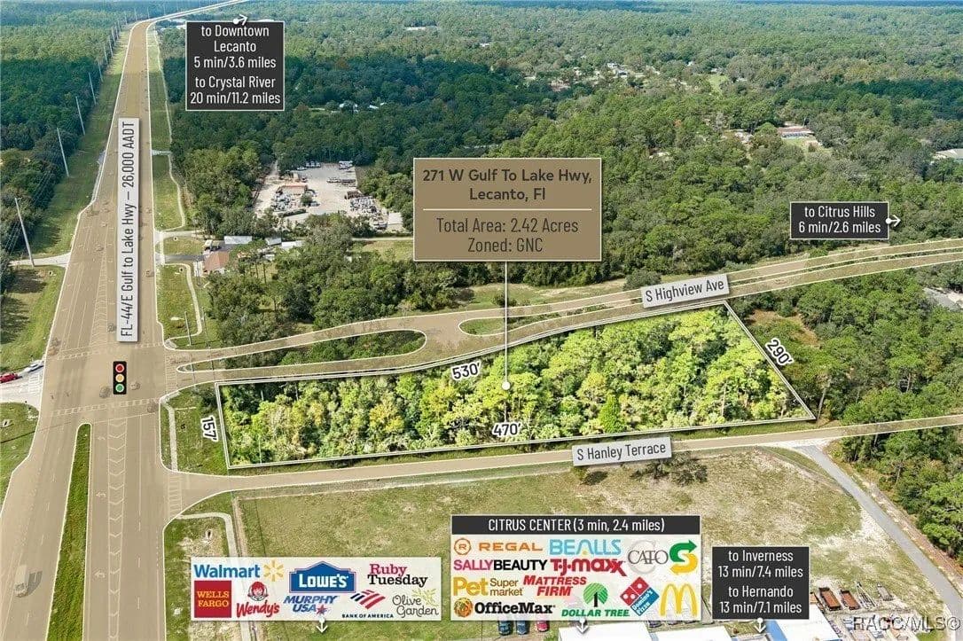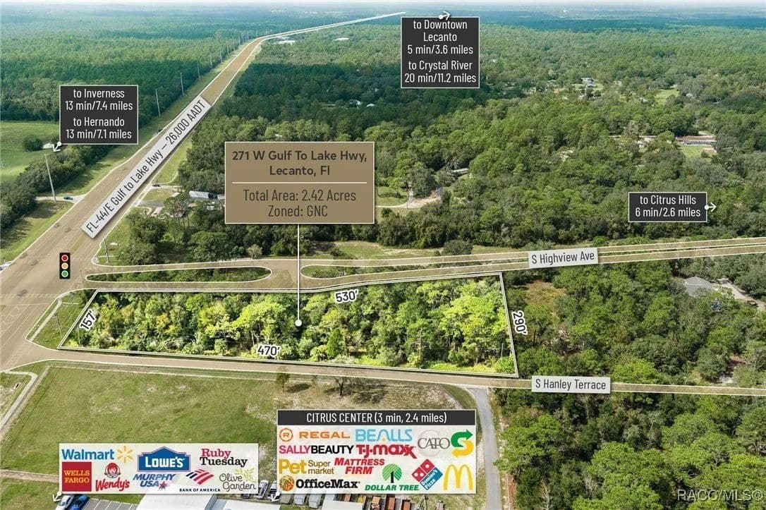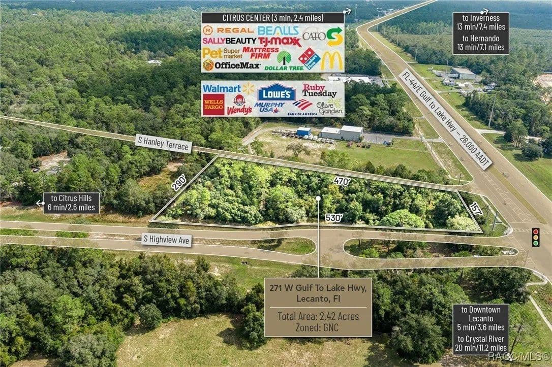 Stop! Don't Miss Out! This signalized double-corner commercial property of 2.42 acres features 163 feet of road frontage on SR44/E Gulf to Lake Hwy (27,900 AADT) and 537 feet on S Highview Avenue. Zoned GNC Commercial, this property permits a variety of commercial uses, including retail, office, restaurants, sit-down, and drive-thru options, among others. Within 5 miles of the property, you'll find a retail hub with Walmart, TJ Maxx, Lowe's, and several restaurants and quick-service options. Located at the entrance of The Villages of Citrus Hills, Pine Ridge, Crystal Oaks, and Black Diamond, the property provides access to flourishing populations in Floral City (7.8 miles), Lecanto (8.8 miles), Beverly Hills (11.5 miles), Crystal River (16.6 miles), and Homosassa (18.8 miles). With the recent expansion of the Suncoast Parkway and future extensions, Citrus County is poised for historic growth in the Tampa MSA. Just a 15-minute drive from the property, an ideal customer base of 46,361 residents-with an average age of 58 and a median household income of $65,000-awaits. Strong market consumer expenditures reveal that 66% of residents dine at restaurants or steakhouses, and 89% frequent fast-food establishments. Additionally, with a median age of 58, the area population has spent over $106 million on health care services. Disclaimer: All information provided herein is for marketing purposes only and is not guaranteed for accuracy. Prospective buyers or tenants are encouraged to conduct their own independent due diligence. The seller, broker, and associated parties make no representations or warranties, expressed or implied, as to the accuracy or completeness of this information. All dimensions, zoning details, financial data, and other property-related facts should be independently verified. Please consult with appropriate licensed professionals before making any investment or purchasing decisions.