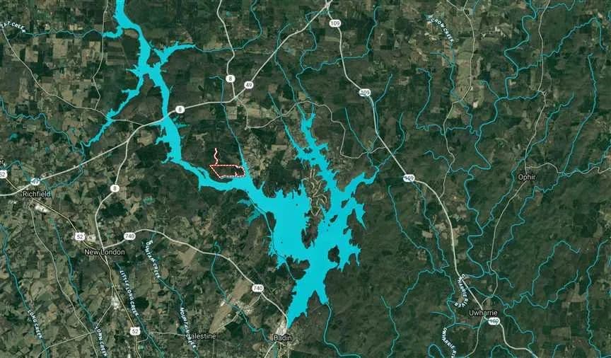 200 acres of pristine, undeveloped, open woods with roughly 1.5 miles of lake water frontage with long views on Badin Lake, New London, North Carolina. Suitable for private estate or subdivision. Deer and turkeys are abundant on this property and it joins US Forest Service lands. It has a fee simple strip of land and a right of way easement to Tuckertown Road. This land is about 40 miles from Charlotte. Call Ted Benbow at 704-902-0121 for a tour.