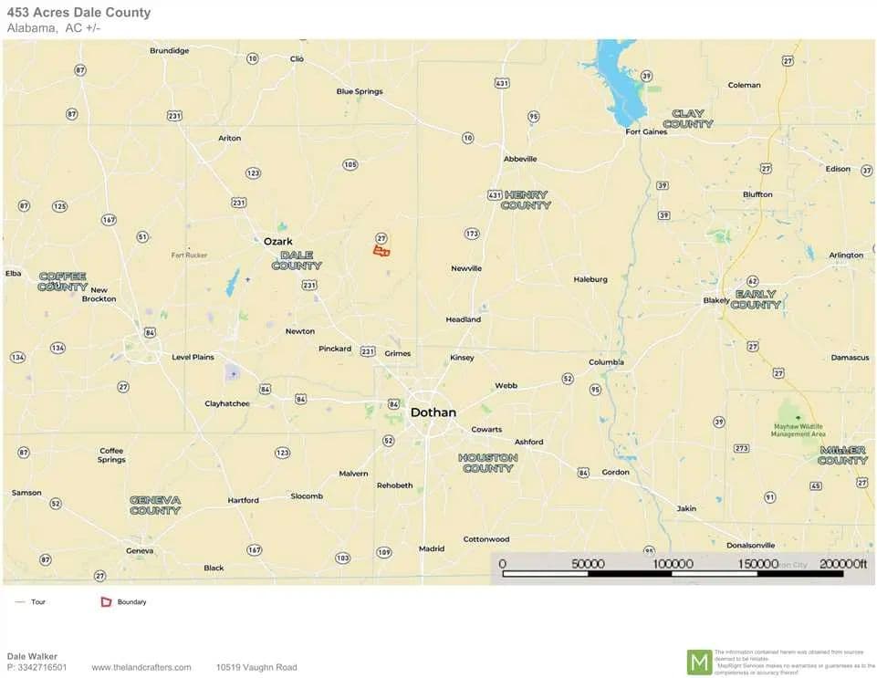 If you are looking for a great hunting tract that also has the potential to produce income, look no further than this 453 Acres in Dale County. Only 30 minutes from Dothan one can be in town in no time but also have peace and quiet. Featuring around 70 acres of prime row crop land one has the option to plant it yourself or lease it out to a local farmer. This part of the country is know for being prime cotton and peanut farming. This tract has been well managed for timber and was recently thinned, so you can expect for the standing timber to have quite a boost in growth in the next several years. The pines are various ages with most being in the 15-16 years with some being 20+. There are also several areas of beautiful 50 year old hard woods in both the bottoms and on top of several of the ridges. The road system on this property is tremendous allowing easy access to the entire property. There are several large open areas that would make great green fields as well as a natural pond that provides waterfowl opportunities.